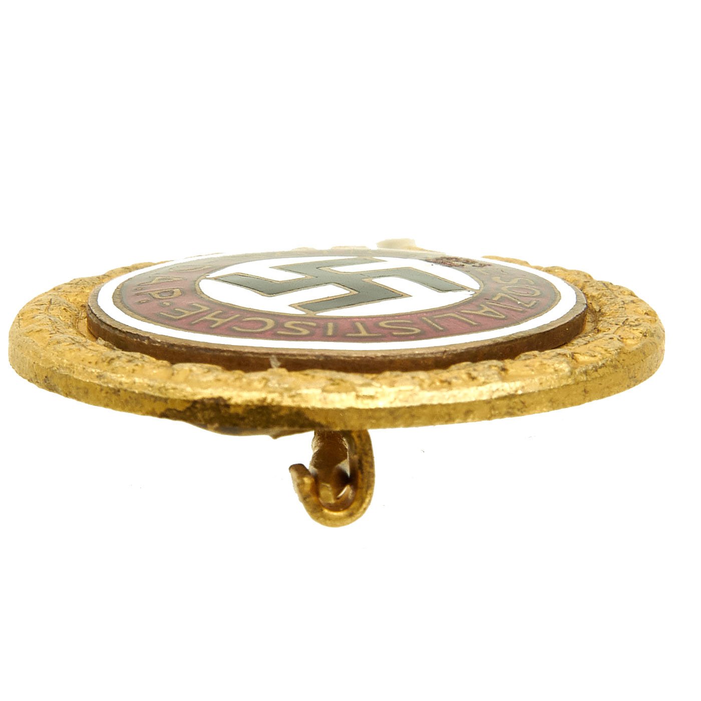 This example is a classic example of the Golden membership badge, awarded to only around 24,000 people total. It is overall 30.5mm (1.25in.) in diameter, inset with a 24mm (0.945in) die struck alloy NSDAP membership badge with multi-colored enamel work. The badge features a translucent red, circular outer border with embossed golden script, NATIONAL-SOZIALSTISCHE-D.A.P.. This encompasses a white enamel field with canted black enamel Swas (swas). Condition of the membership badge is very good to excellent, with minimal wear, and lots of the original gold finish present. The enamel has minimal wear, and the award simply looks great.