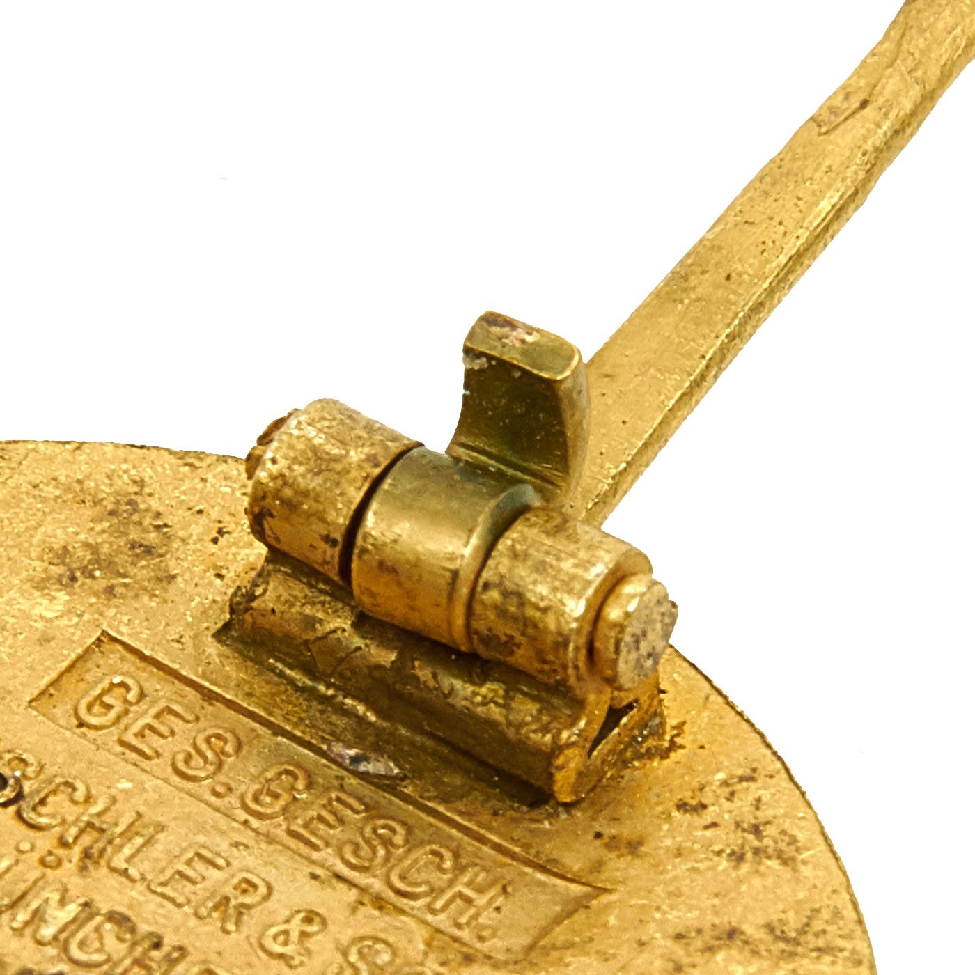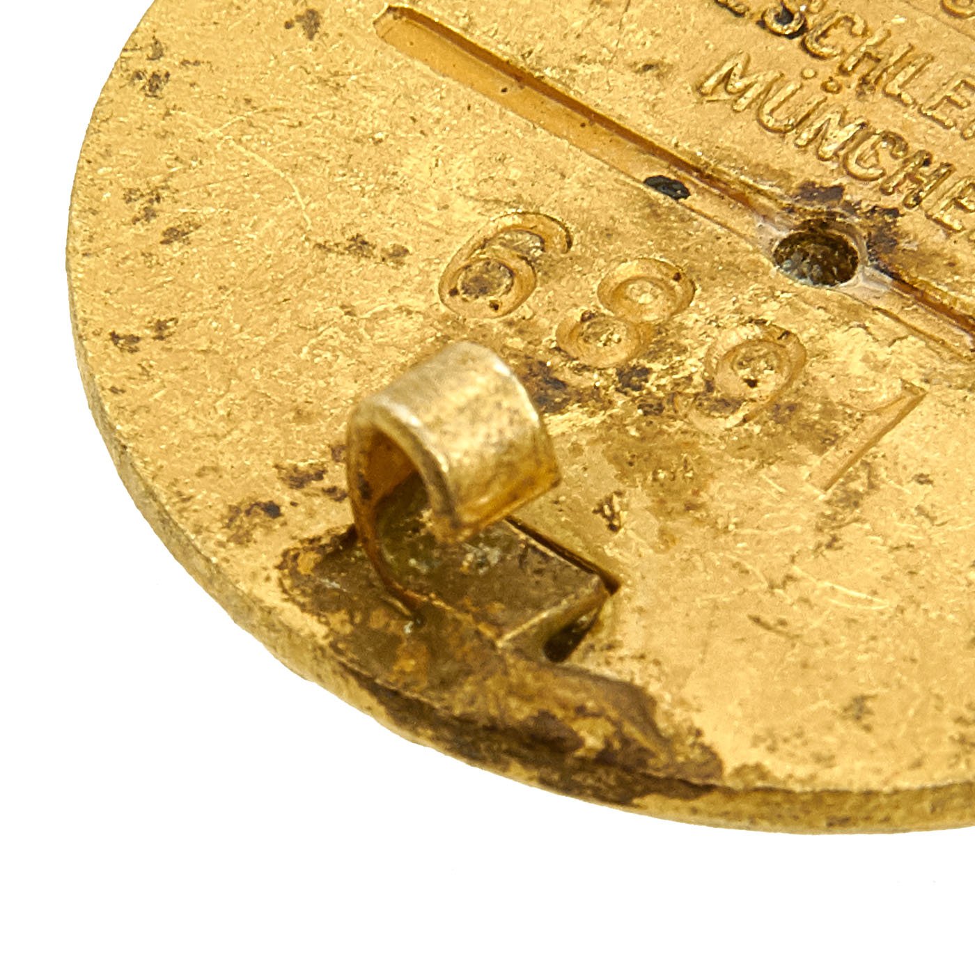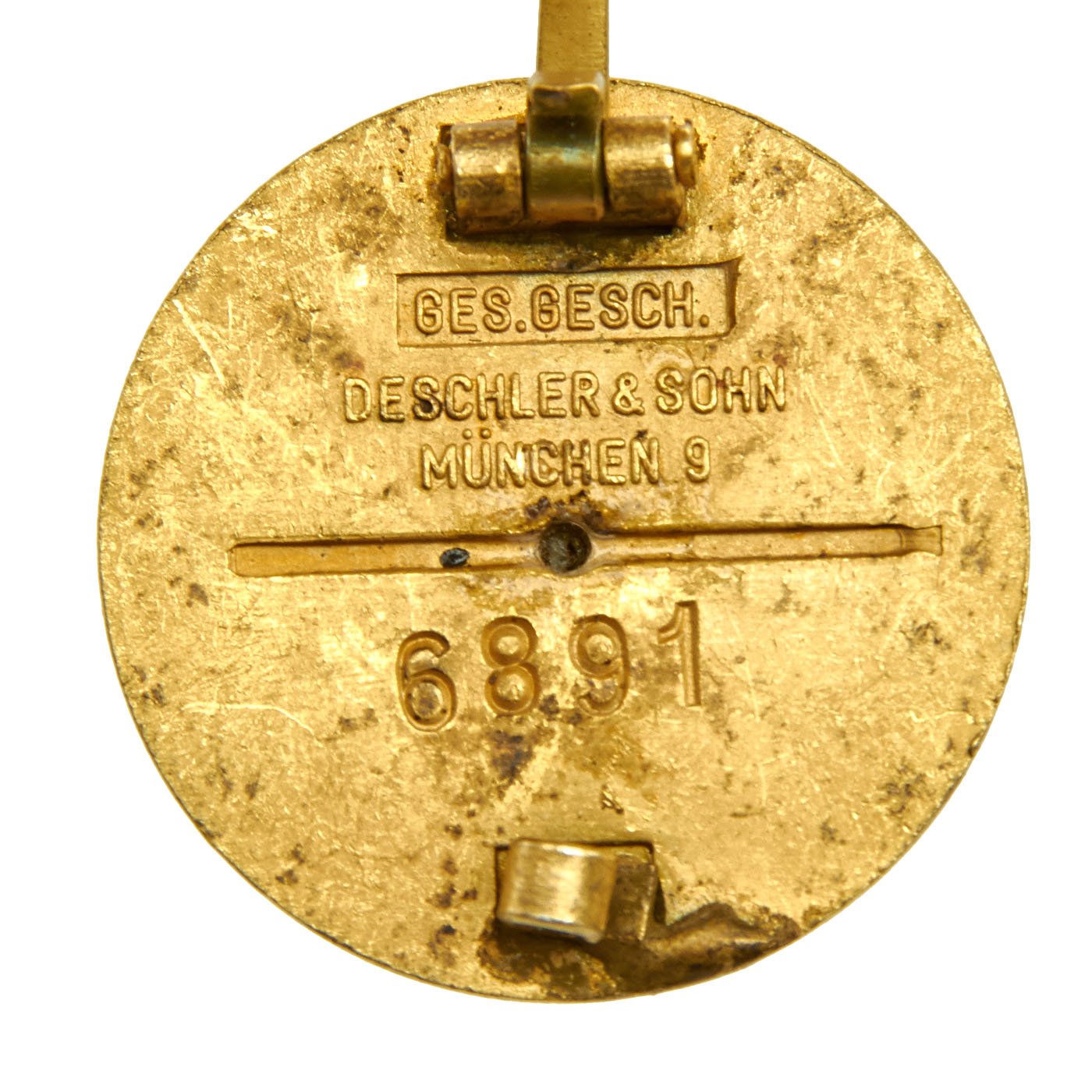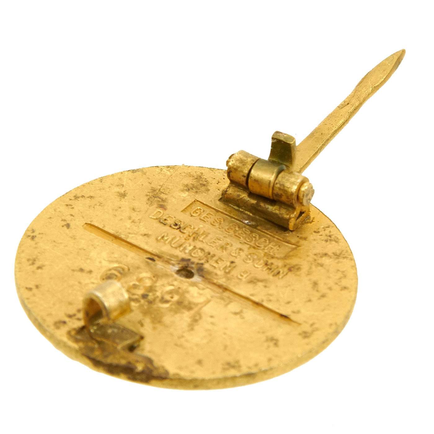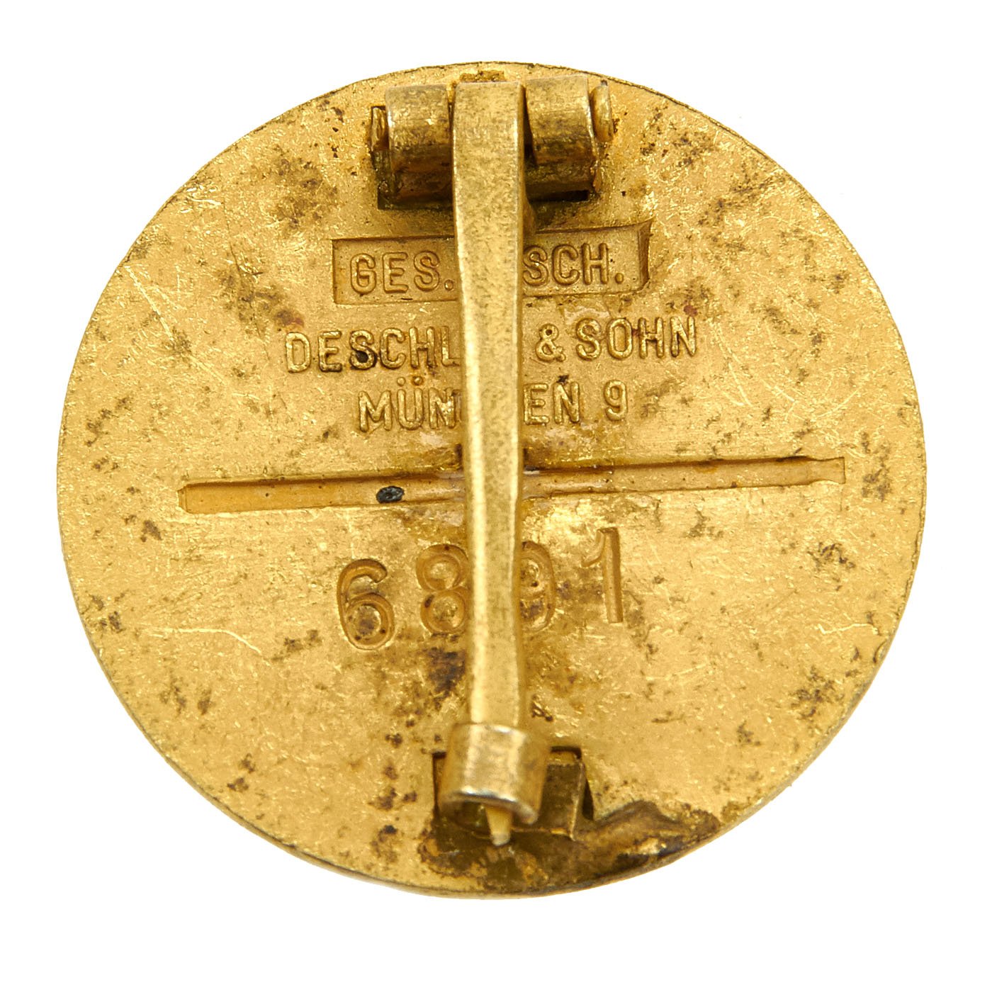 The "GES. GESCH." is short for Gesetzlich Geschützt (Protected By Law), indicating that the pin was a trademarked design. Deschler & Sohn of Munich looks to be the firm that made the majority of these pins, and they made them with both vertical pinback and horizontal "safety pin" style attachments. This example was awarded to party member 6891, whom we have not been able to identify.