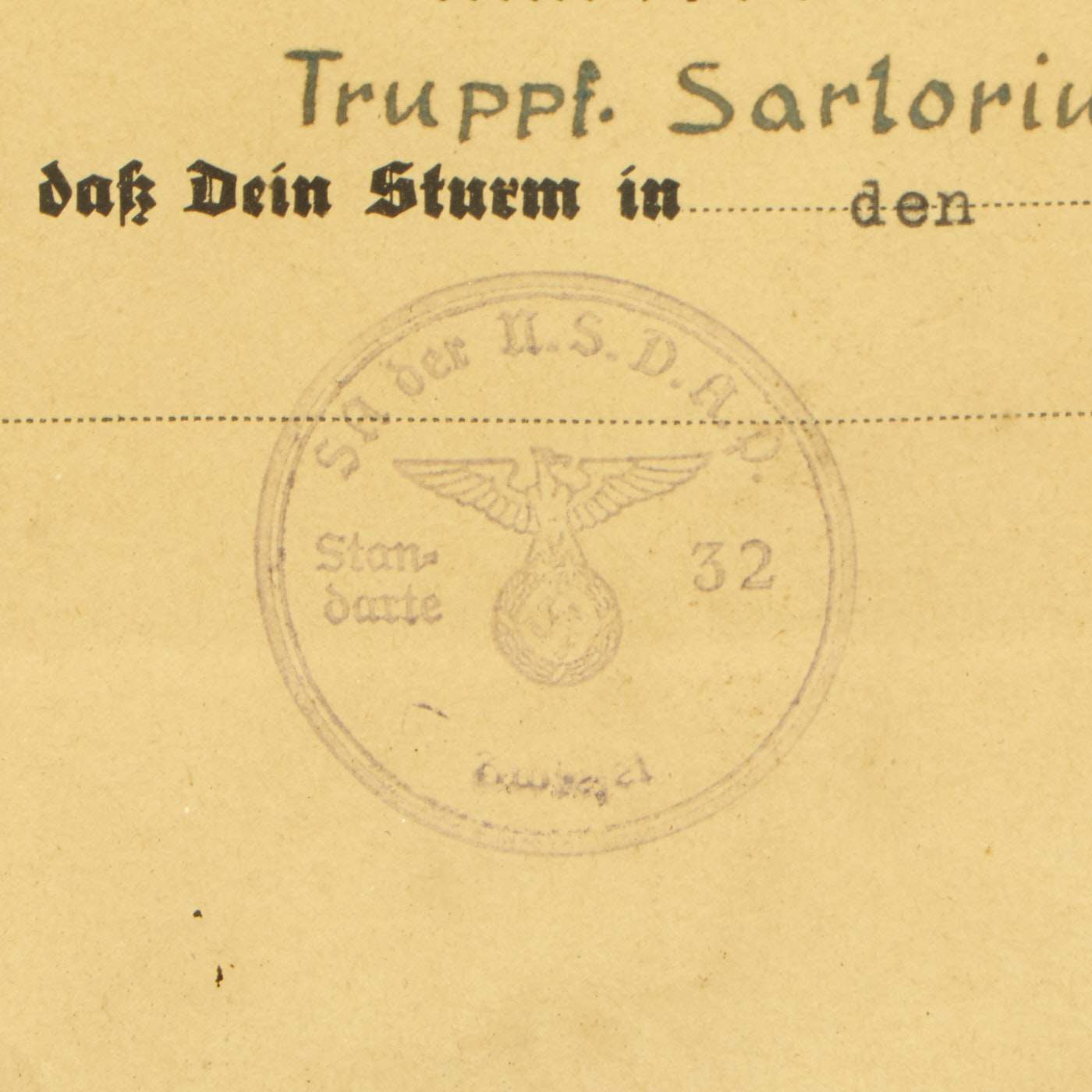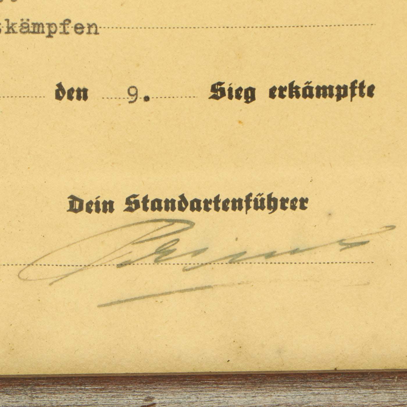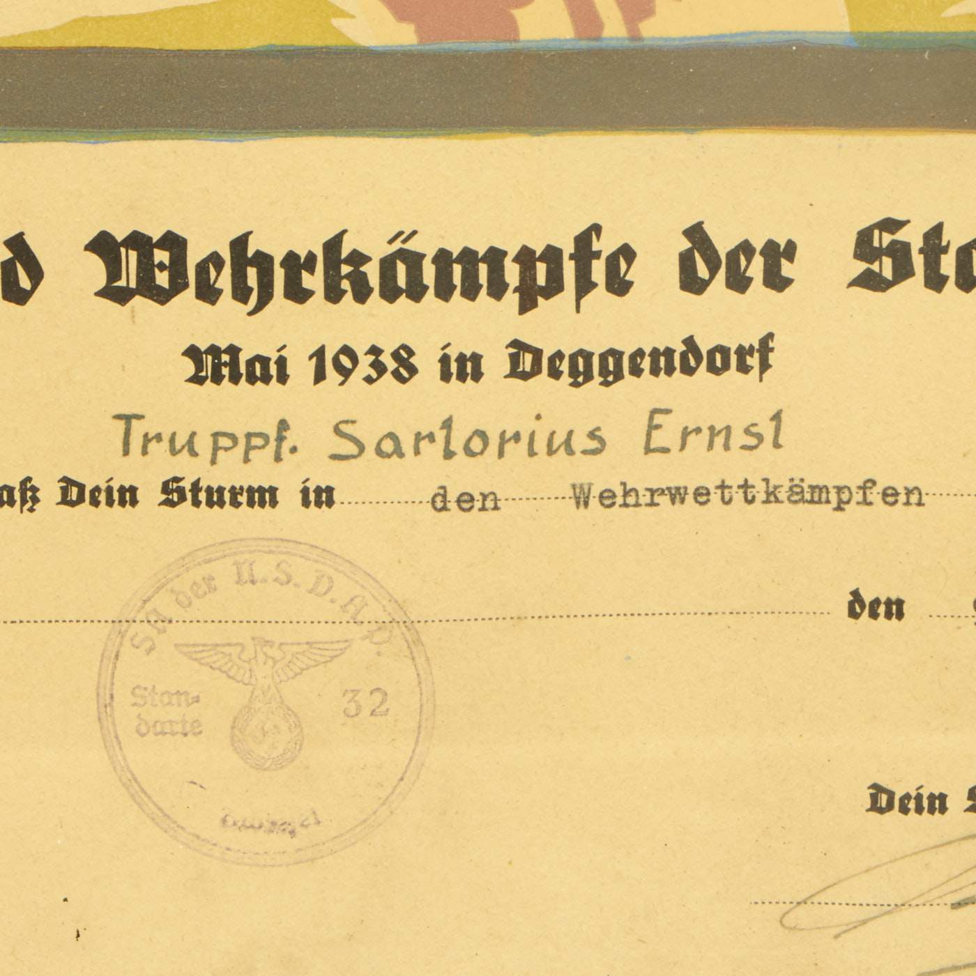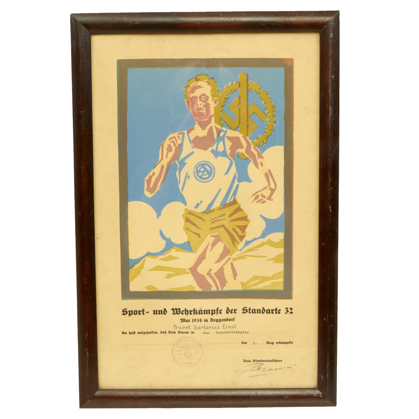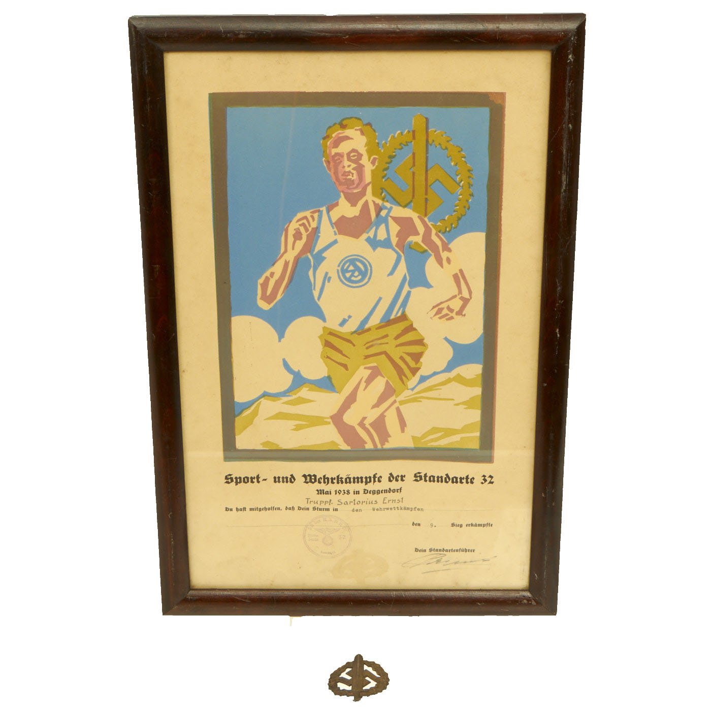 From what we can tell, the badge was awarded to Truppf. Sarlorius Ernsl, for a competition held during Mai 1938 in Deggendorf. "Truppf." is short for Truppführer (Troop Leader), a NSDAP Paramilitary rank. It has all the proper stamps and signatures, and is nicely framed, measuring about 18" x 12".
