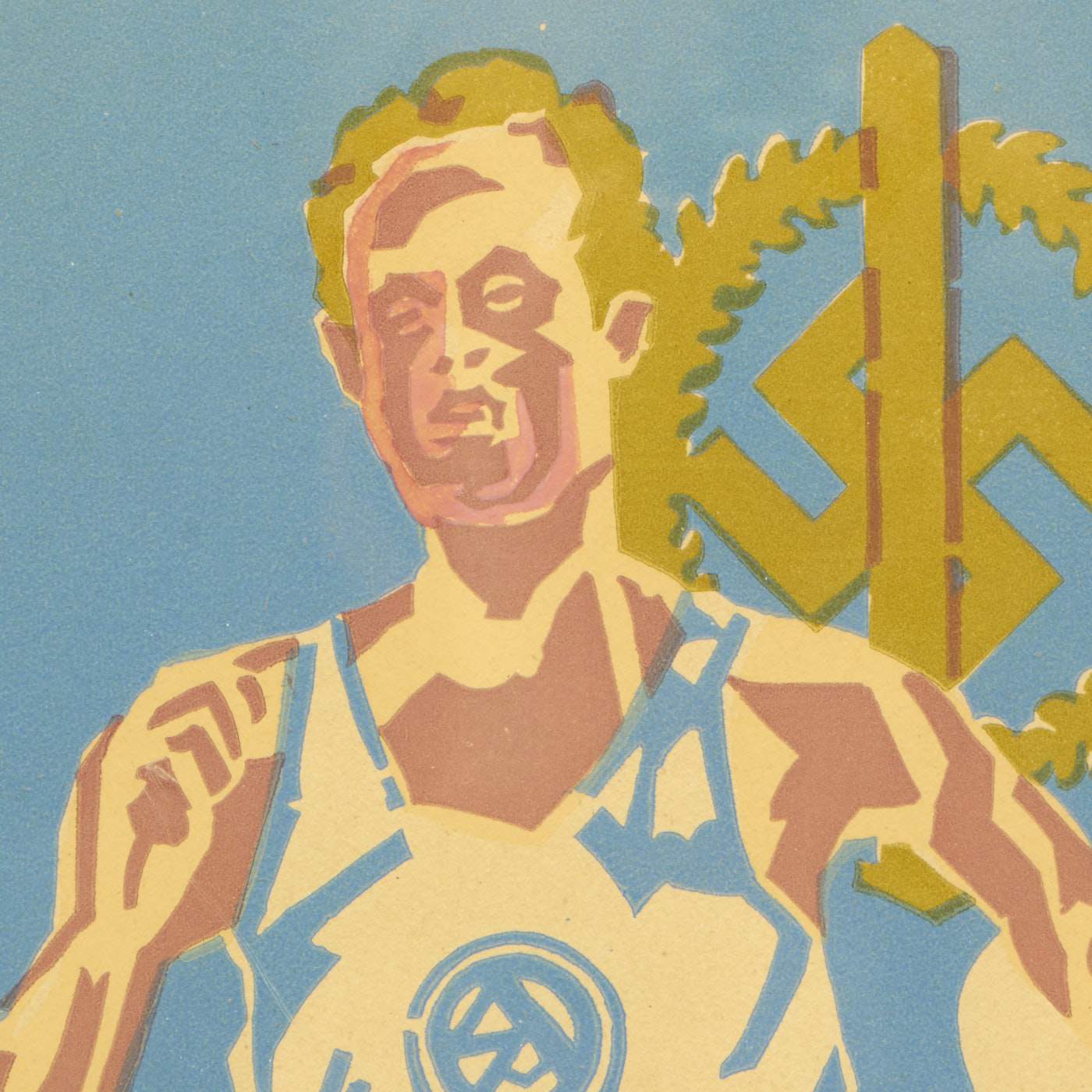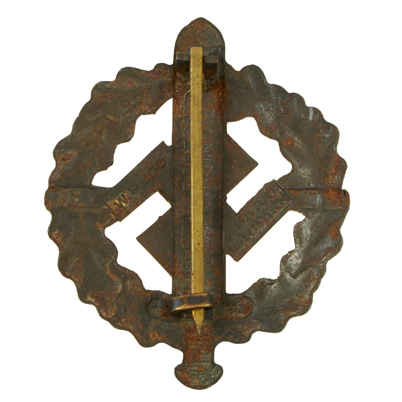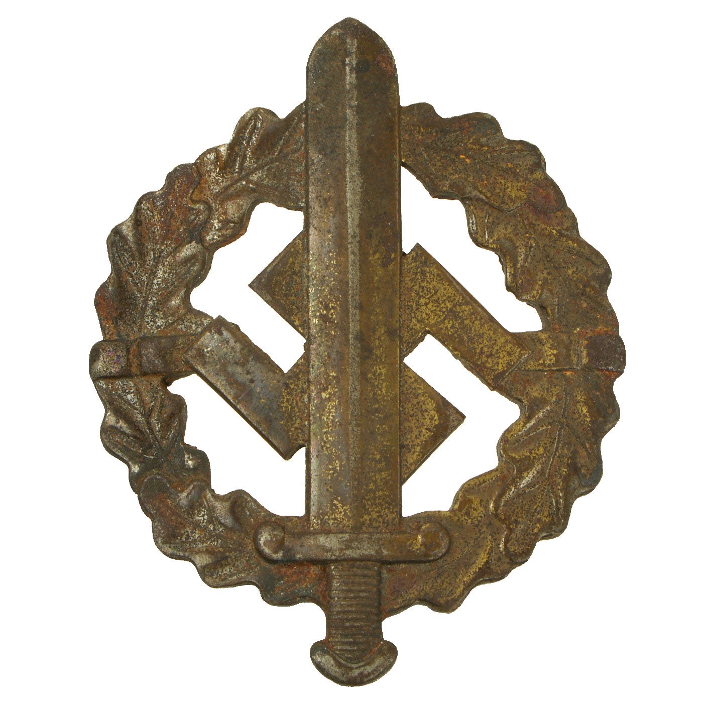 The SA Sports Badge was a decoration of NSDAP Germany that was issued between the years 1933 and 1945. It was a political version of the much more generic German Sports Badge, which was also issued in great numbers by the NSDAPs. At its center was a 57mm high Roman broad sword, superimposed over a NSDAP swas. It was encircled by an wreath of oak leaves. It was a pin-back badge. There was a cloth version, as well.
