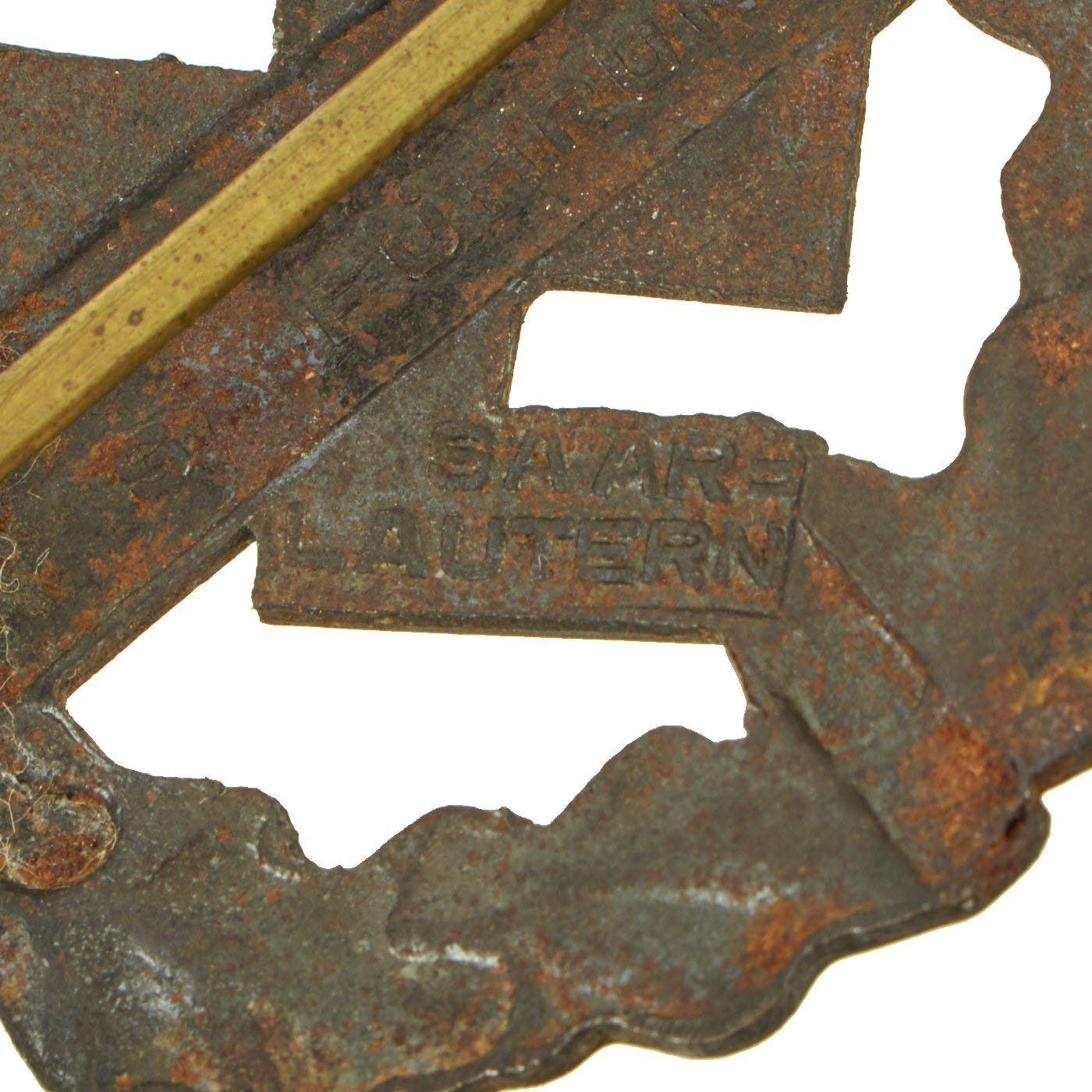 The badge itself looks to be manufactured from stamped steel, which is magnetic, and was then covered with a gold wash, which may be ;bronze powder paint. It is maker marked on the back by W. REDO / SAARLAUTERN on the arms of the swas (hook cross). Werner Redo is a known manufacturer of this badge, located in Saarlautern, on the border with France. Today the town is known by its Pre NSDAP rule name, Saarlouis, the name it has born for centuries.