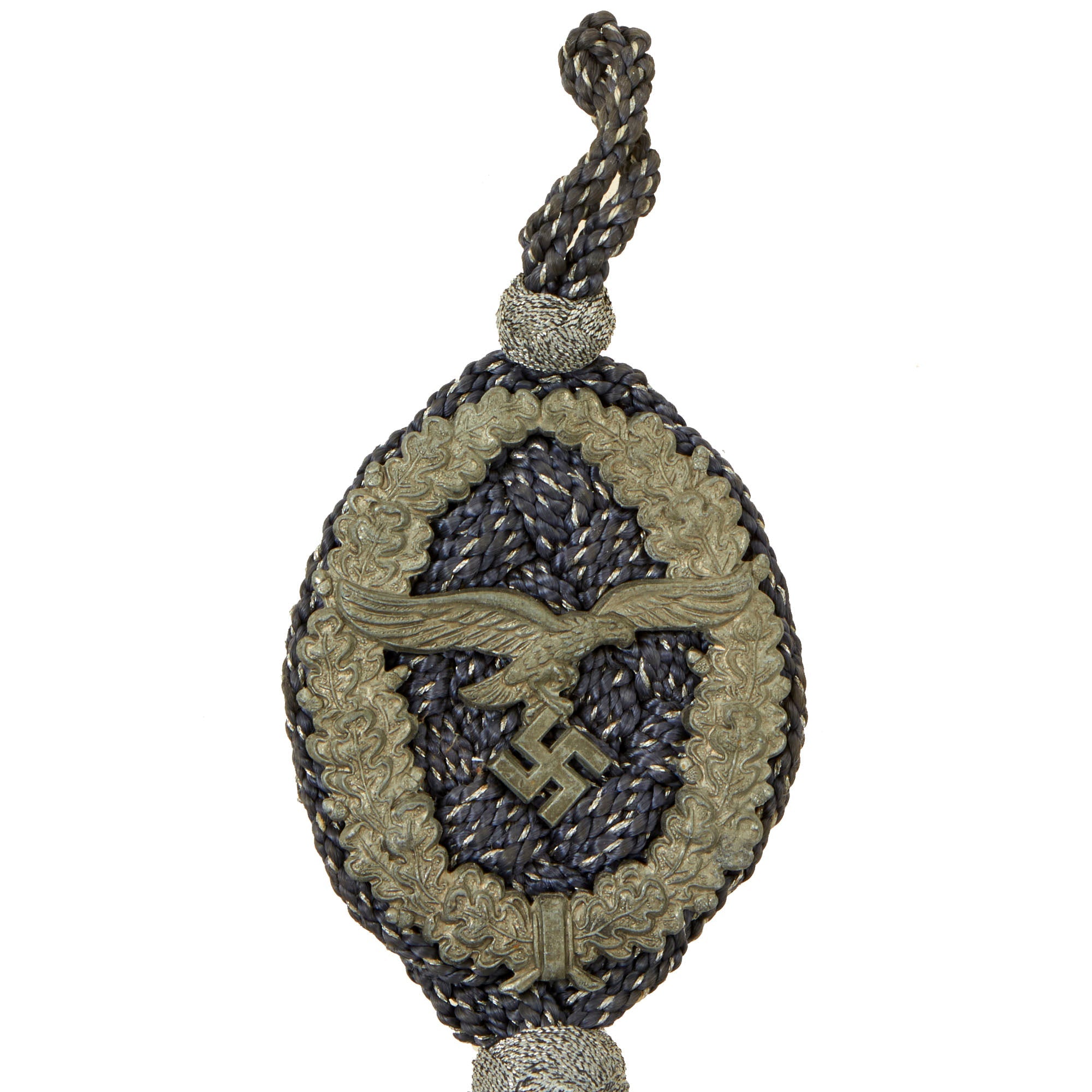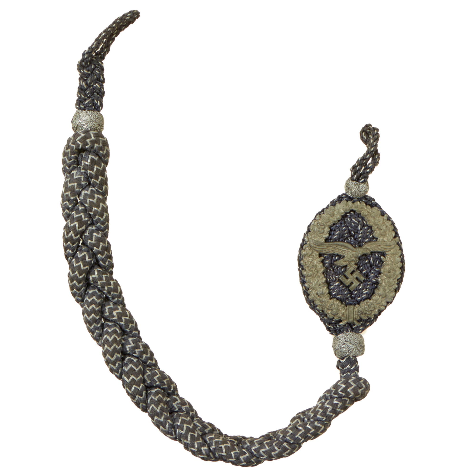 - Luftwaffe Air Force - The lanyard is made from Luftwaffe blue gray cord, which has bullion threads woven into the design. The badge is an oak leaf wreath with a Luftwaffe Eagle in the center.