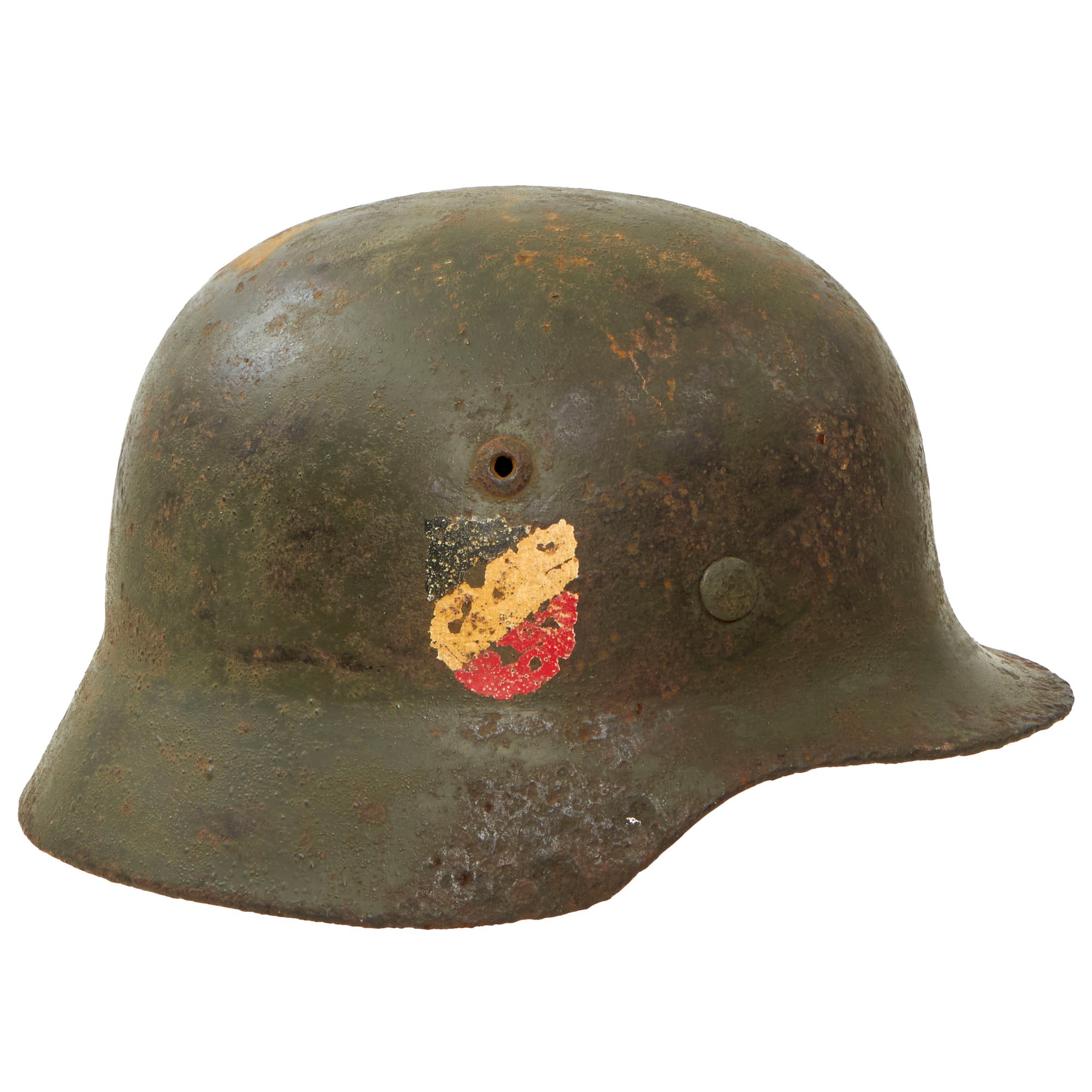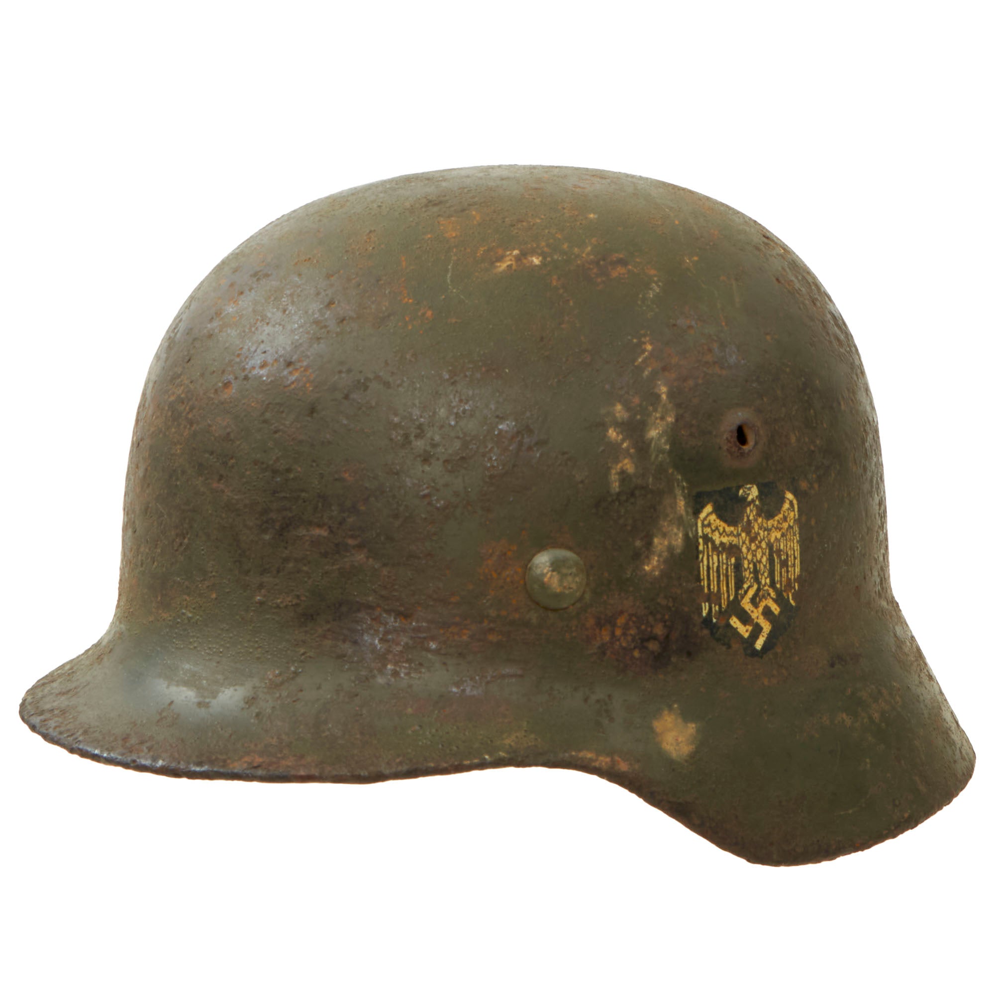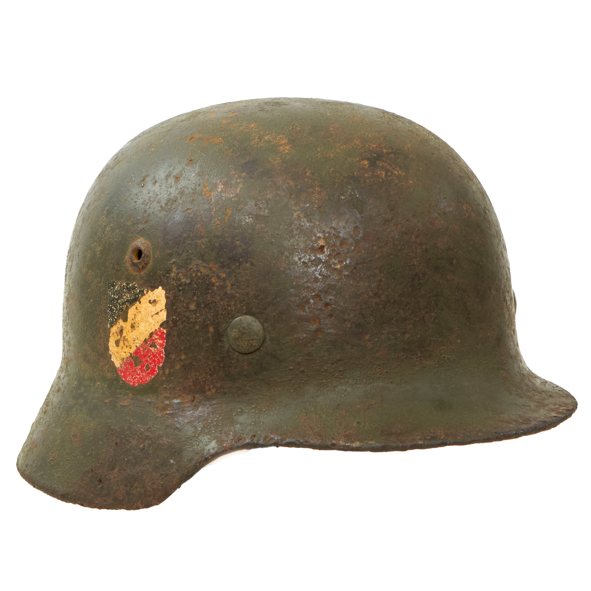 Original Item: Only One Available. This is a great "ground dug" example of a German WWII M35 helmet, as issued to the Heer (Army), with very desirable "Double Decals" and some other interesting features. This stamped sheet steel construction helmet was originally produced with early war smooth Apfel-grün (apple green) paint, and then fitted with Heer "Double Decals", a Heer (army) eagle over the left ear, and the German Tri-color "National Colors" decal, over the right ear.