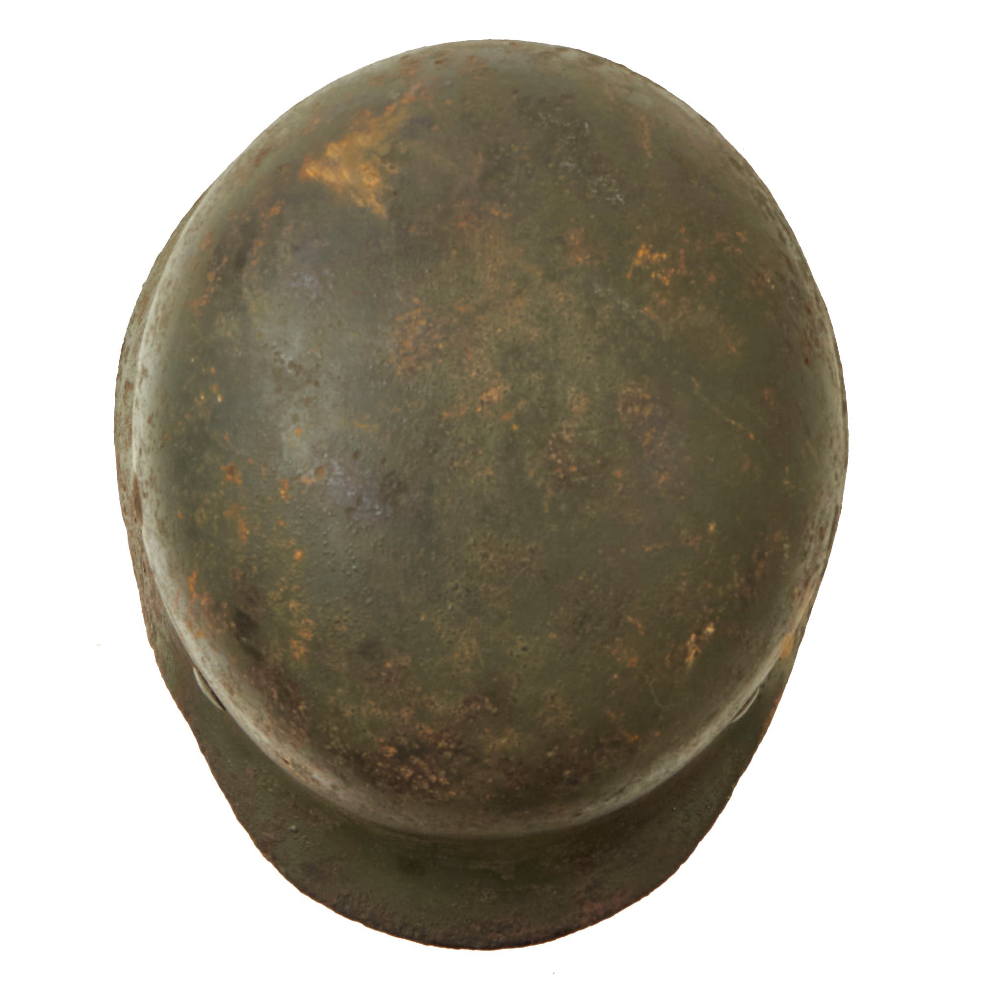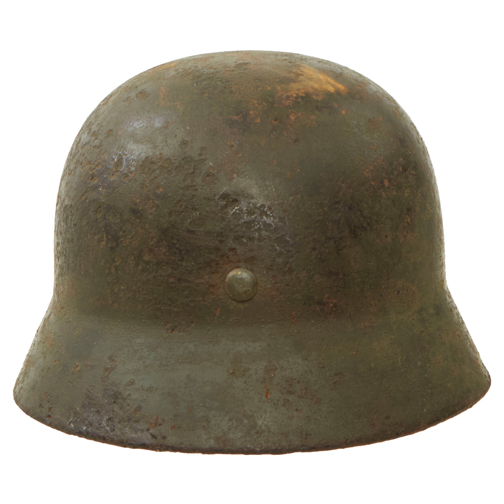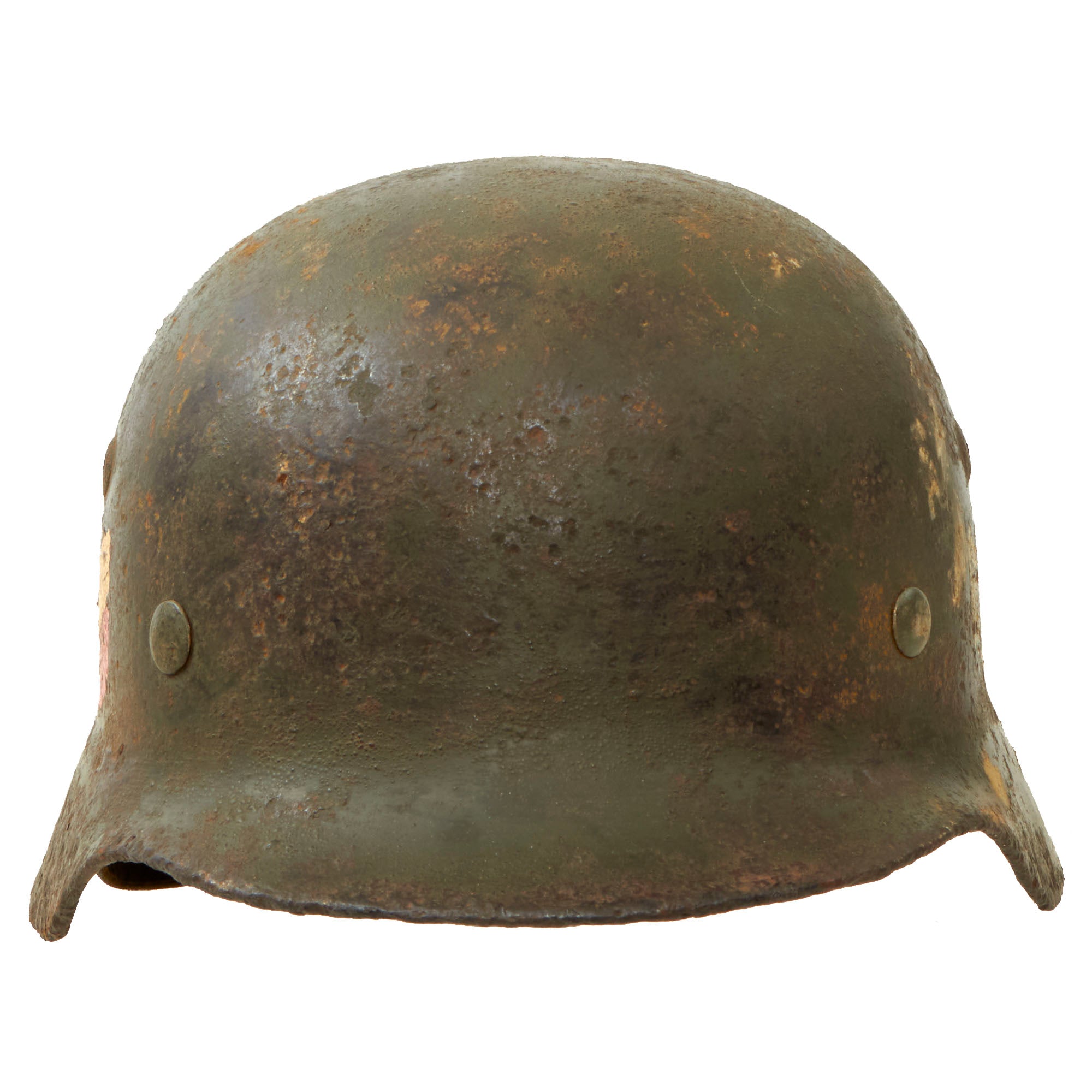 Original Item: Only One Available. This is a great "ground dug" example of a German WWII M35 helmet, as issued to the Heer (Army), with very desirable "Double Decals" and some other interesting features. This stamped sheet steel construction helmet was originally produced with early war smooth Apfel-grün (apple green) paint, and then fitted with Heer "Double Decals", a Heer (army) eagle over the left ear, and the German Tri-color "National Colors" decal, over the right ear.