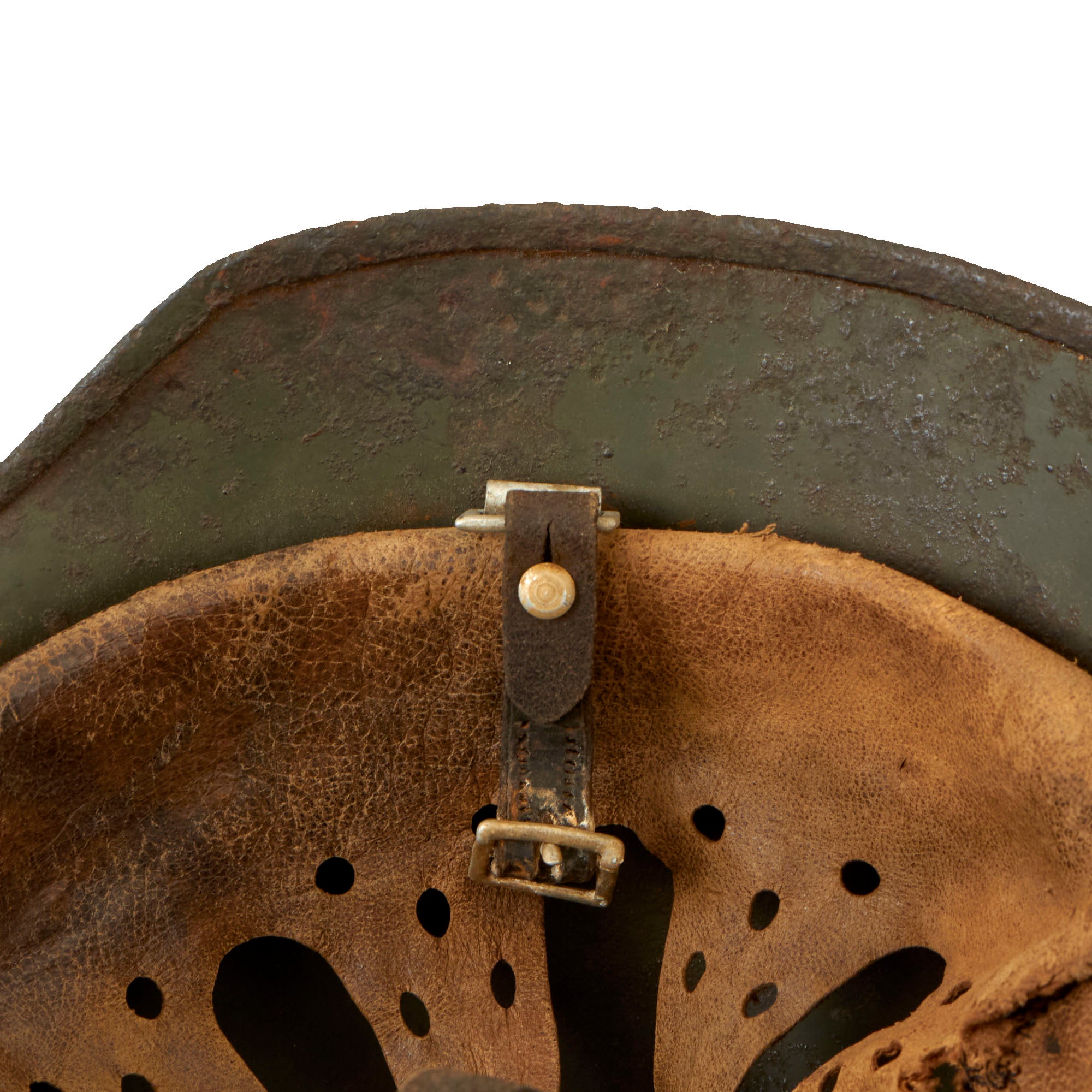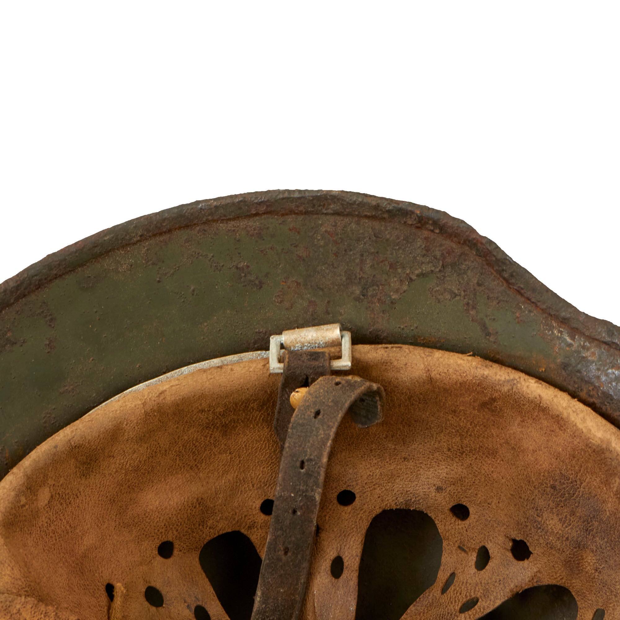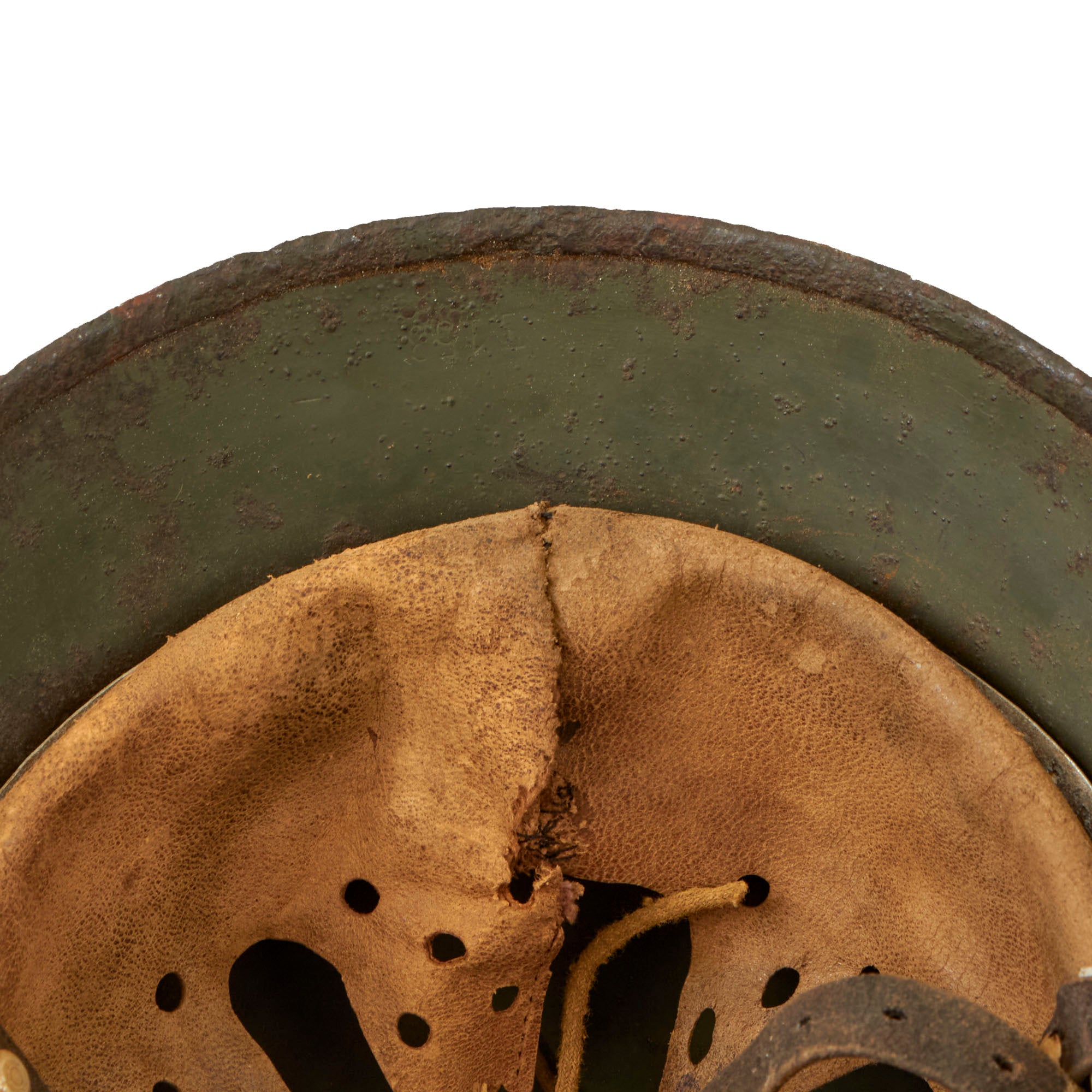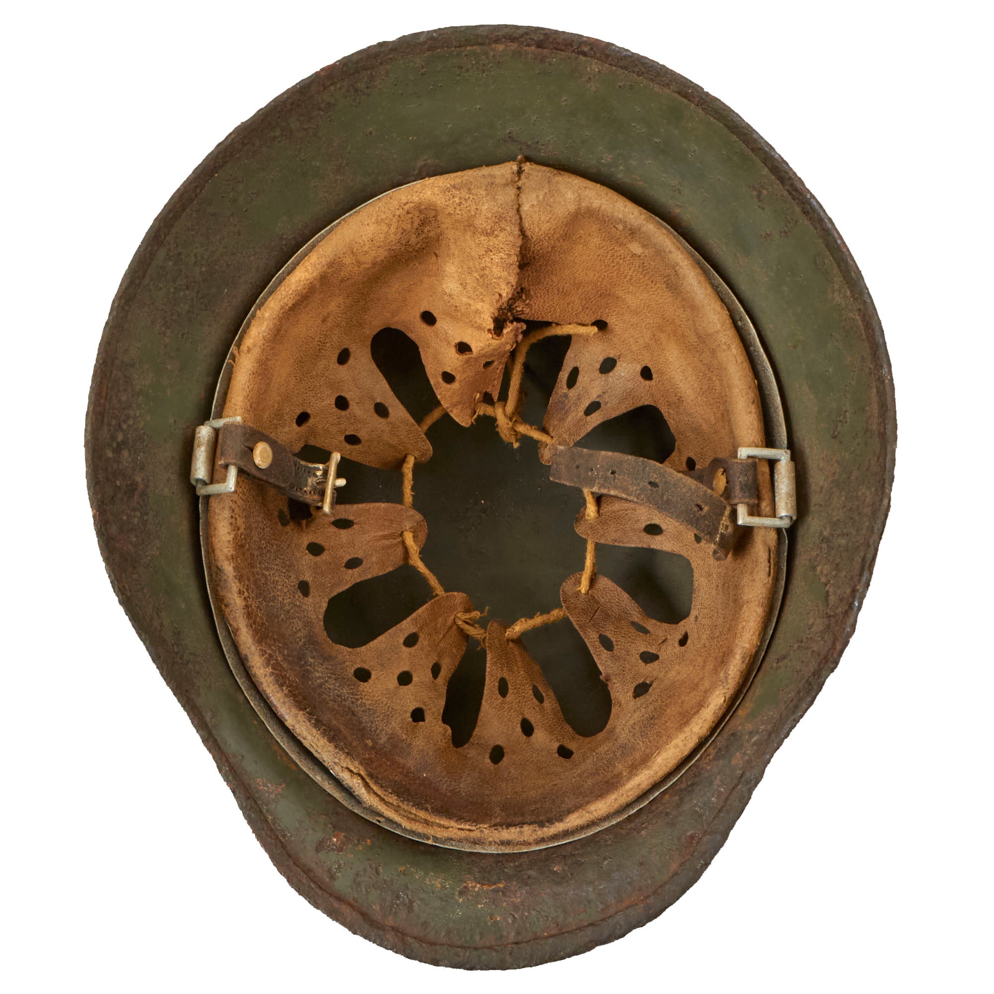 All three of the original liner split pins are present, and actually still retain a good amount of the original paint. The interior of the helmet still has the original M31 leather liner with all eight of its fingers intact, though the top securing strap is a replacement. The leather is still relatively supple, but definitely shows that it saw a good amount of service, so it was definitely chosen to match the condition of the shell. The liner band is aluminum and of the earliest pattern, with square aluminum chin strap loops attached without any side reinforcements. Later Pre-war examples would have a double layer of aluminum on the side to prevent bending. The left exterior of the liner band is marked 62 n.A / 55, indicating that it is a size 55 liner for a size 62 shell.