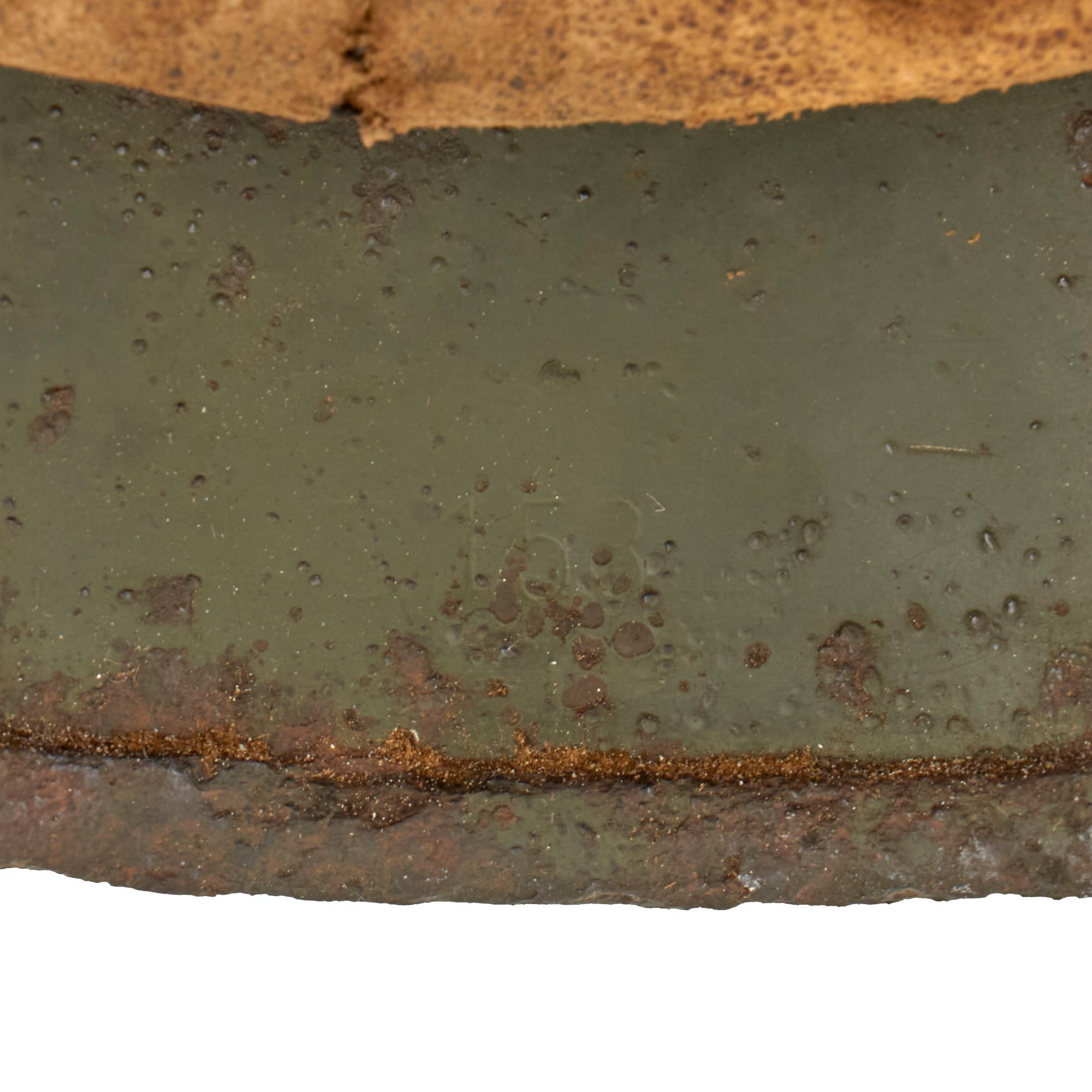 At some point after that, it was dropped on the ground, or possibly lost in a fox hole, and was left to the elements for some time, possibly covered with dirt. In spite of this, it still retains a lot of the original paint on the interior and exterior, interspersed with areas where it eroded while lying in the field or under ground, allowing rust pitting to occur. This is particularly evident on the interior skirt and on the exterior rear "dome". The leather and felt portions of the liner, as well as the chinstrap, would have completely rotted away.