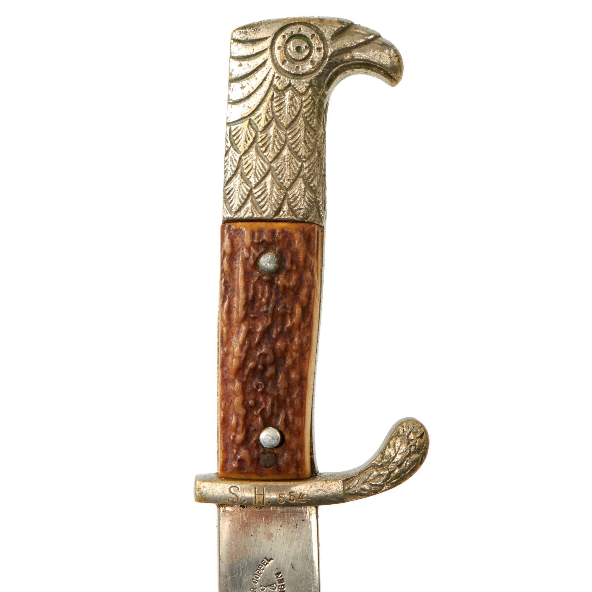 This indicates issue to the Metropolitan Schutzpolizei (Protection Police) of the Hamburg district, Officer 554. The same unit marking is stamped onto the back of the scabbard, though it is partly worn away.