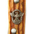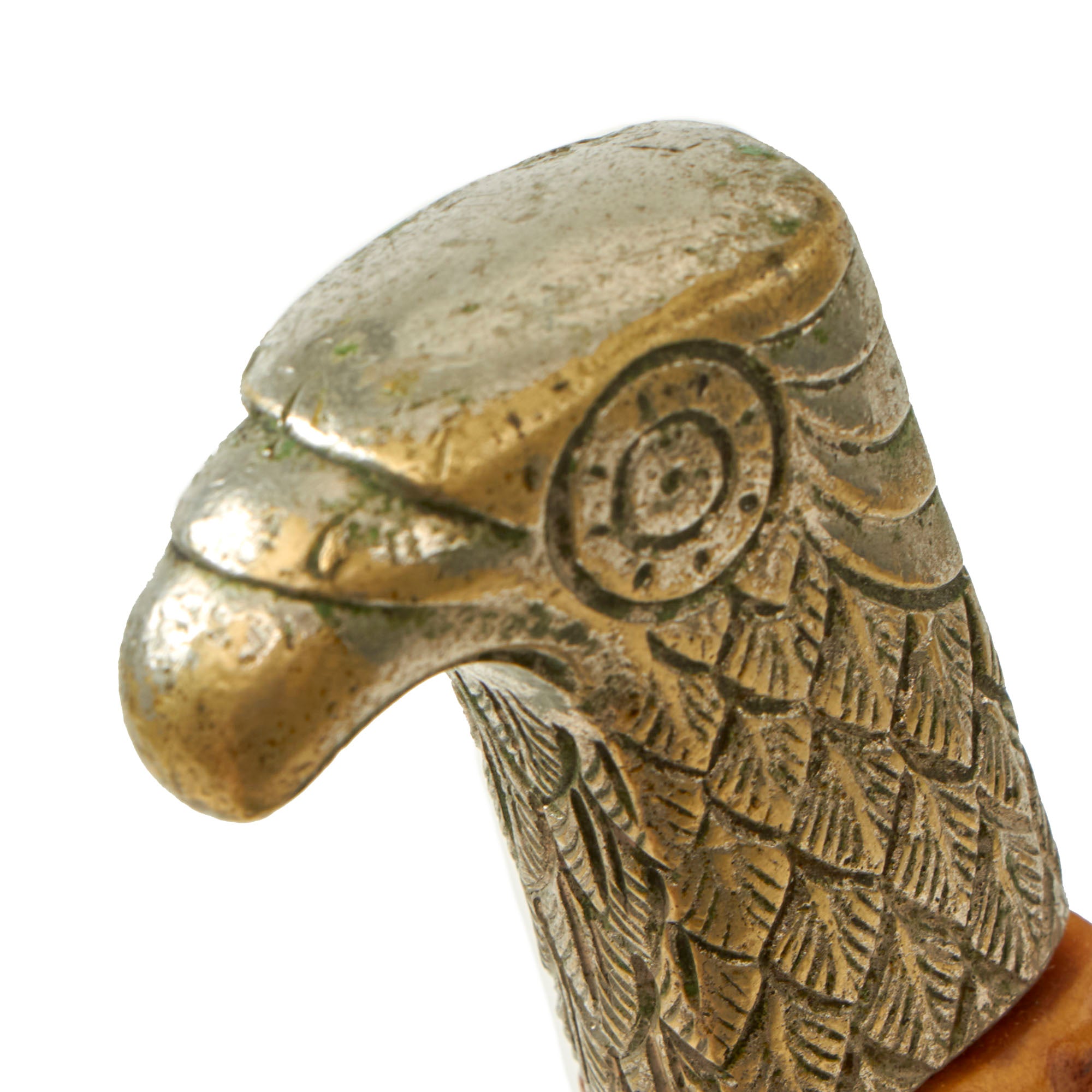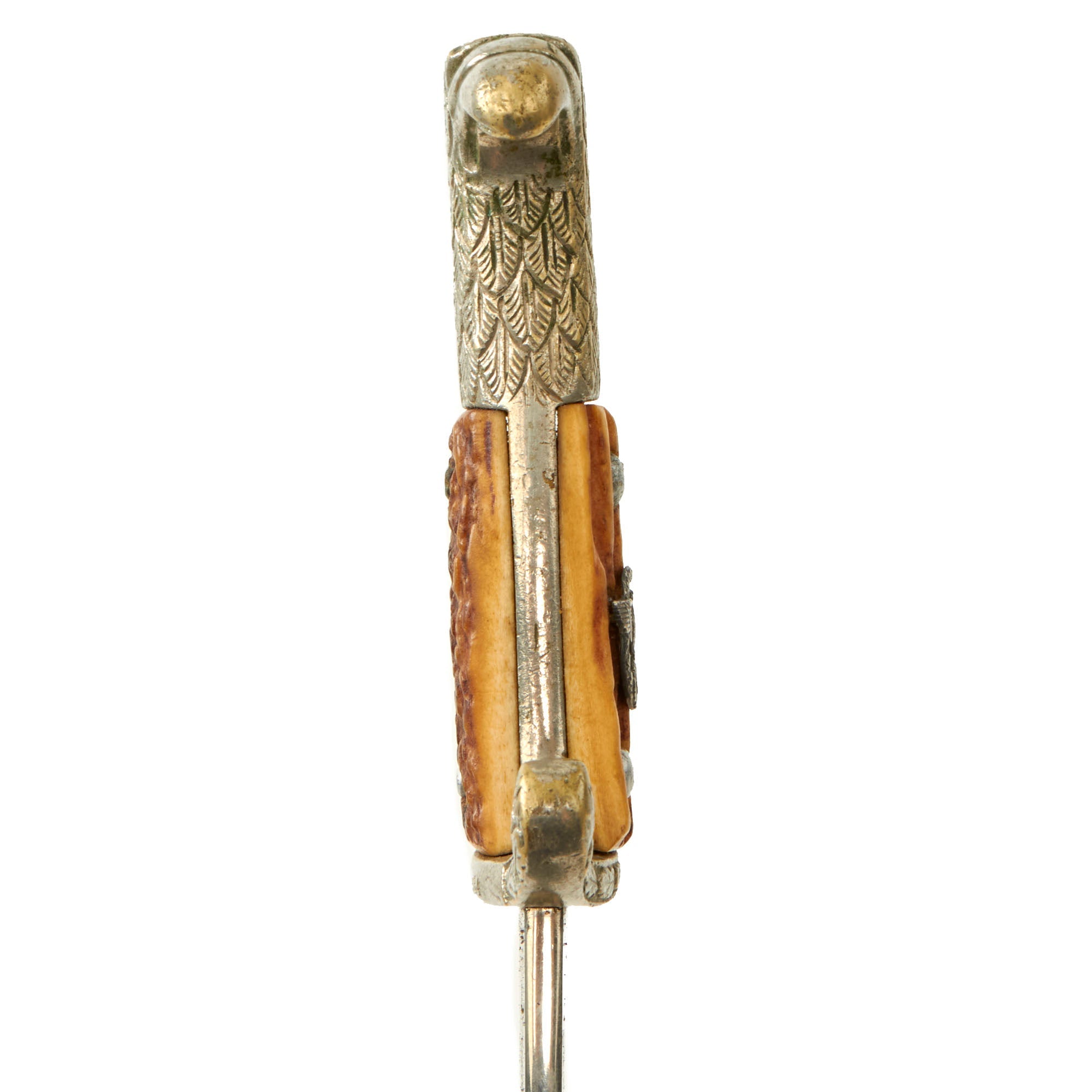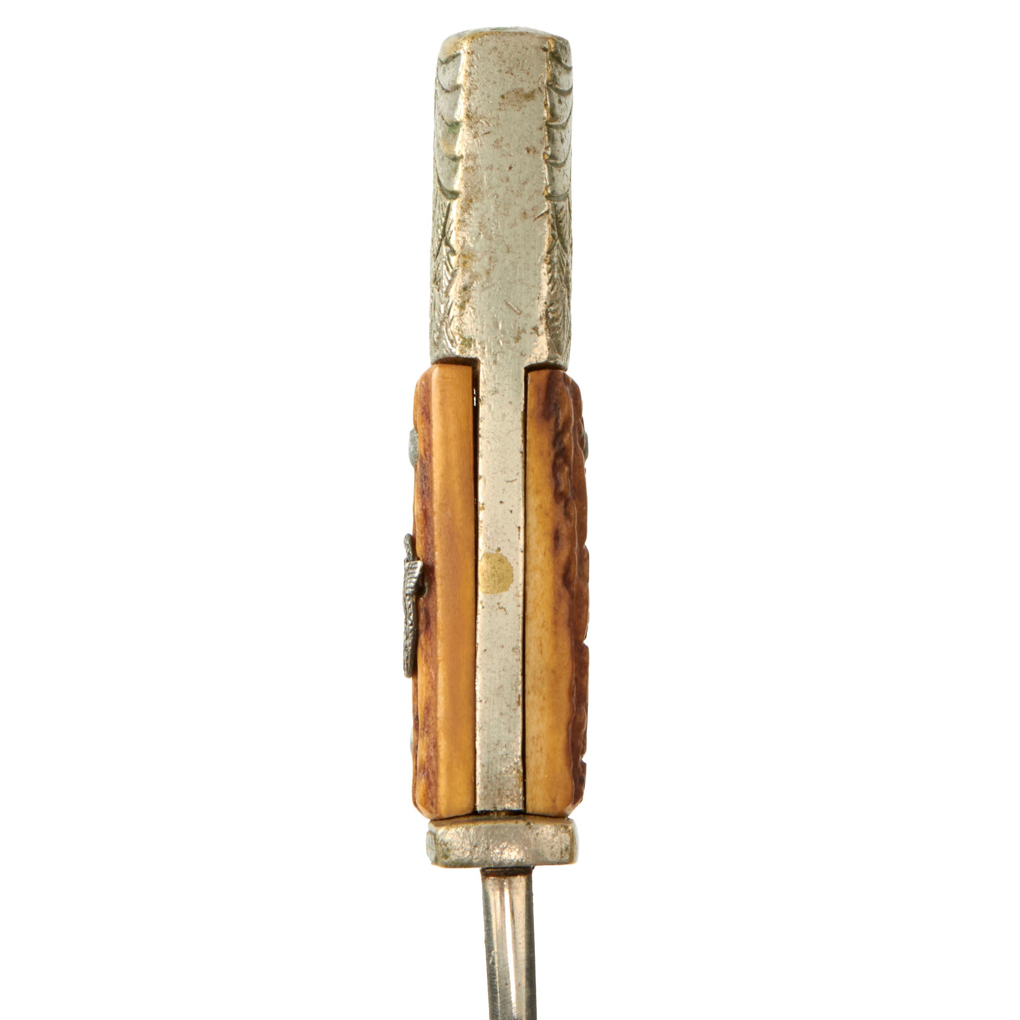 The handle of the bayonet is lovely nickel plated brass alloy, featuring a lovely decorated "Birds Head" pommel without a bayonet slot, and an upswept cross guard decorated with oak leaves. The grip scales are made of beautiful stag horn with a plated alloy police insignia firmly attached on one side. These are held with solid aluminum rivets and show no wiggle at all. Both cross guard and eagle’s head are in very good condition, with most of the original nickel plating still intact, showing wear and light oxidation where the plating has worn away on the ends of the pommel and guard.