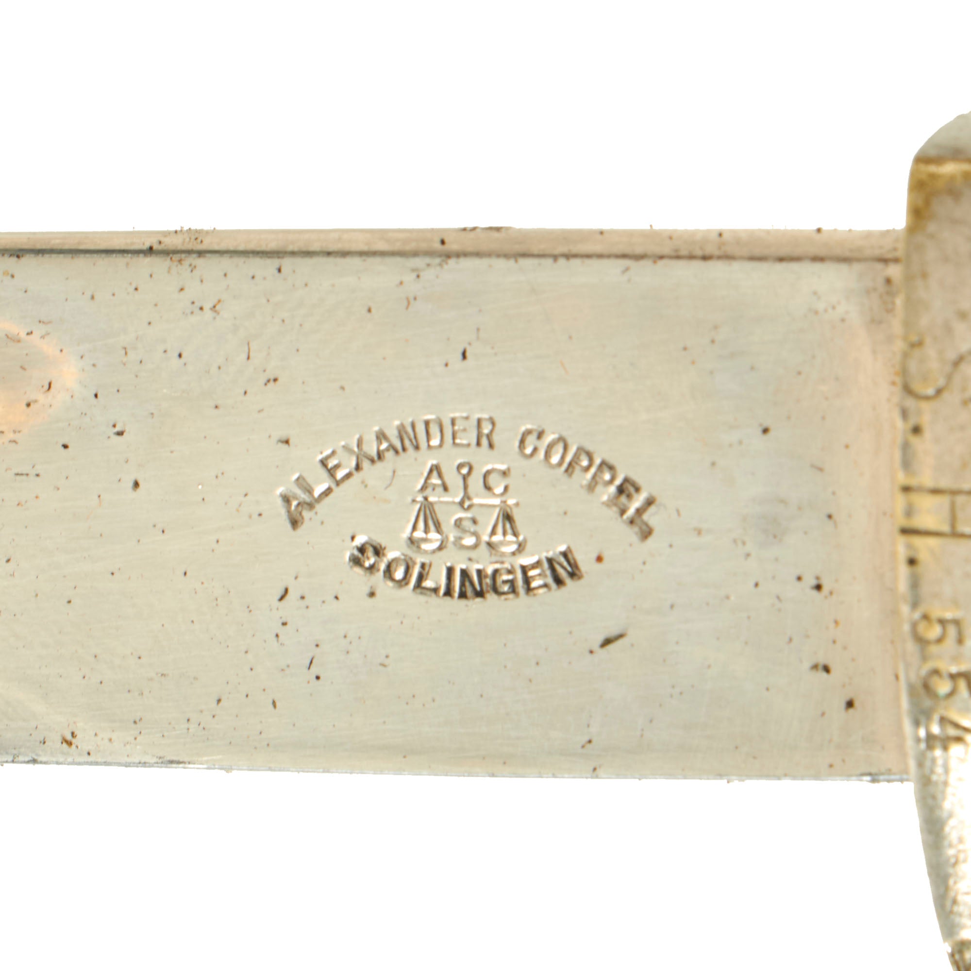 The blade ricasso is maker marked ALEXANDER COPPEL / SOLINGEN in arcs surrounding the firms trademark scales logo, with the firm's initials ACS interspersed. The same trademark scale logo, only larger, is present on the other side of the blade. This type of trademark was used on Police and other dress bayonets during the Weimar republic and up into the beginning of the NSDAP era, up until around 1940, per J. Anthony Carter's work GERMAN KNIFE AND SWORD MAKERS.