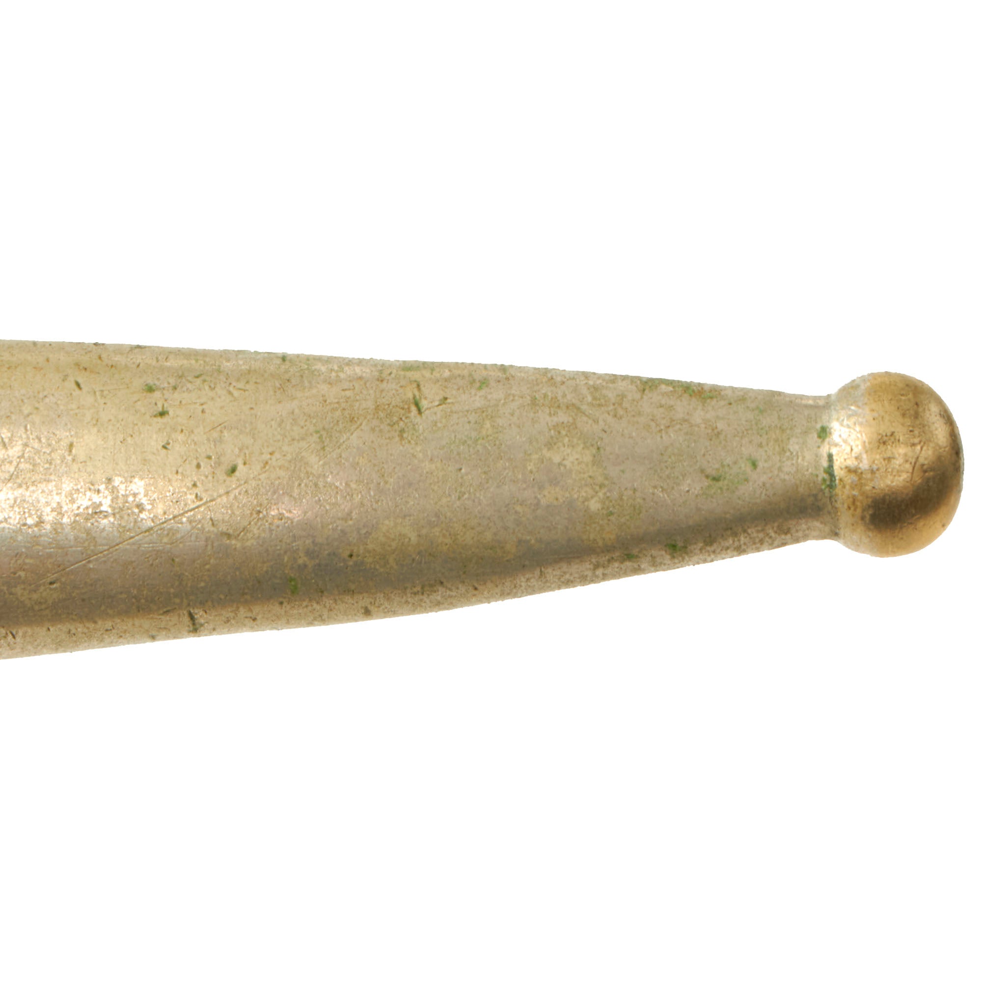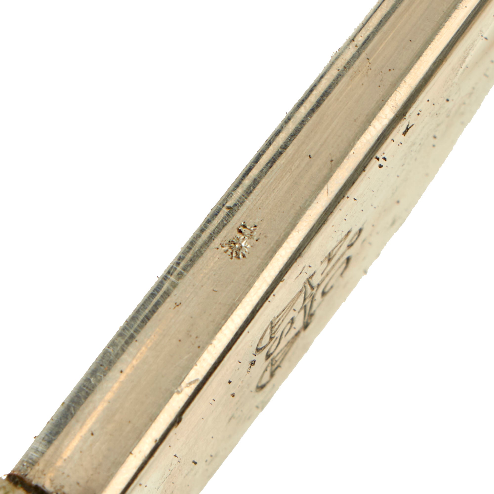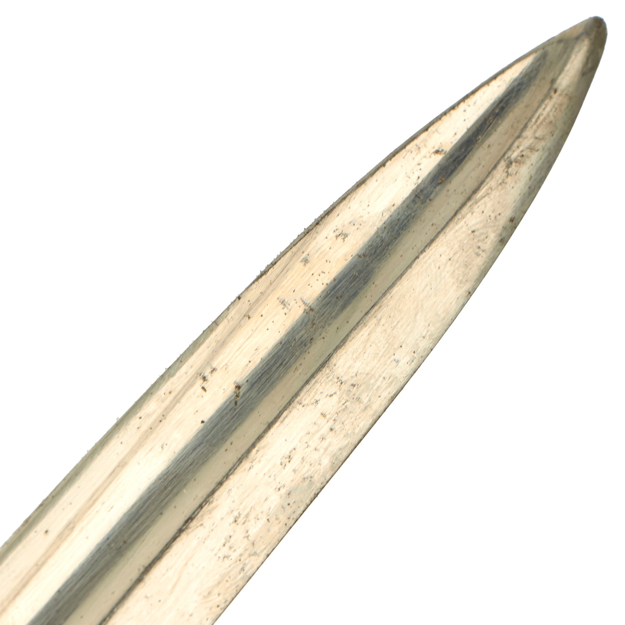 The bayonet has a lovely approximately 33 cm (12.75 inches) long nickel plated steel blade, which was forged "cut-down" style, with the fuller running to the tip. Blade is nice and bright, of excellent quality, and still has over 95% of the original nickel plating, with just a bit of wear through and oxidation speckling. There is also a bit of wear to the tip.