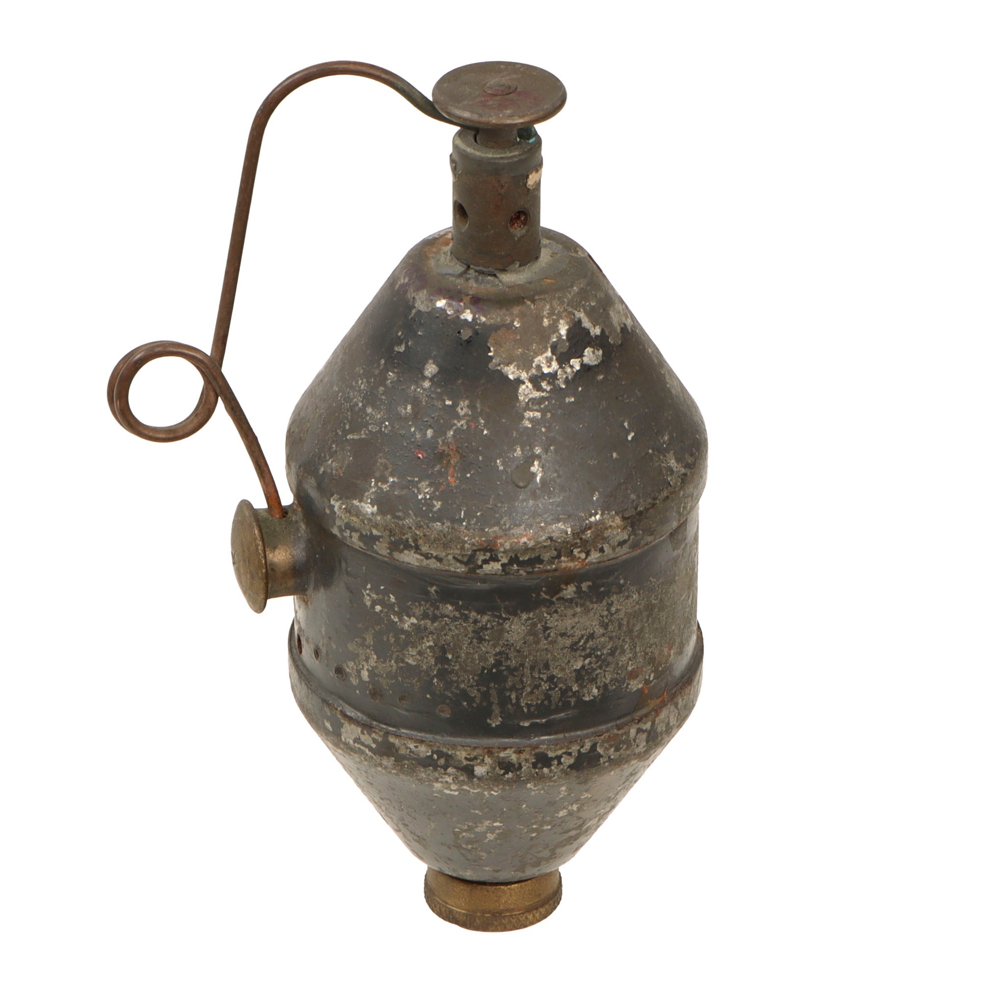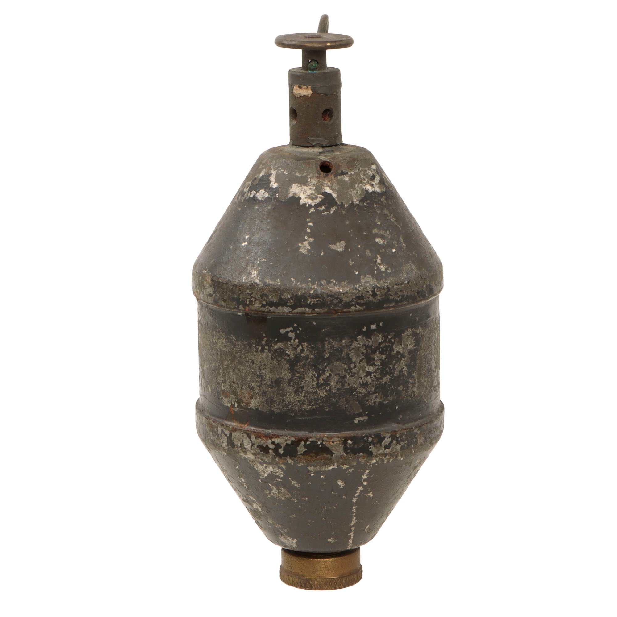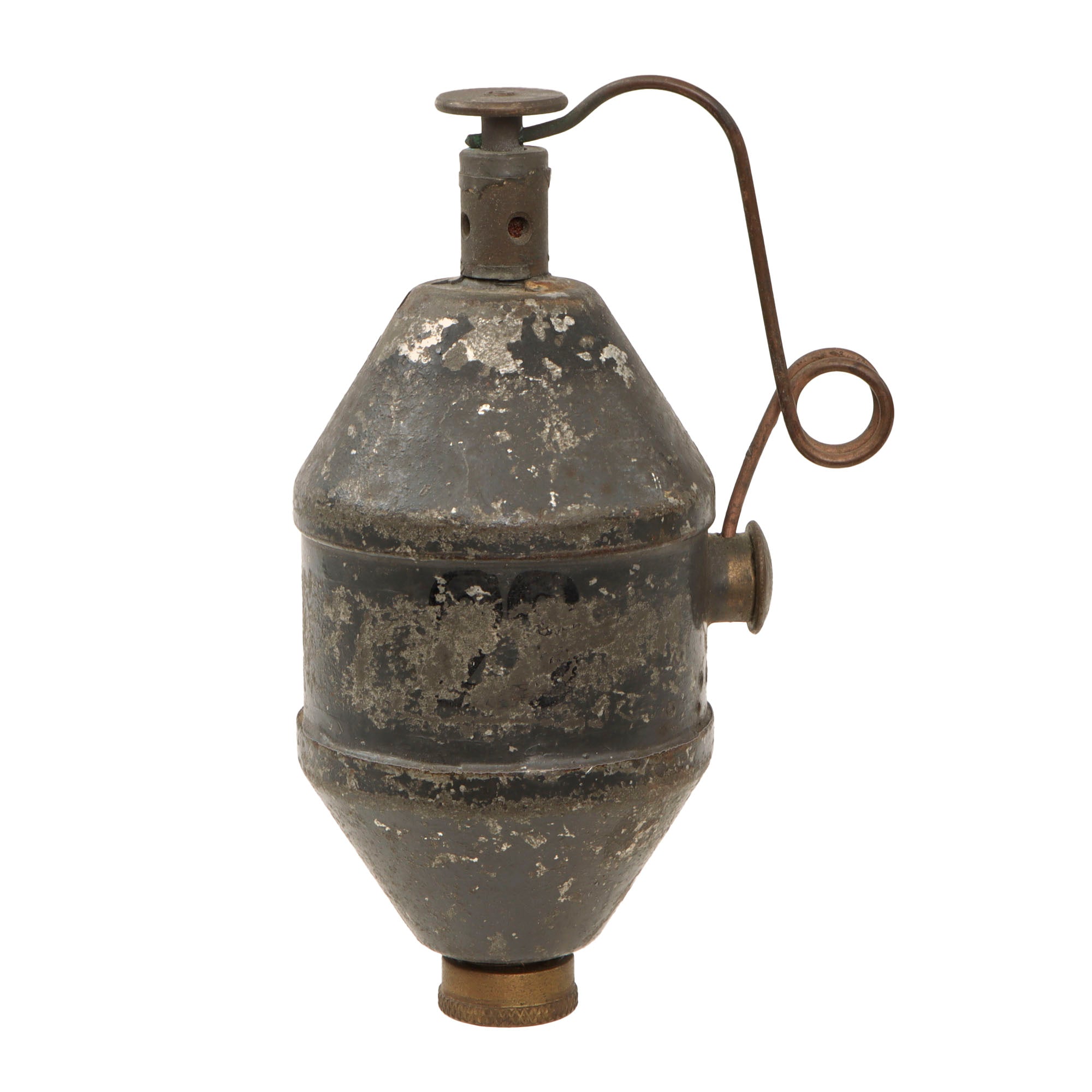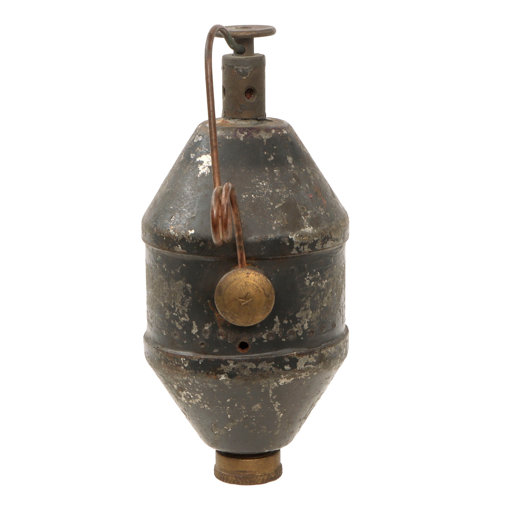 After use, the grenade had to be returned to the factory for a new fuse. A string of indented dots, may be found below the safety interrupter each indicating a re-load cycle by the factory. The example offered still has some of the original paint, and a great patina.