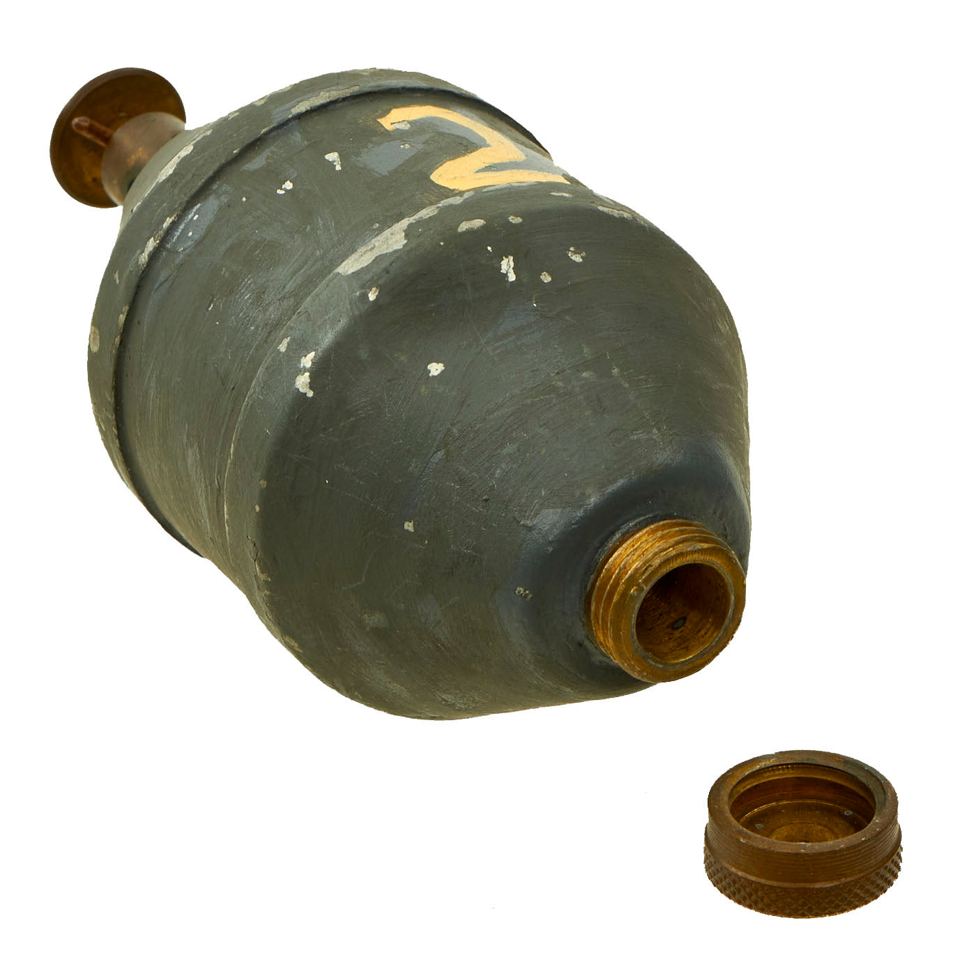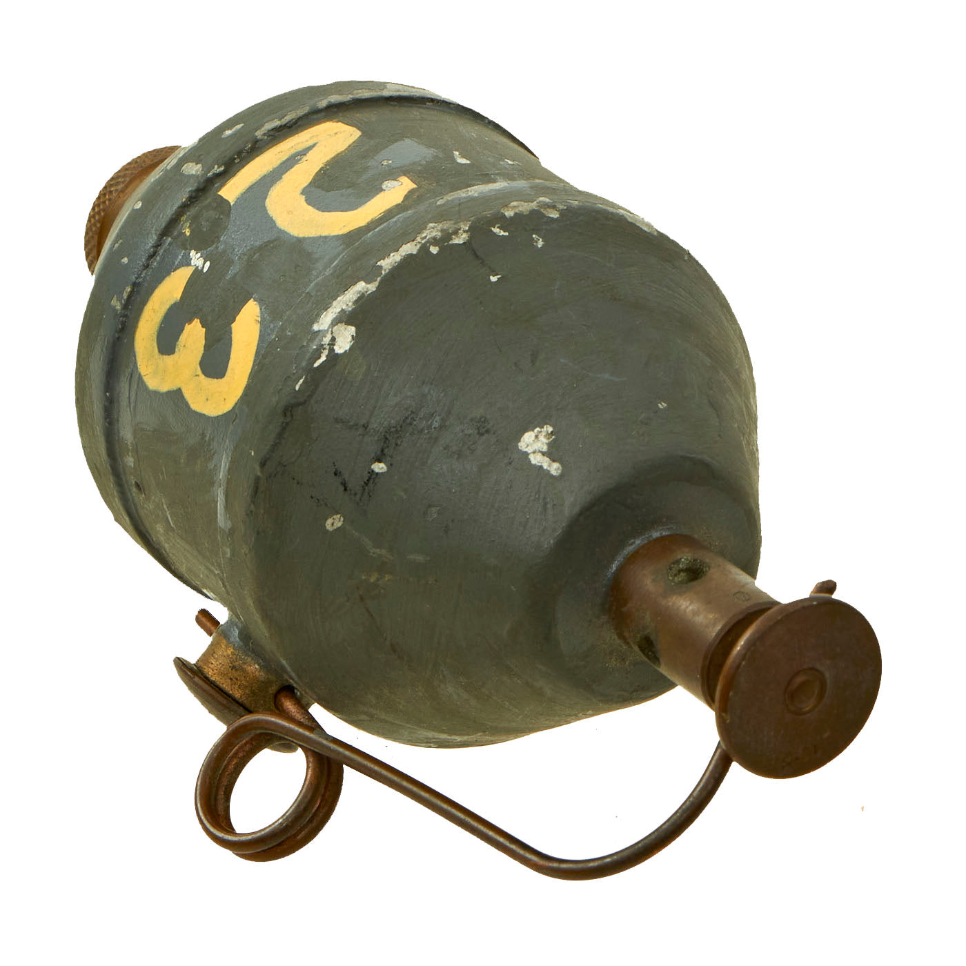After use, the grenade had to be returned to the factory for a new fuse. A string of indented dots, may be found below the safety interrupter each indicating a re-load cycle by the factory. The example offered here was apparently reloaded SEVEN times. It still has almost all of the original paint, and a great patina. It still has the 23 on the side visible, as well as the black band around the top. There is a small dent under the safety, as these were thrown long distances, so damage was always a possibility.