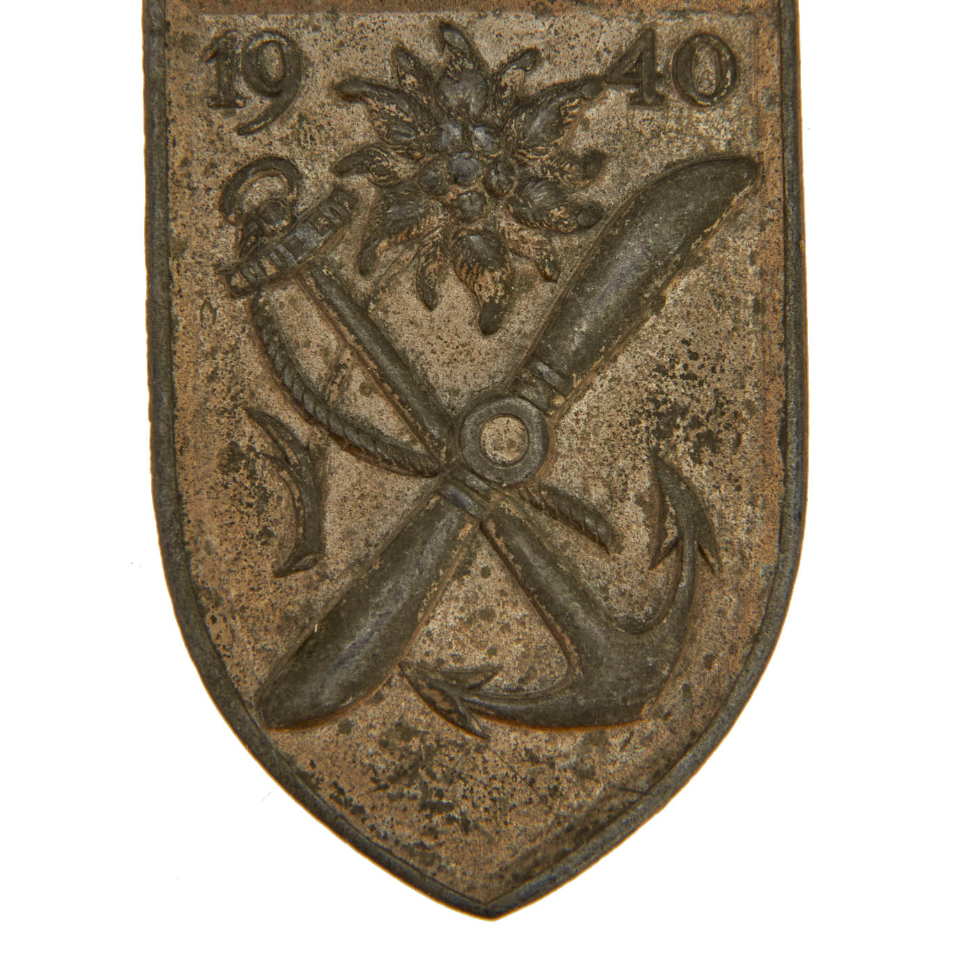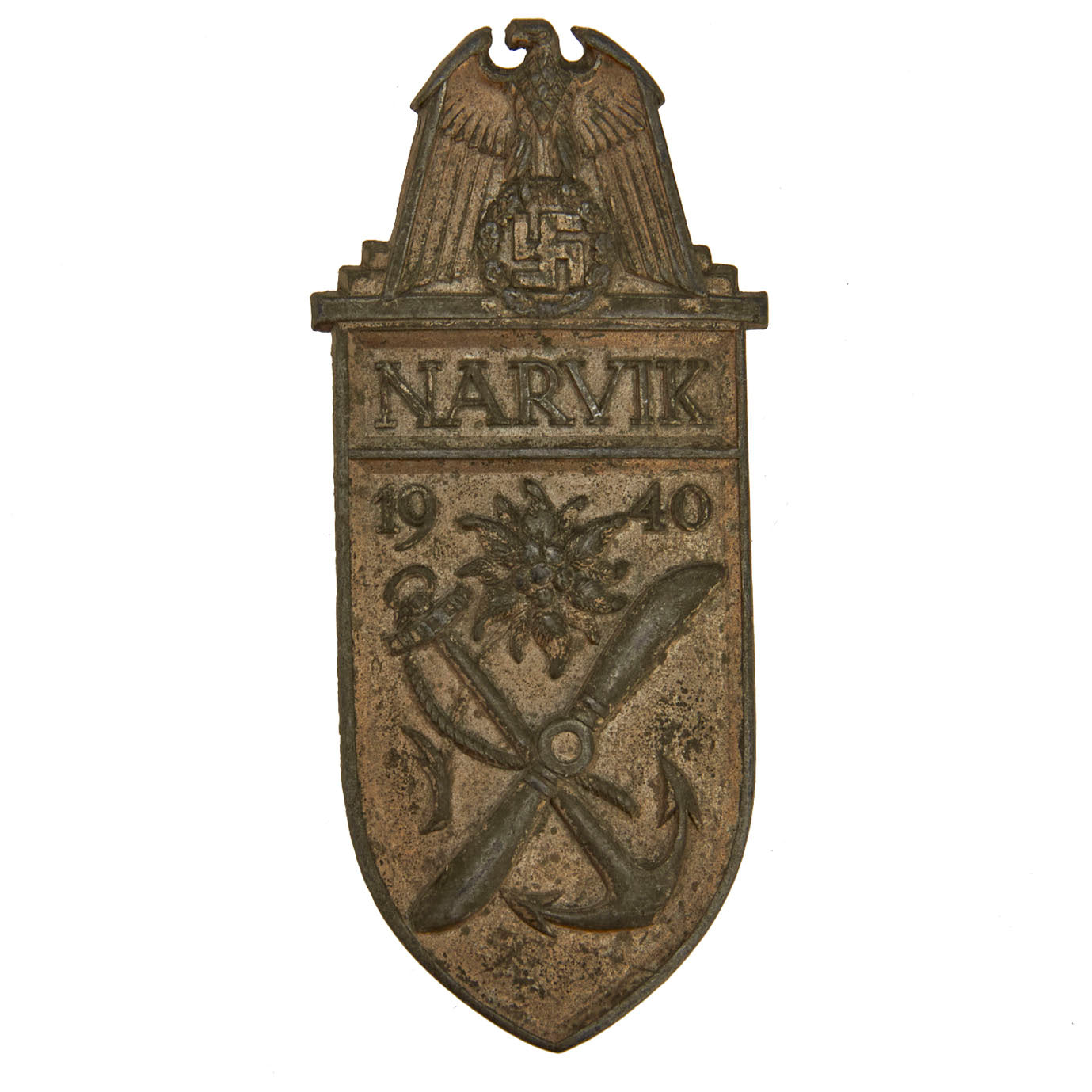 Original Item: Only One Available. The Narvik Shield (German: Narvikschild) was a World War II German military decoration awarded to all German forces that took part in the battles of Narvik between 9 April and 8 June 1940. It was instituted on 19 August 1940 by Adolf AH. The Oberkommando der Wehrmacht (OKW) published the order the same day. A total of 8,577 military personnel received the award. It was bestowed by General Eduard Dietl, the commander of Army Group Narvik.