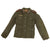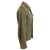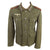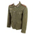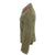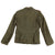 The tunic features four pockets with scalloped flaps and pebbled non-magnetic buttons, which look to be zinc alloy, and were possibly originally painted green, which is now totally gone. The closure features 5 of the same buttons on the right breast flap meeting an equal number of reinforced buttonholes on the left flap. There is also a hook and loop collar securing fastener, which is oxidized. The buttons do not appear to have maker marks, and are oxidized, with much of the original green paint worn away. The interior of the tunic is lined with olive canvas, which is fairly standard for Depot issued tunics.