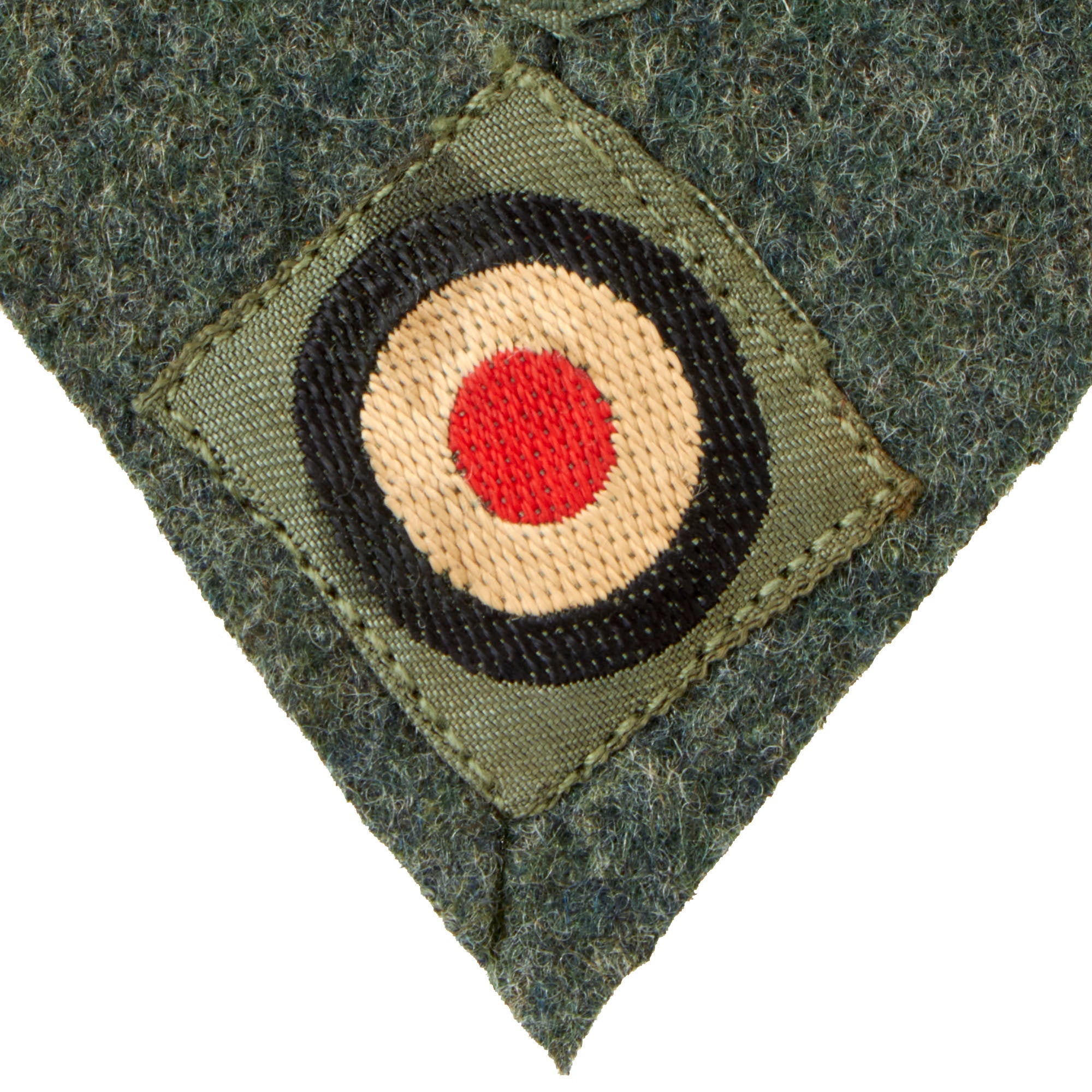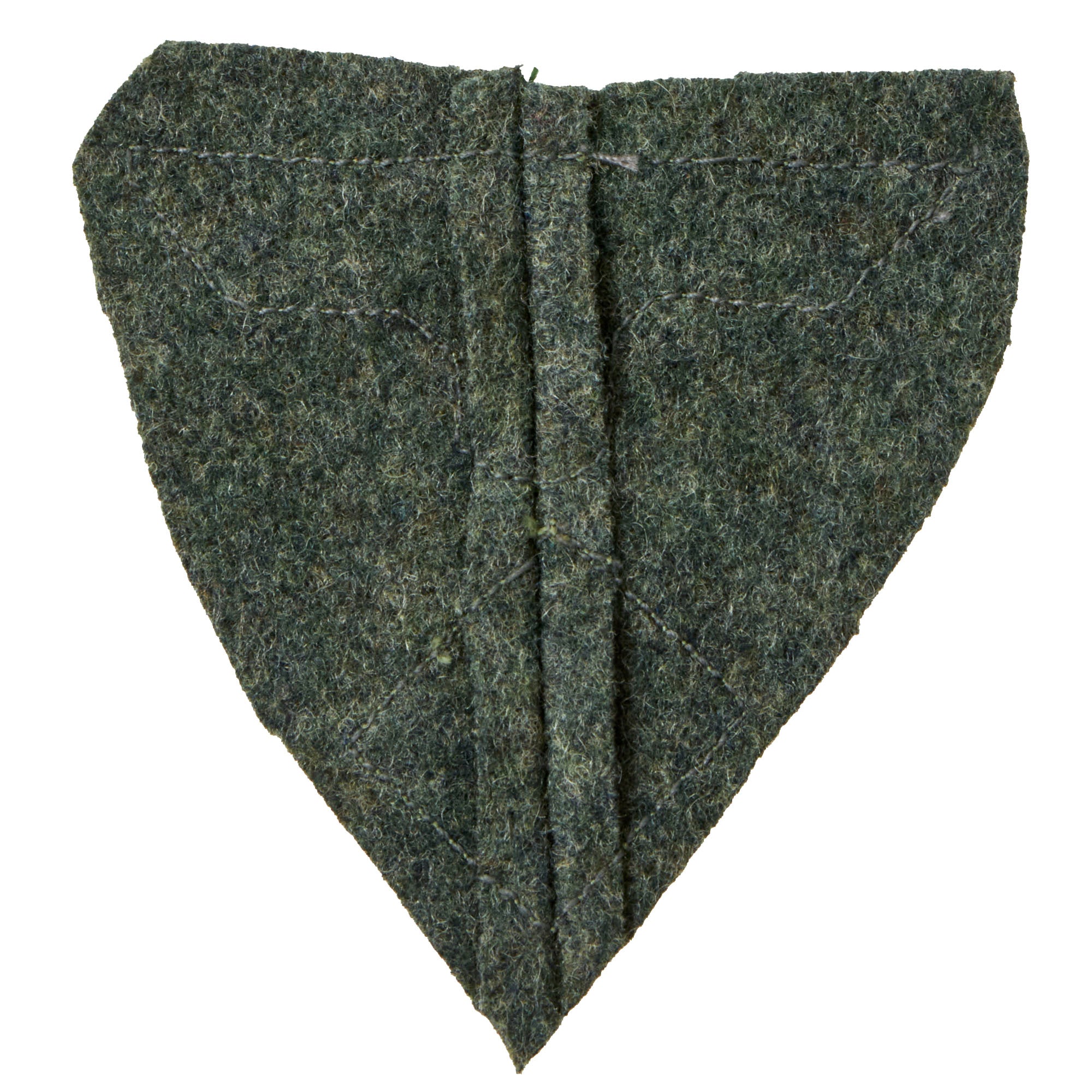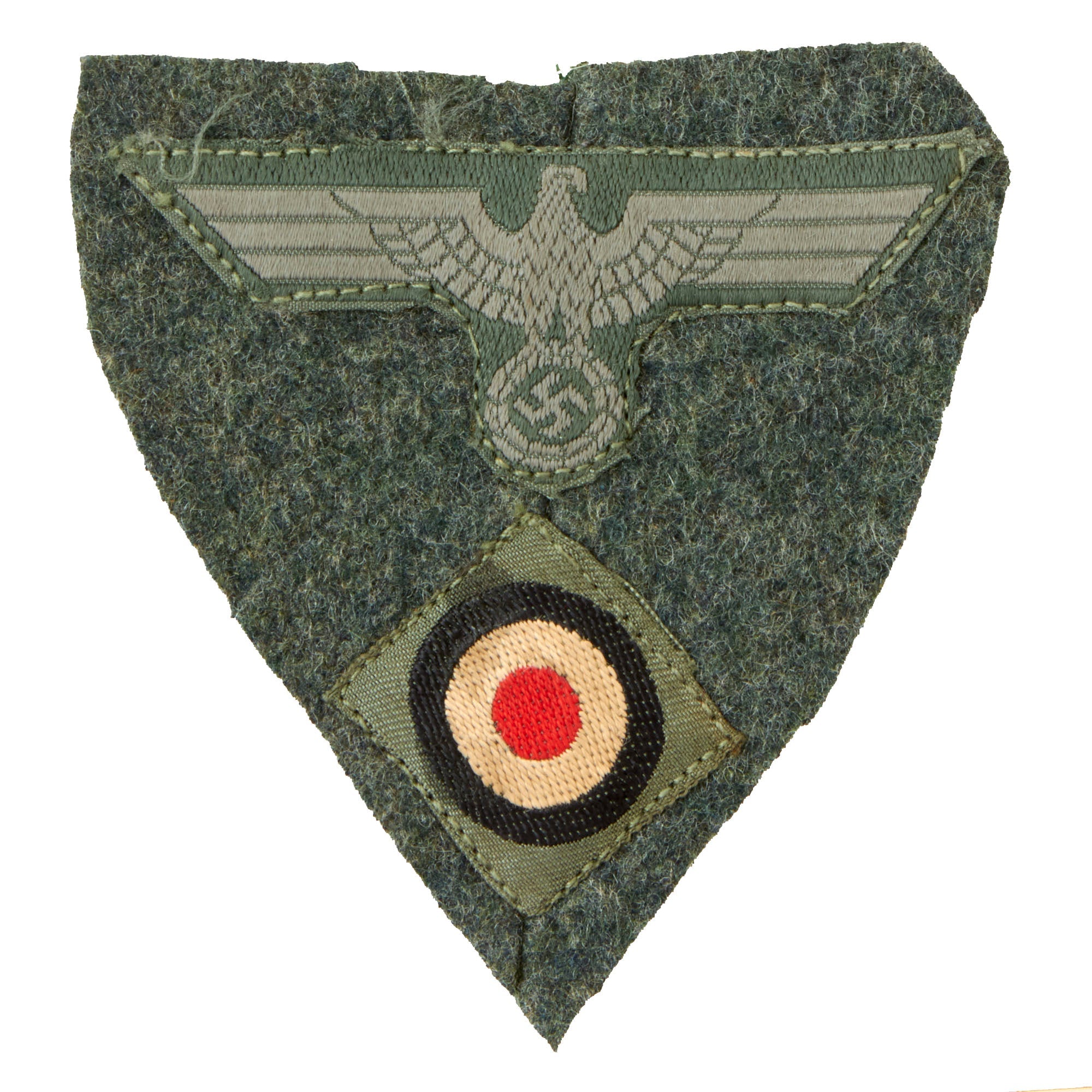 Original Item: Only One Available. Here we have a very nice Cap Eagle and Cockade, cut off from a German WWII Army M43 Field cap (Heer M43 Feldmütze). The insignia are sewn onto a field gray (feldgrau) wool cap section. It features a fine machine BeVo embroidered eagle, with gray thread on a light green base, the Heer colors in use from 1940 onwards. Below this is a machine embroidered tri-color cockade, which is woven on the same color material. Measures roughly 3x3”.
