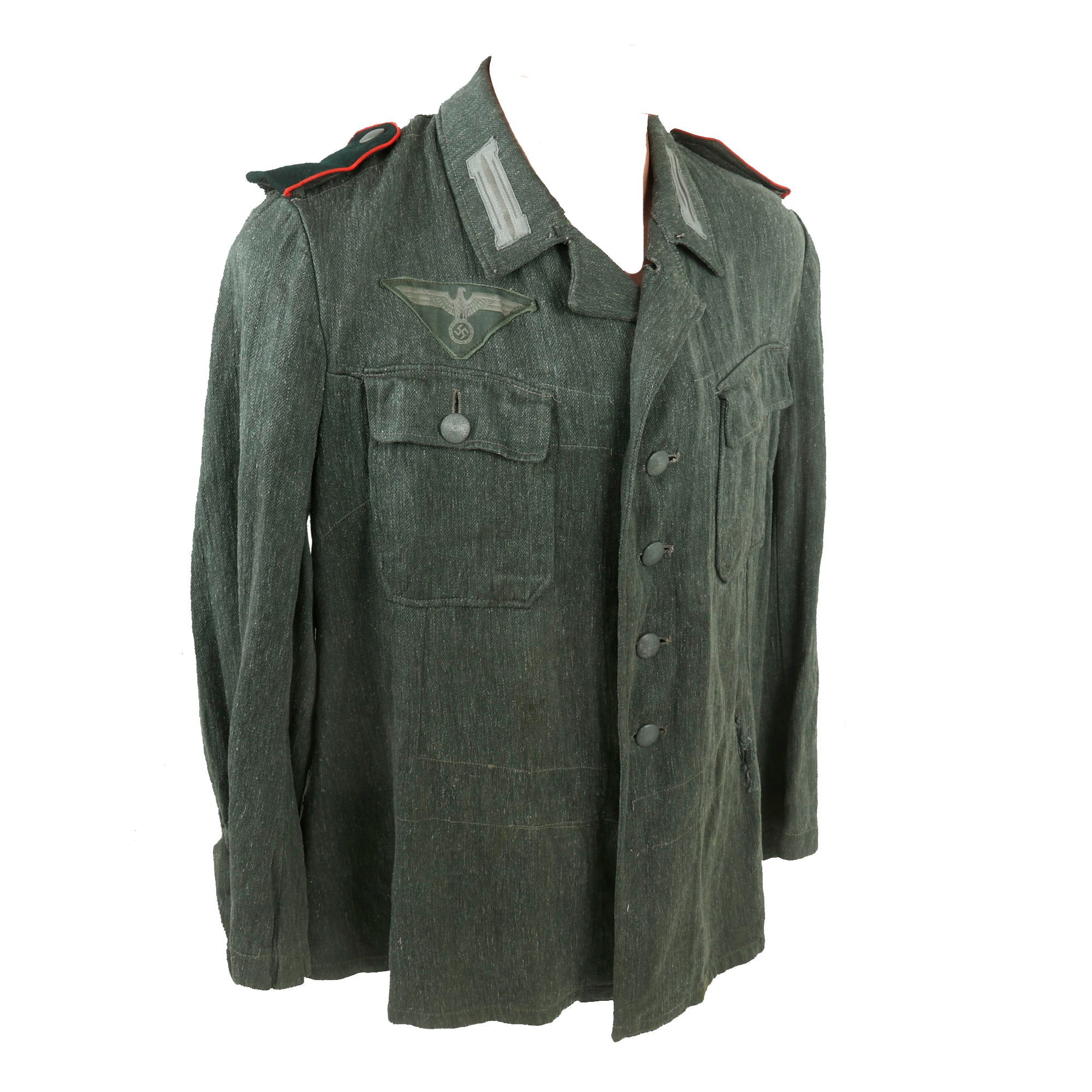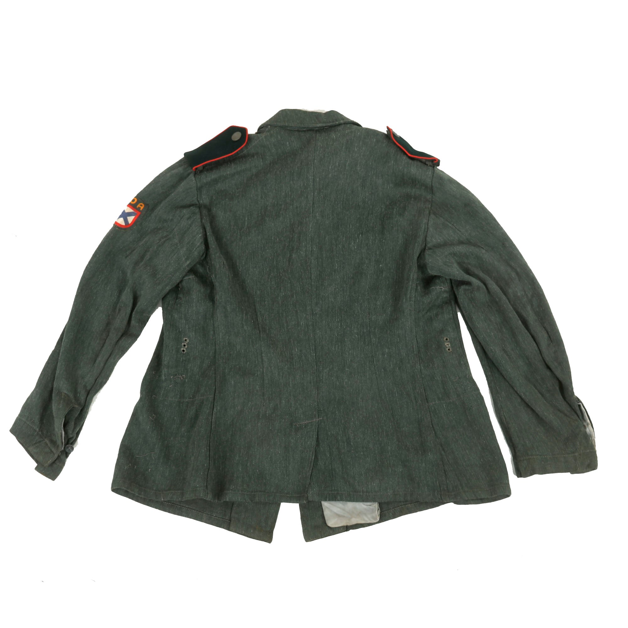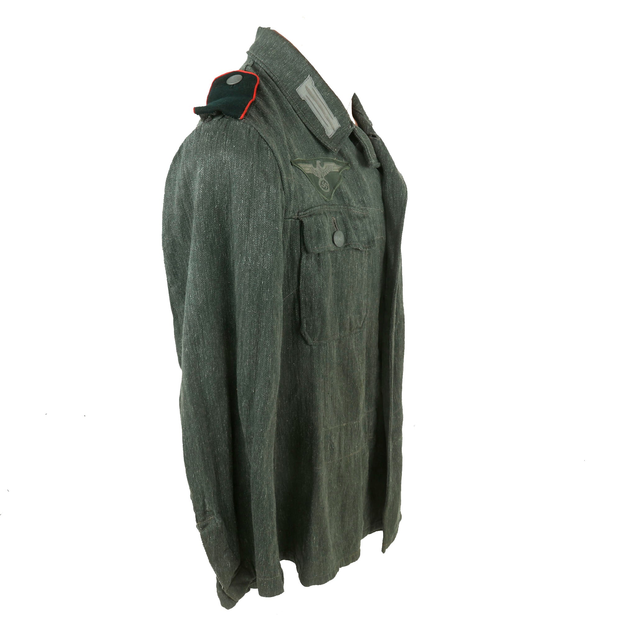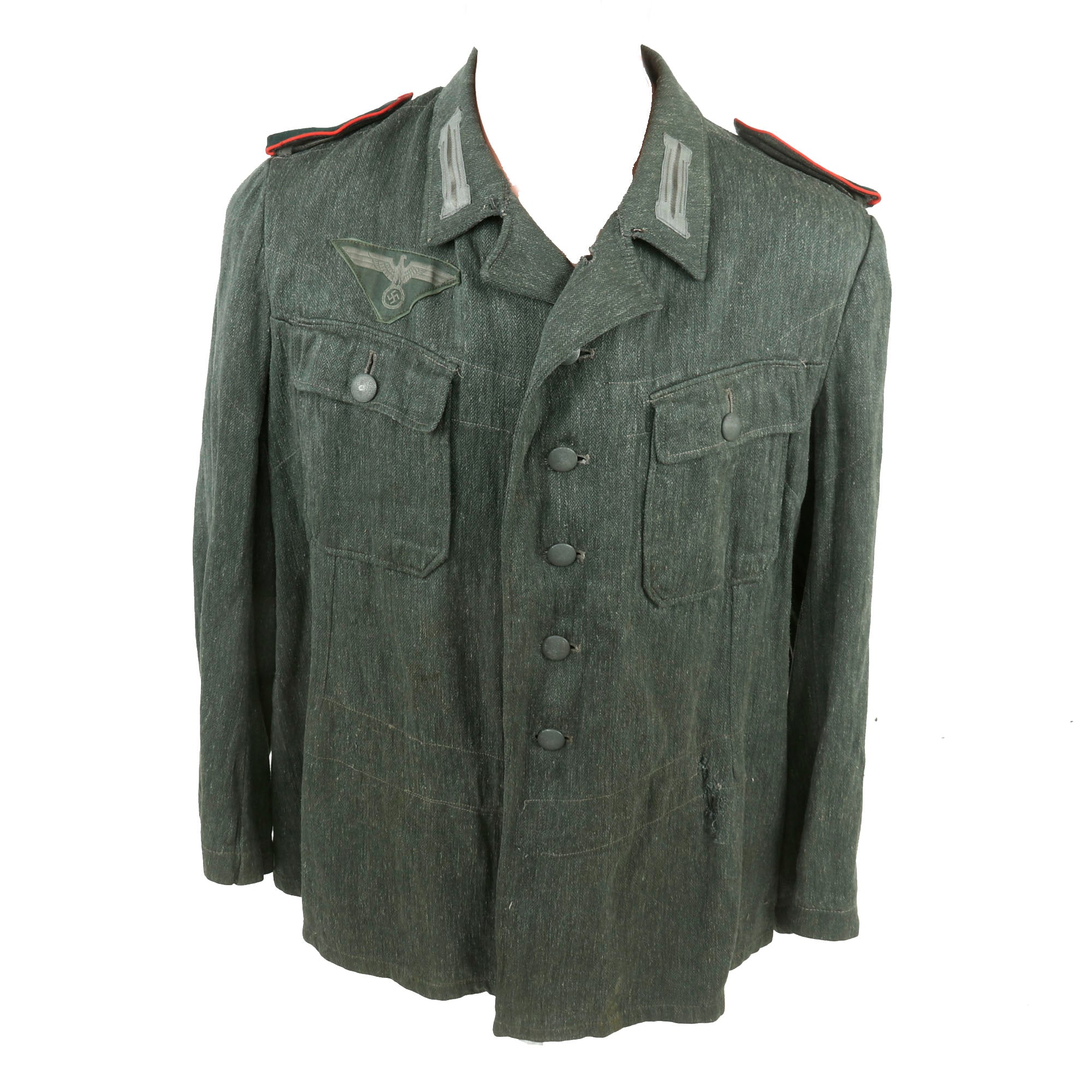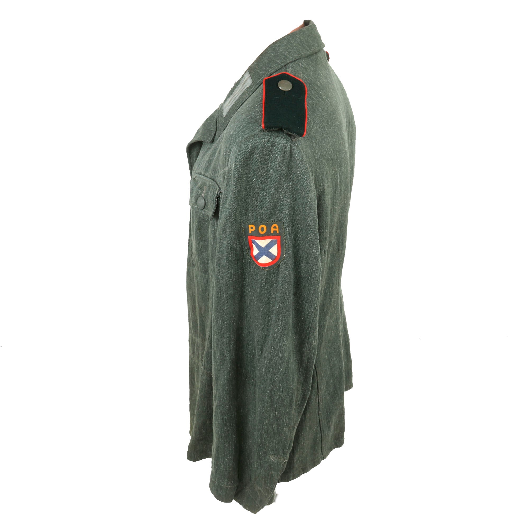 Original Item: One-of-a-kind. This is a lovely "salty" service used condition German WWII Heer Army Artillery Enlisted Herring Bone Twill (HBT) constructed Drilljacke or Drillichjacke (Drill Work Jacket), with a fantastic broken-in look. This was set up for use by the POA Soviet Liberation Army, one of several "volunteer" groups aligned with Germany during the Eastern Campaign. These were comprised from local conscripts who set against the Soviet Union, and these often were outfitted with used and obsolete uniforms and accessories.