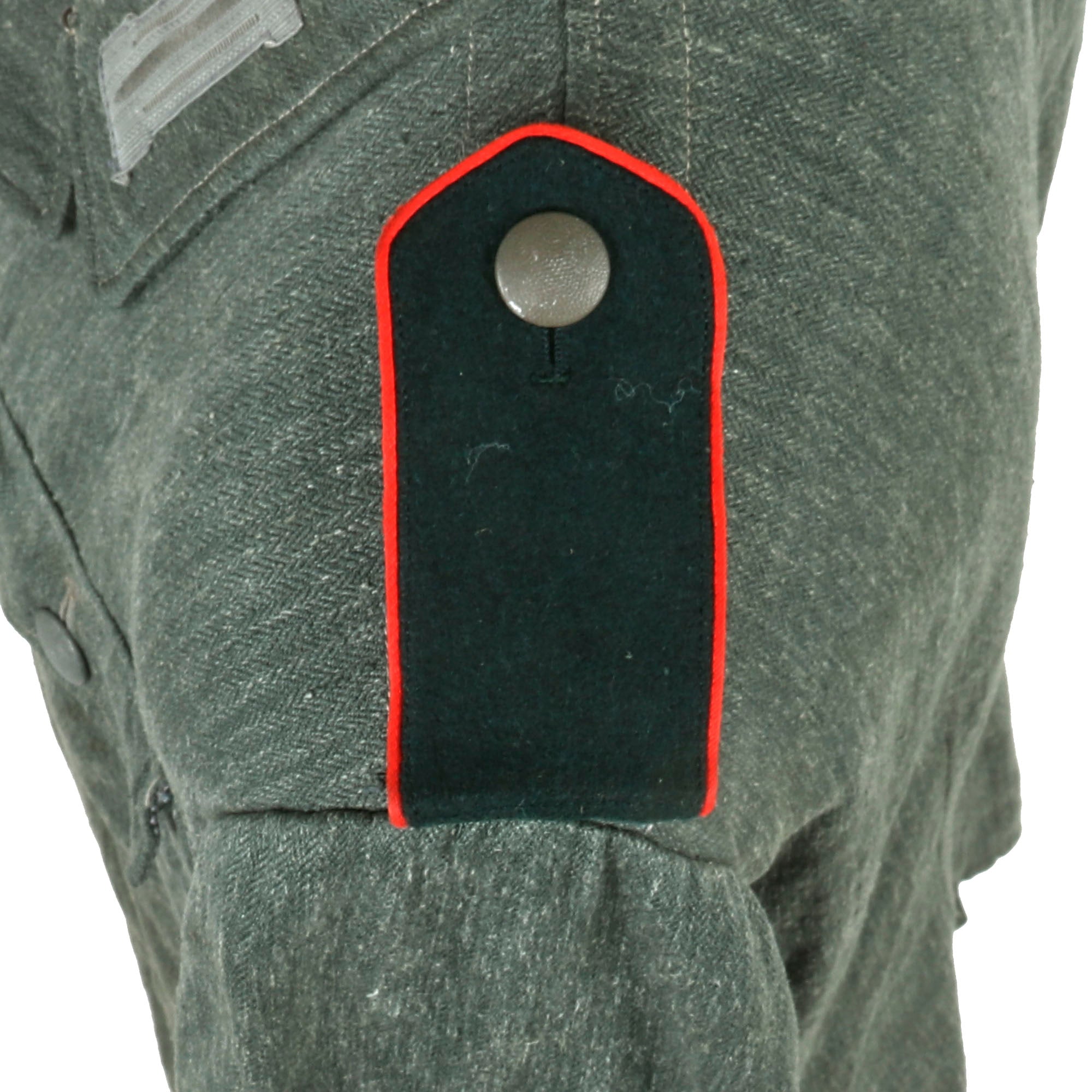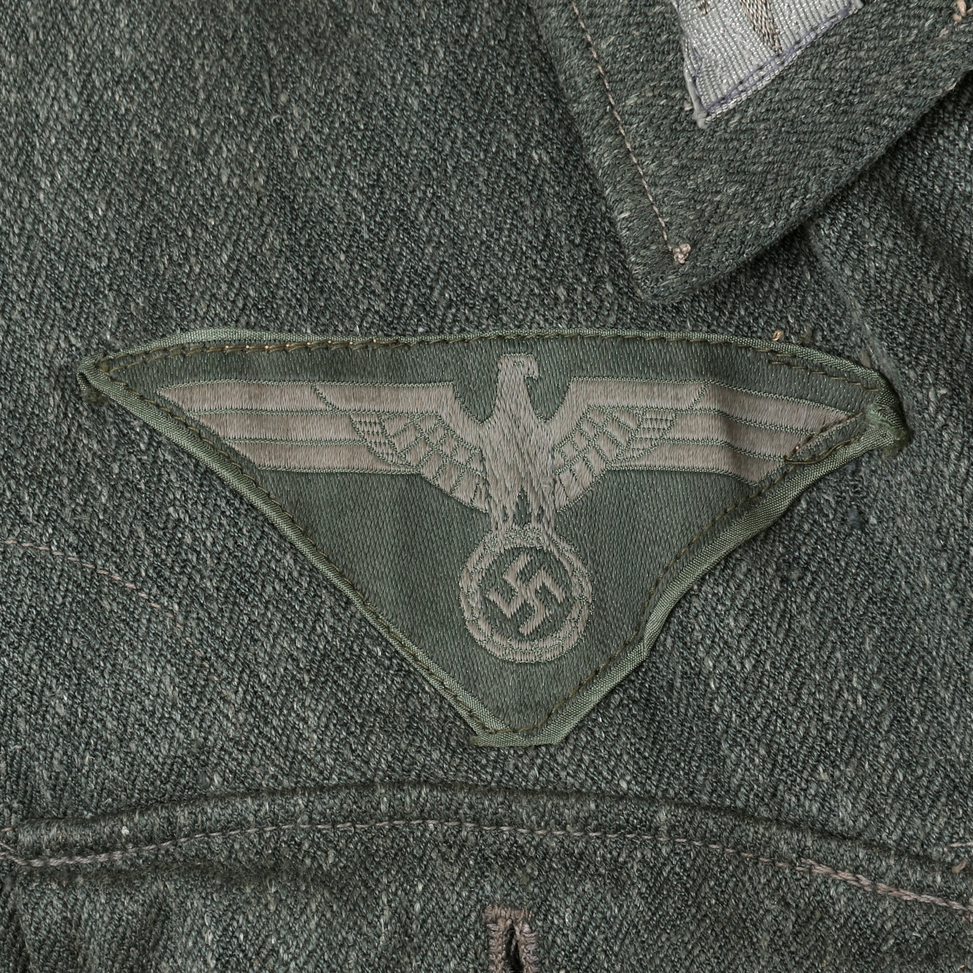 The tunic is outfitted with all of the insignia usually seen on the field uniform. The upper right chest features a BeVo machine embroidered Wehrmachtadler Eagle, which is the triangular shape and gray on green color introduced in 1944. There are EM/NCO litzen collar patches on each side, which are woven from gray and green threads, and are installed on green backgrounds. They do not have Corps Color stripes, as in 1938 they were removed from EM/NCO collar insignia to save time.