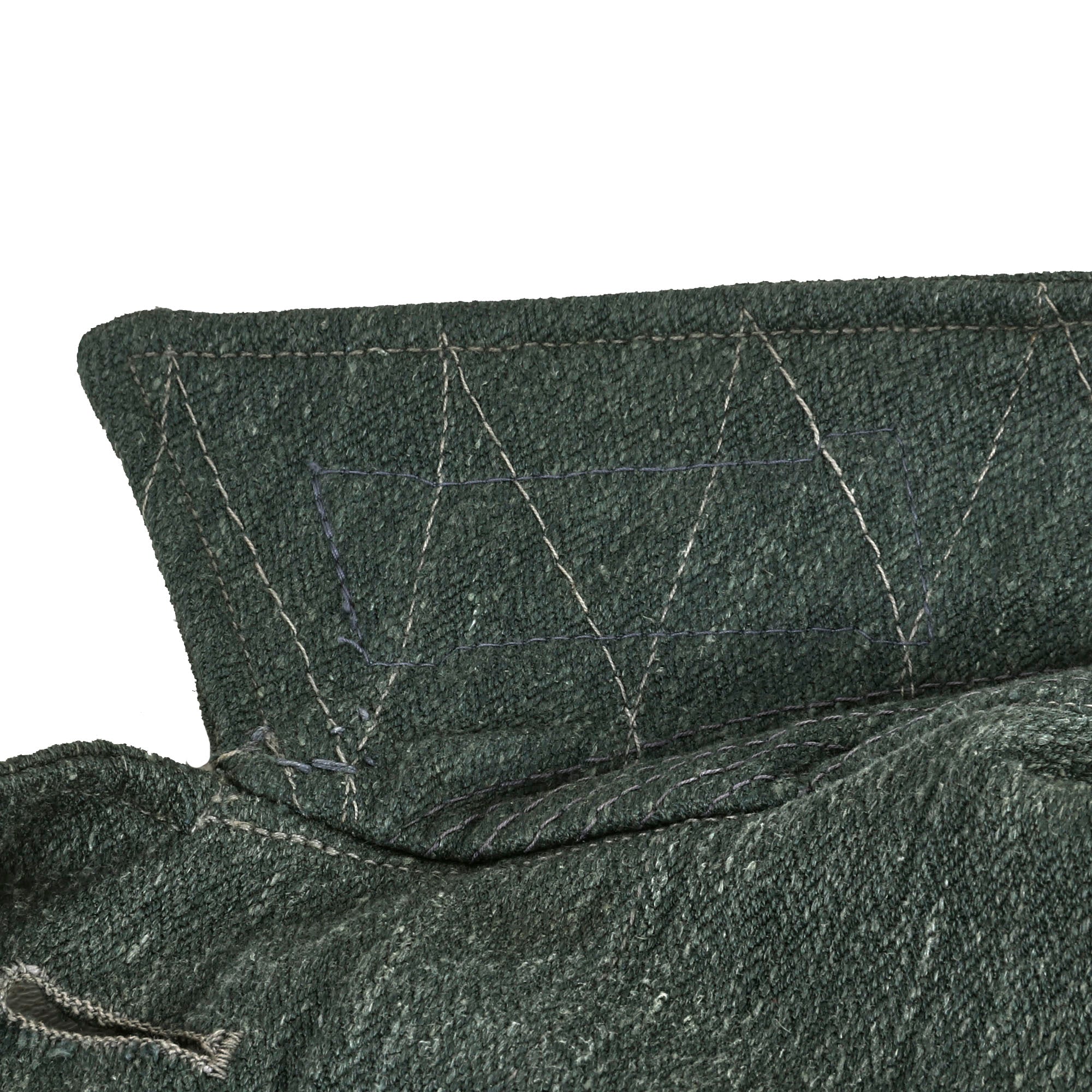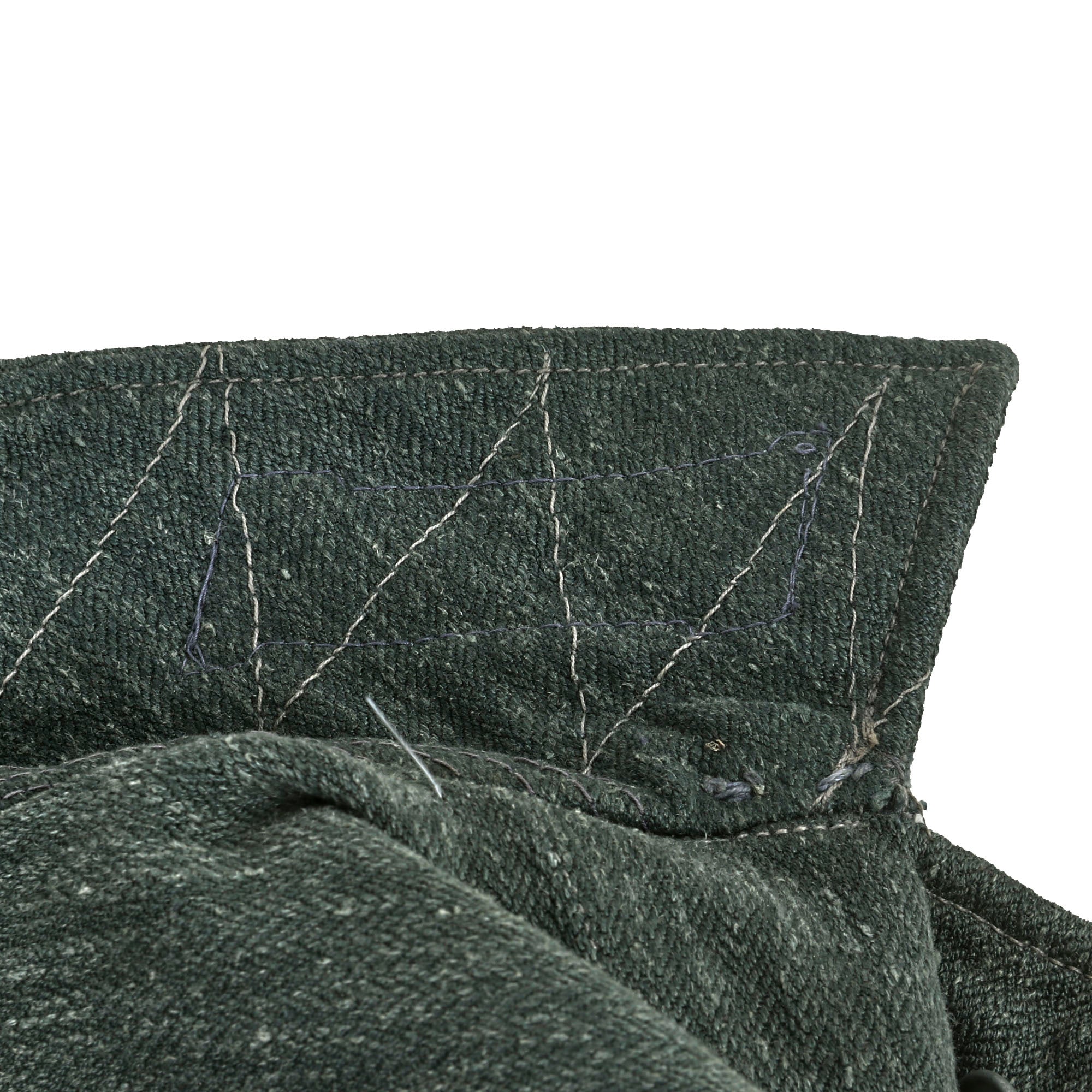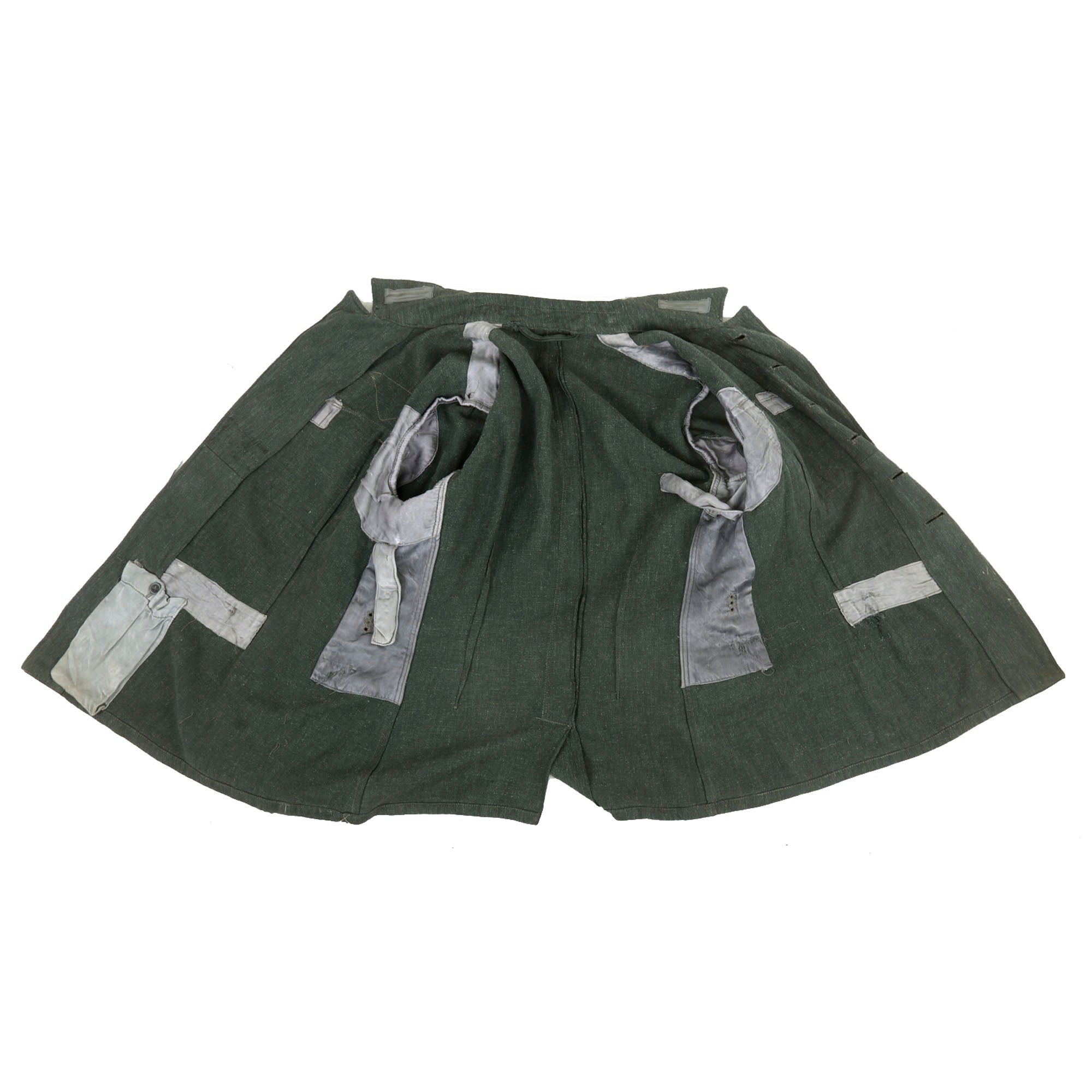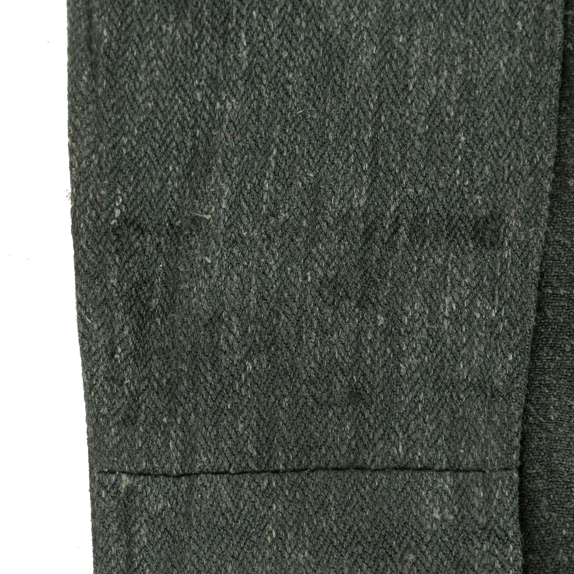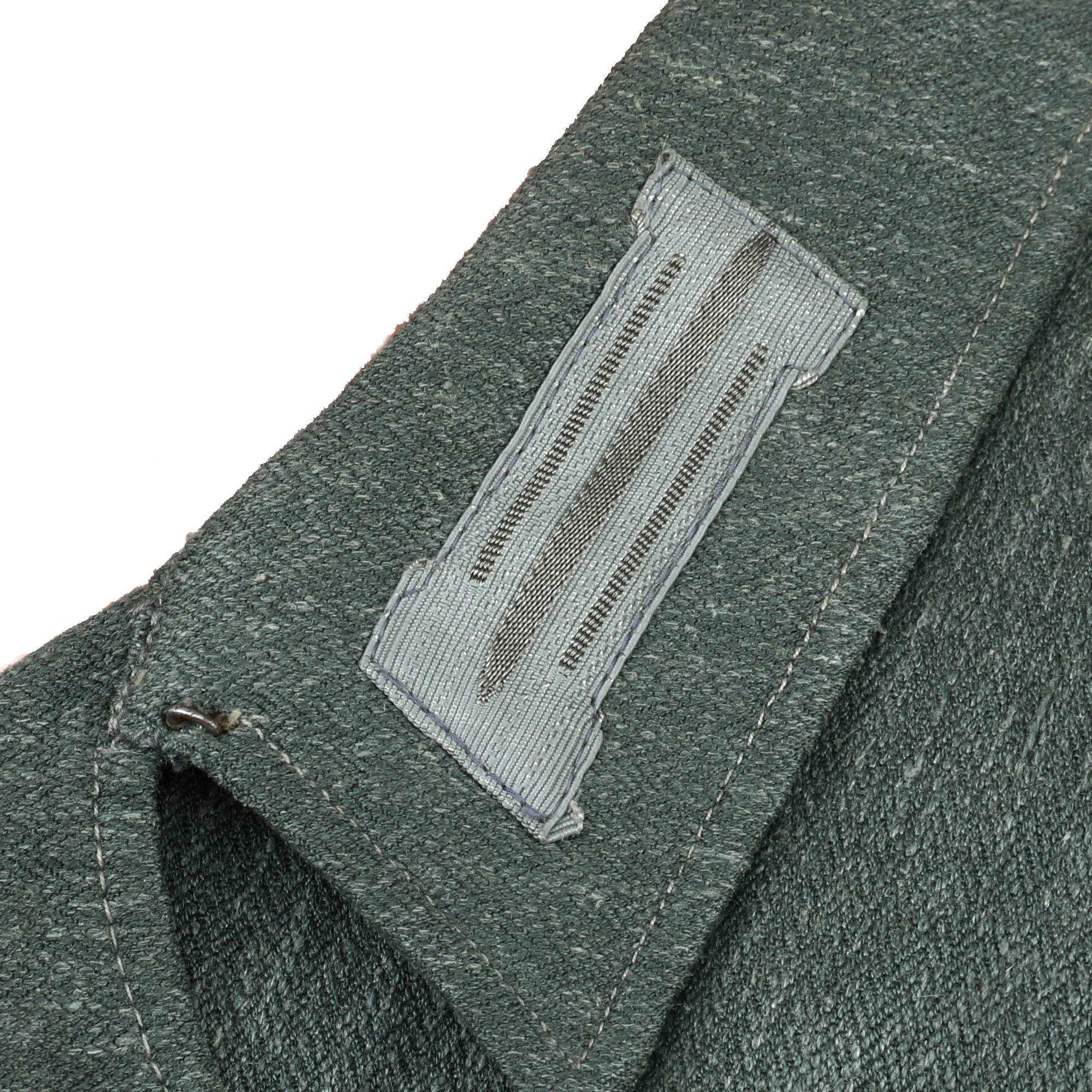 Here we have a very nice "salty" condition green colored HBT Drilljacke Tunic, which has two chest pockets with no waist pockets, and appears to be one of many different variations with various different pocket configurations. It features a six button front closure, with pebbled non-magnetic buttons that all appear to be maker marked. These are all secured by circlips under a flap inside the right side, as are the buttons for the pocket flaps. The interior is unlined, but features gray rayon reinforced areas around the sleeves and down the sides to support the waist belt hooks, which are not present. The only pocket on the inside is the right side bandage pocket, and we were not able to see any markings.