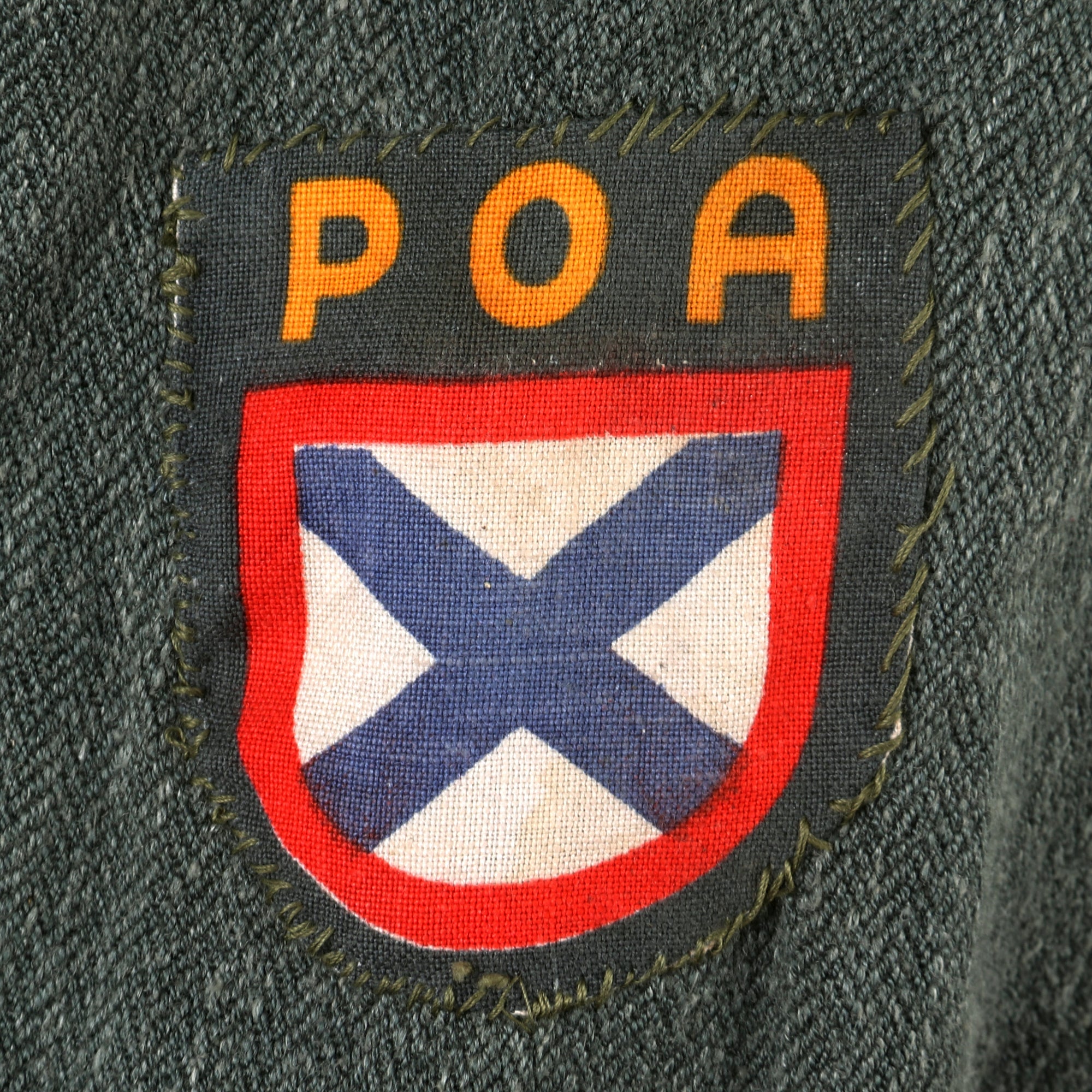 Attached to the left sleeve is a printed P O A Soviet Liberation Army shield insignia, which would be correct for a Don Cossack volunteer. They comprised a good portion of the members of the unit. It is in very good condition, and is hand stitched to the sleeve with olive thread.