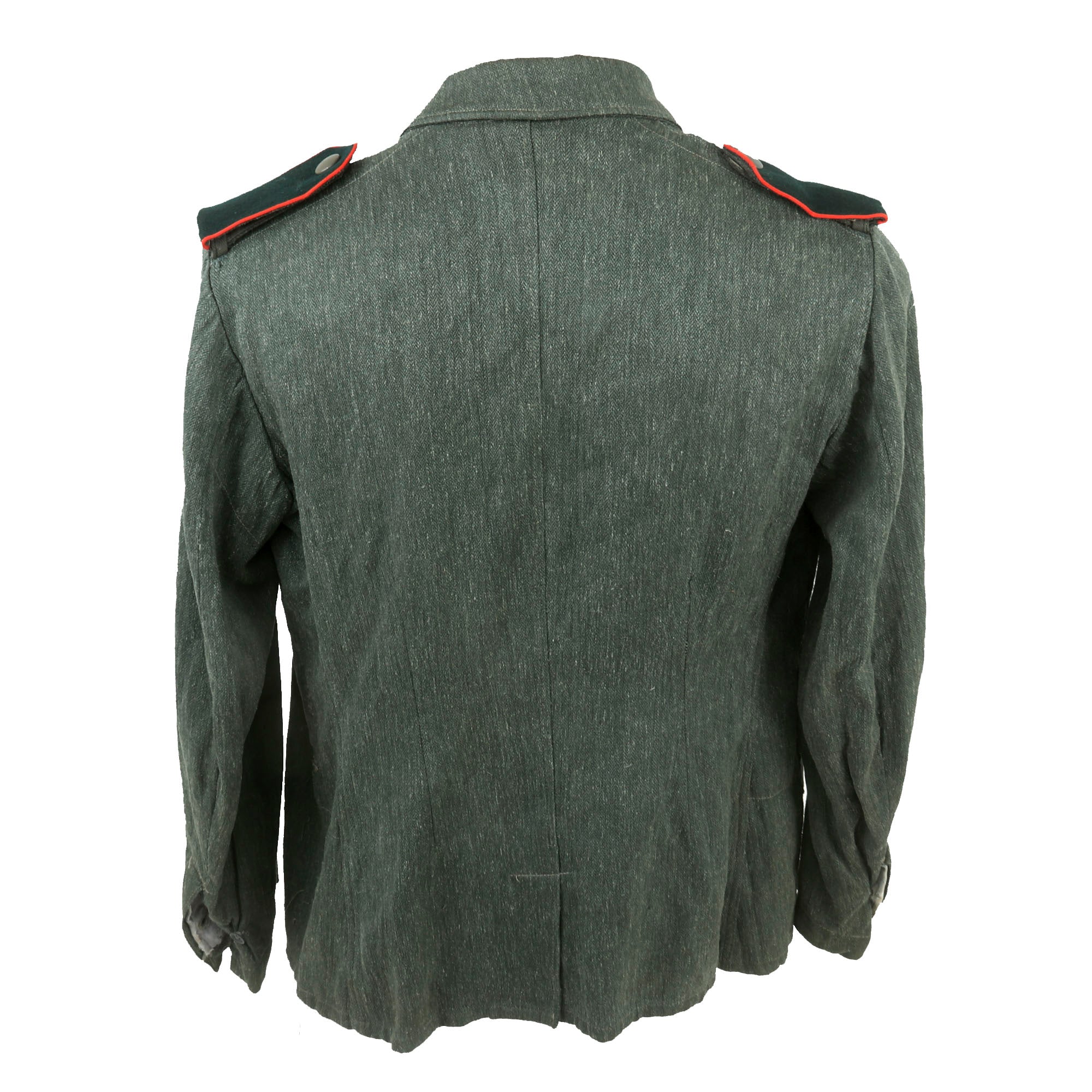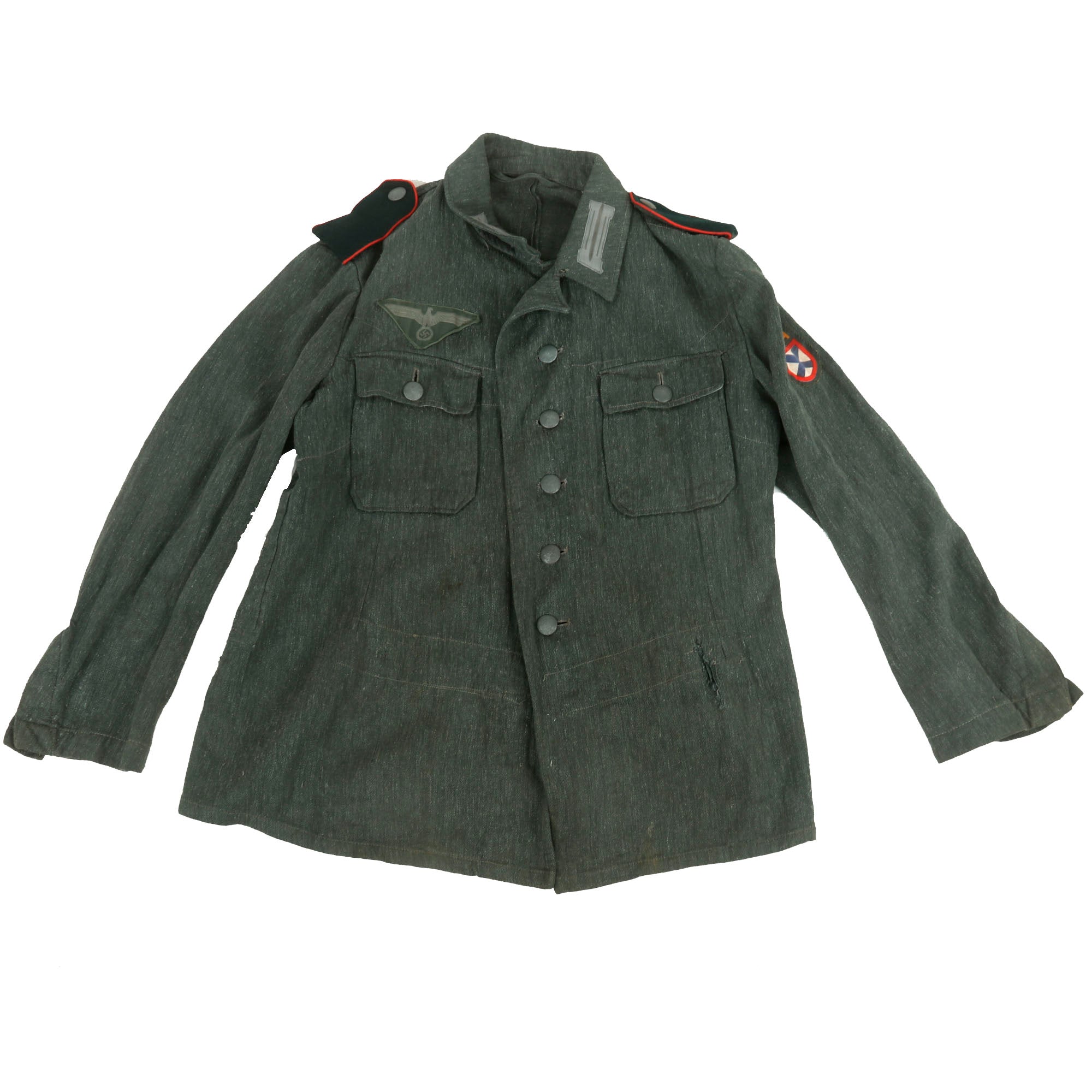 The Drilljacke shows wear, and definitely has some frayed and torn areas, consistent with long service during the war. It has a fantastic "been there" look that makes it perfect for any type of WWII display.