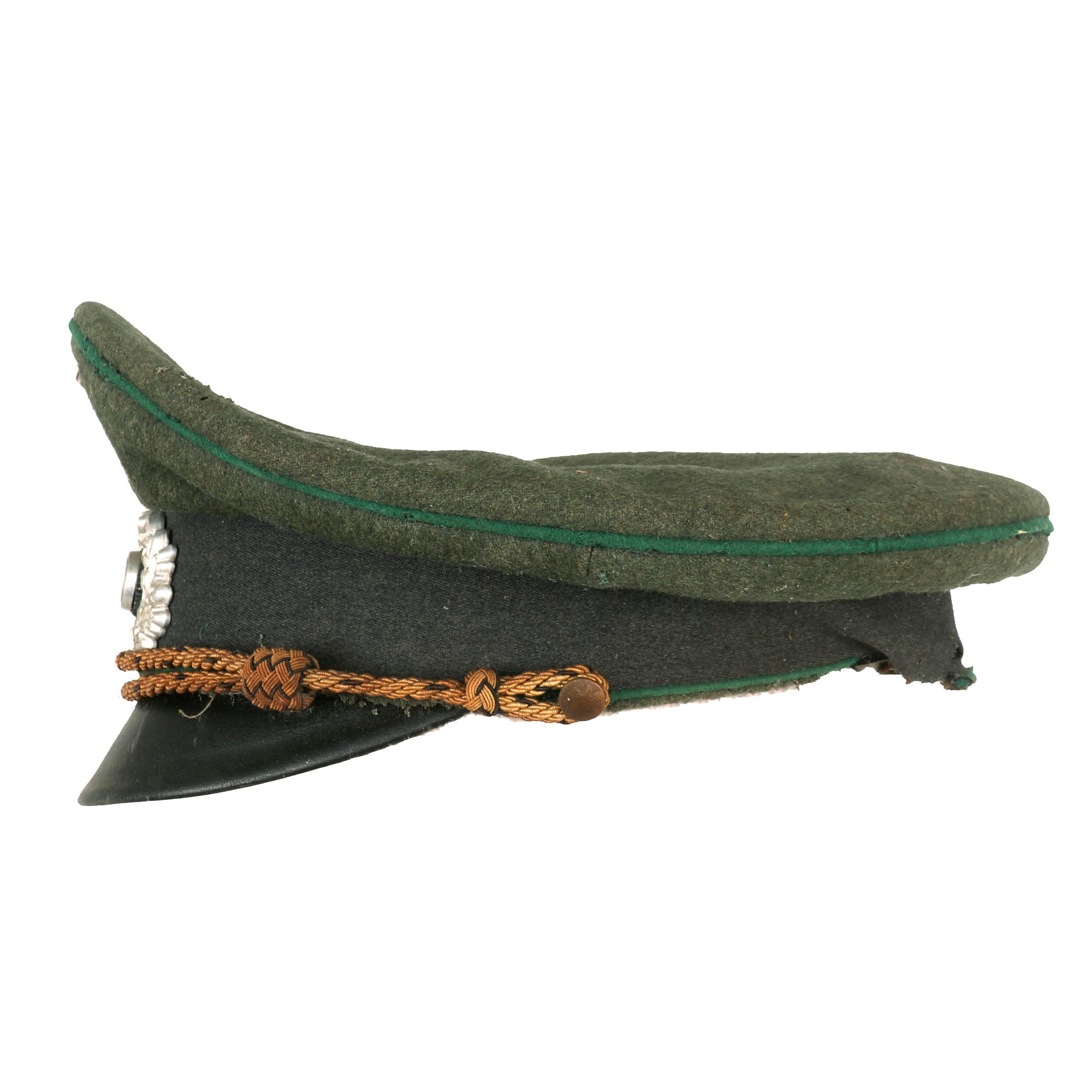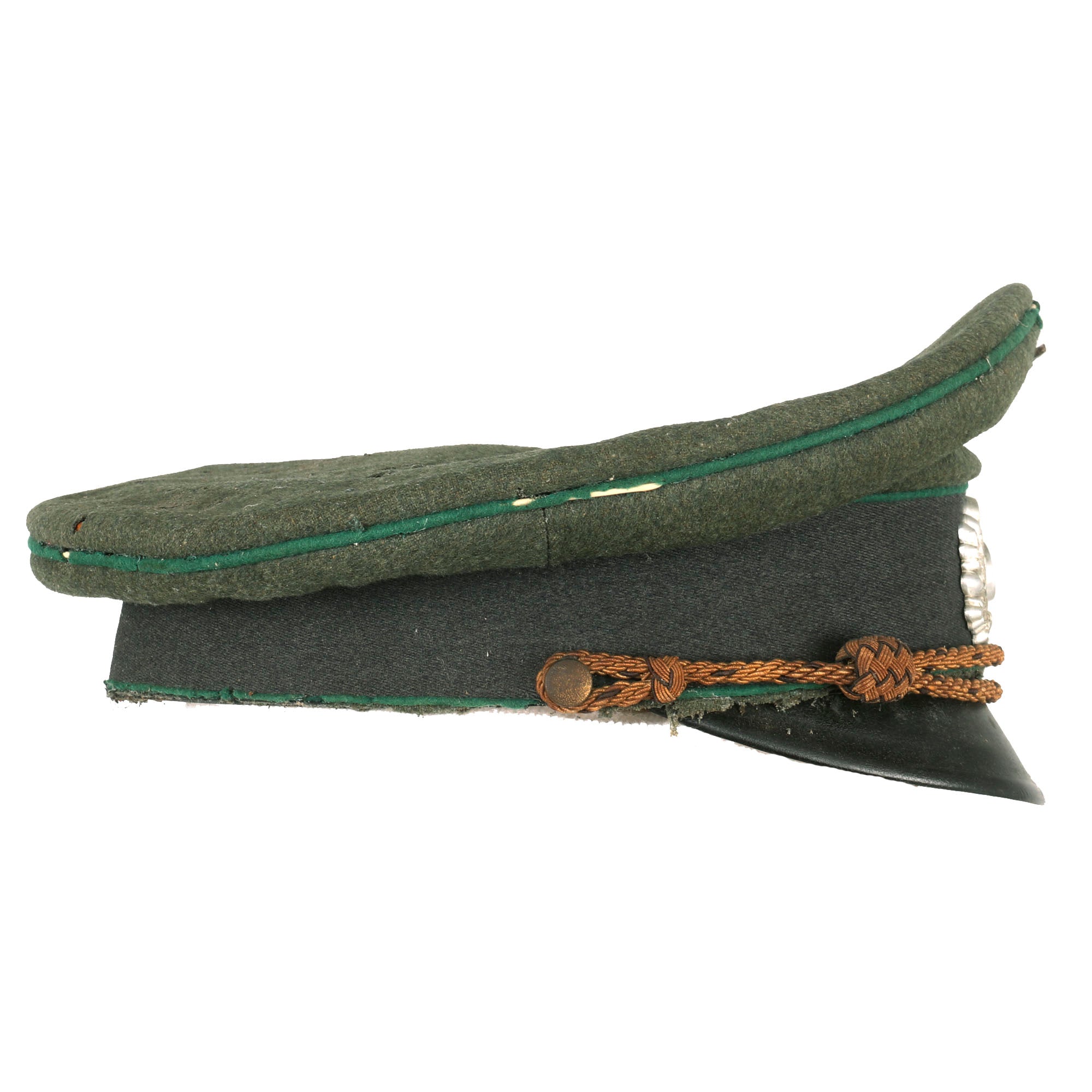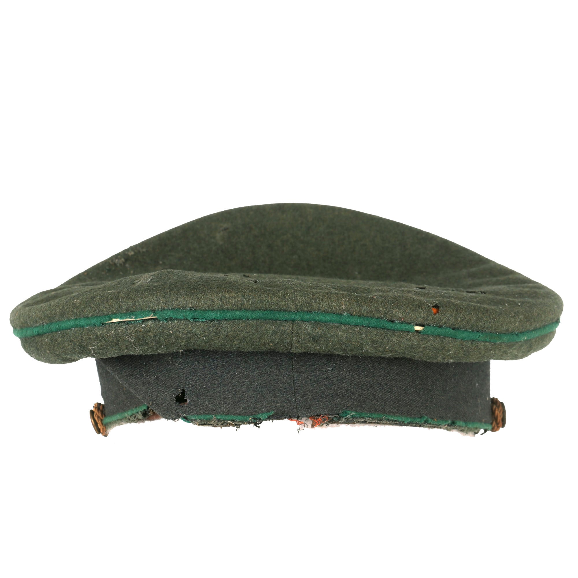 The included Schirmmütze Visor Cap is the correct officers type, with the correct Dunkel-grün (Dark Green) triple piping, and a gold bullion chin strap. It is in rough shape, with the visor completely detached, and it shows wear and moth damage throughout.