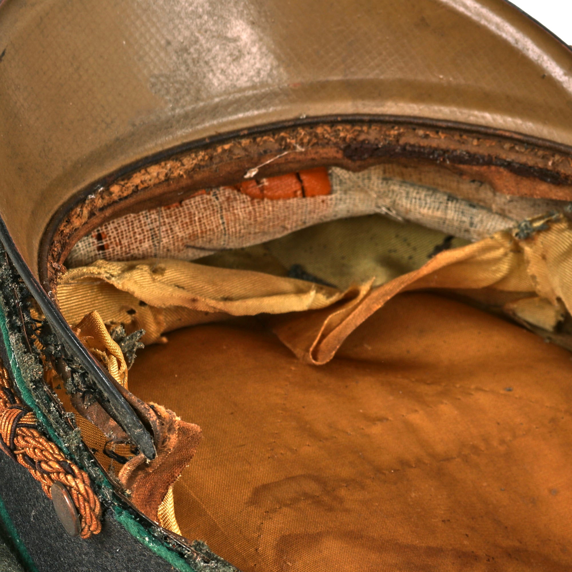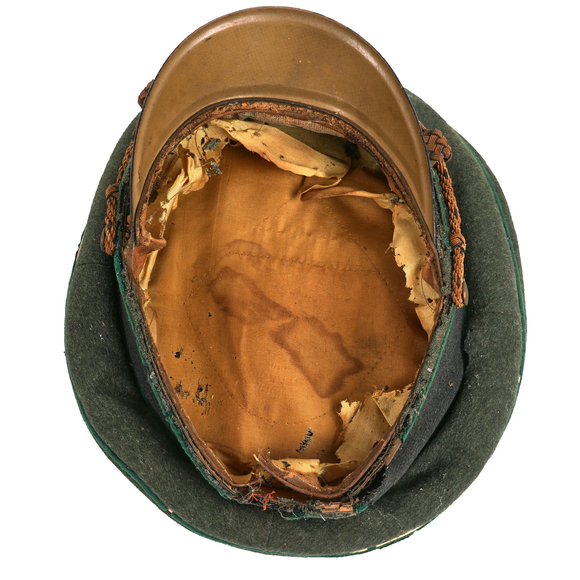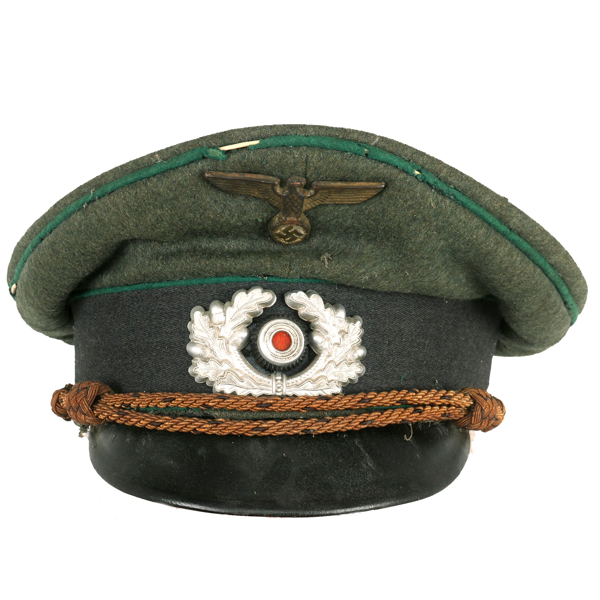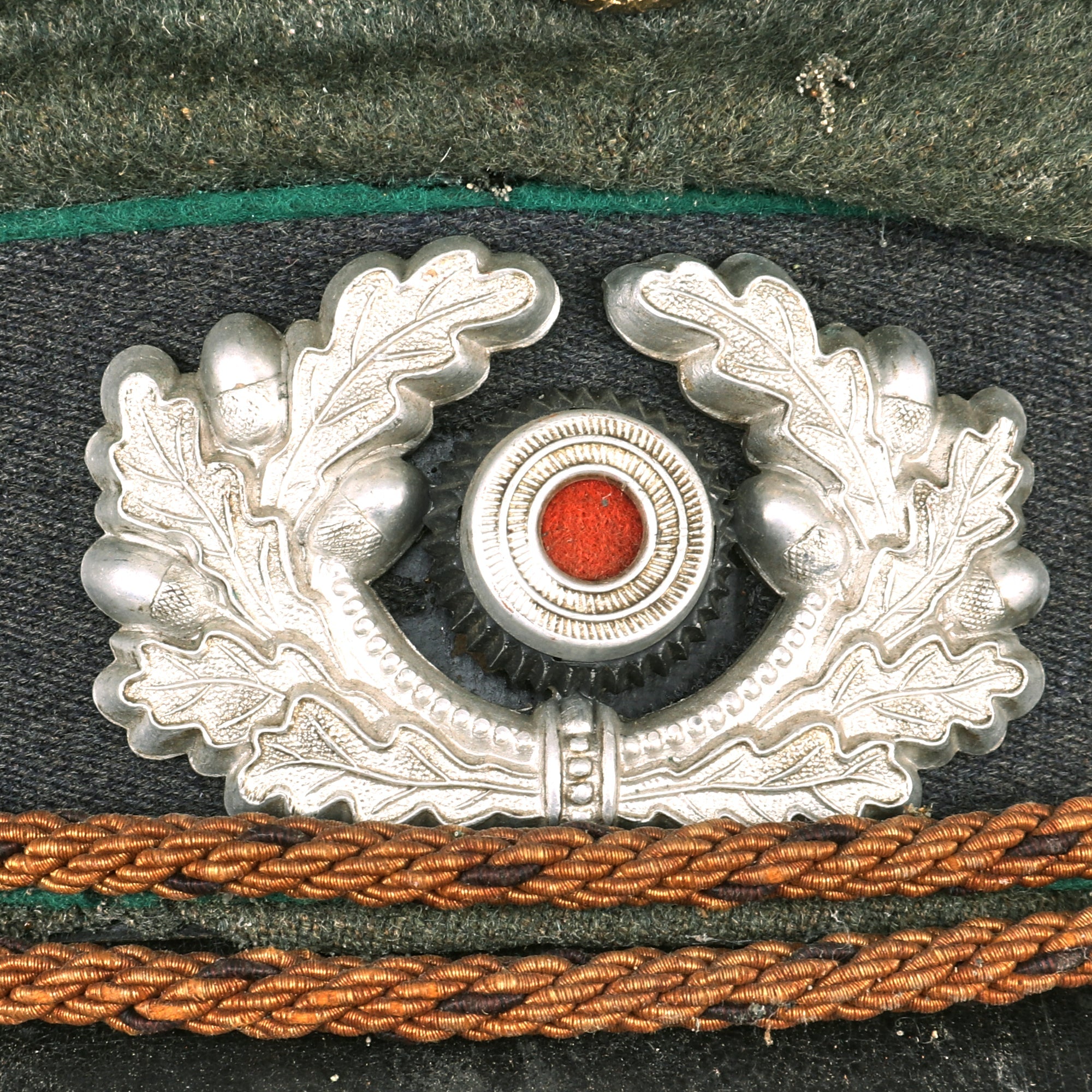 The included Schirmmütze Visor Cap is the correct officers type, with the correct Dunkel-grün (Dark Green) triple piping, and a gold bullion chin strap. It is in rough shape, with the visor completely detached, and it shows wear and moth damage throughout.