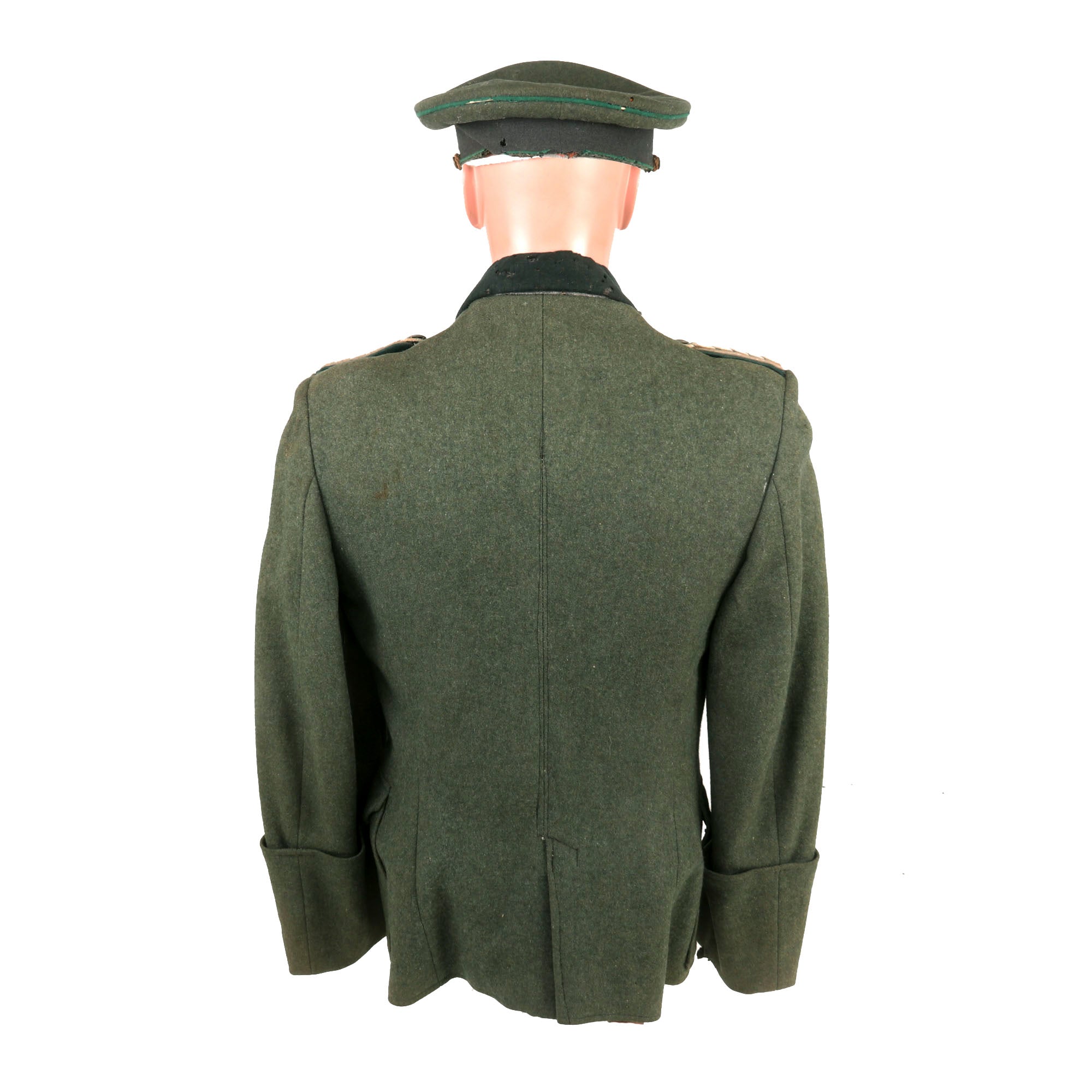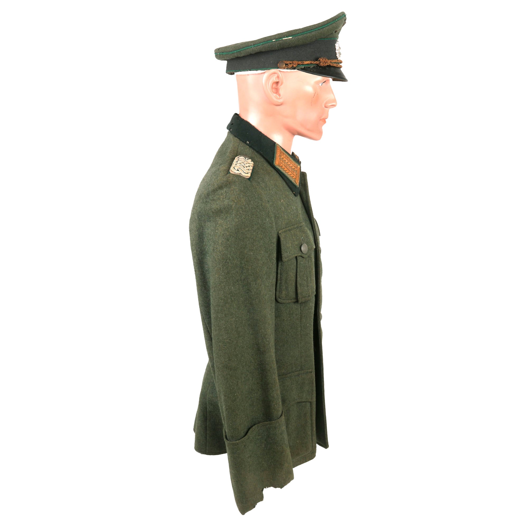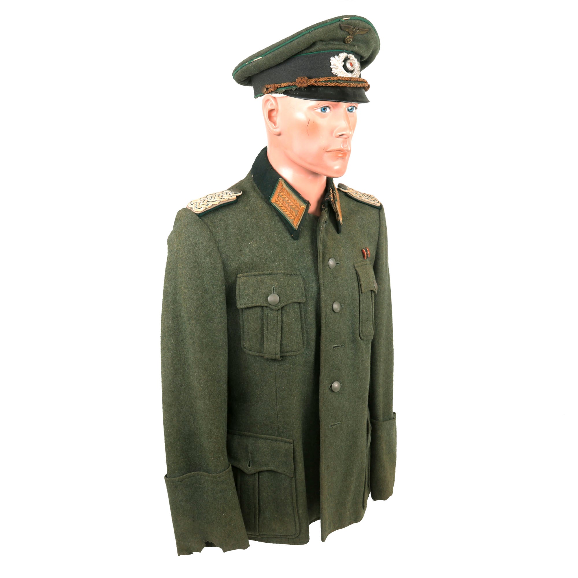 Original Item: Only One Available. This is a very nice early pattern German WWII Heeresverwaltung (Army Administration) M-36 Dienstrock (Service Tunic), complete with the correct Schirmmütze visor cap. These look to have seen long service during the war, and also have suffered some damage from storage and age, mostly in the form of moth damage to the visor cap. They have a great "salty" look that is impossible to duplicate.