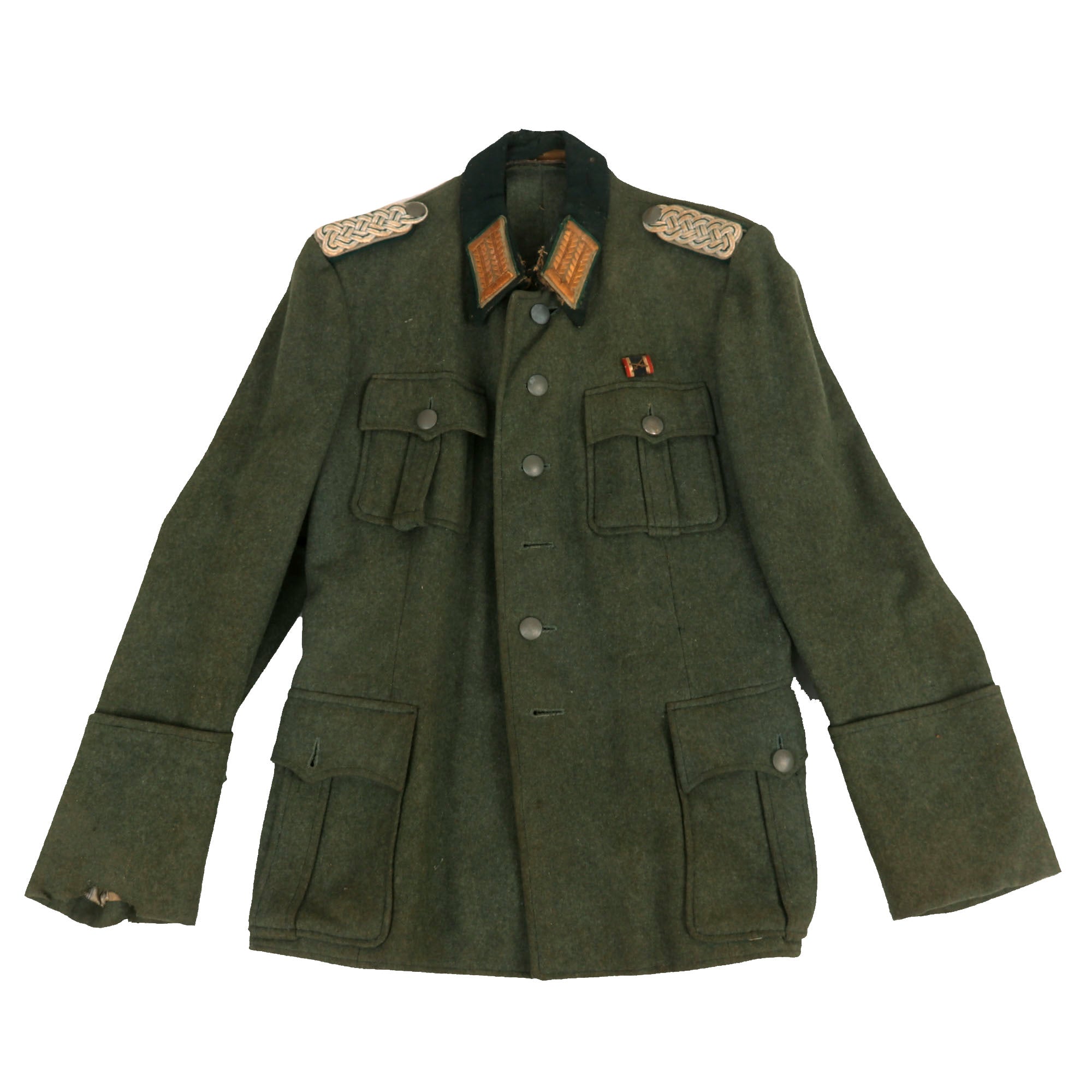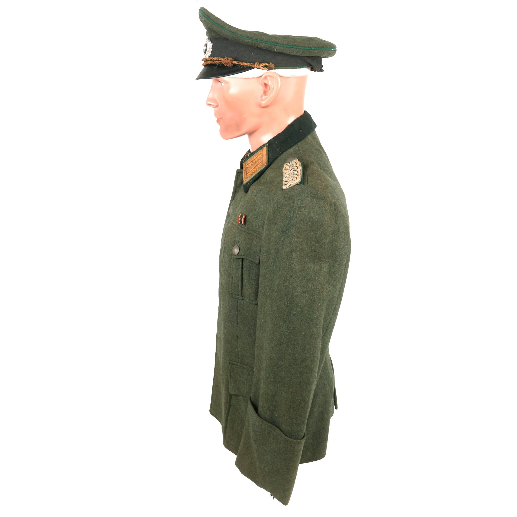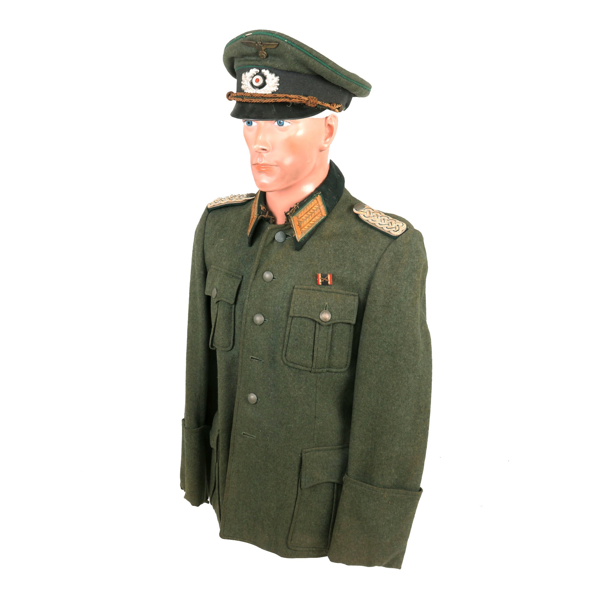 Original Item: Only One Available. This is a very nice early pattern German WWII Heeresverwaltung (Army Administration) M-36 Dienstrock (Service Tunic), complete with the correct Schirmmütze visor cap. These look to have seen long service during the war, and also have suffered some damage from storage and age, mostly in the form of moth damage to the visor cap. They have a great "salty" look that is impossible to duplicate.