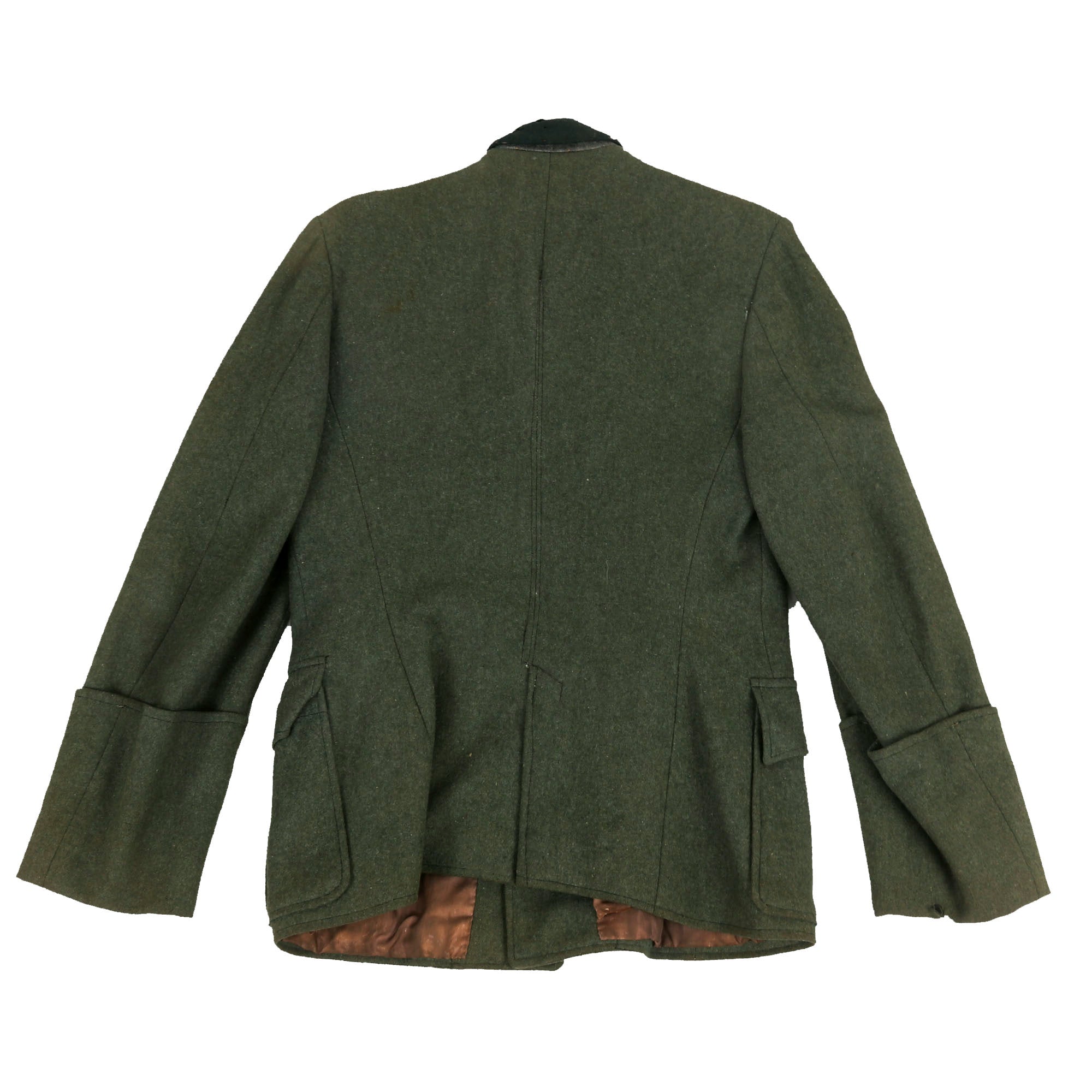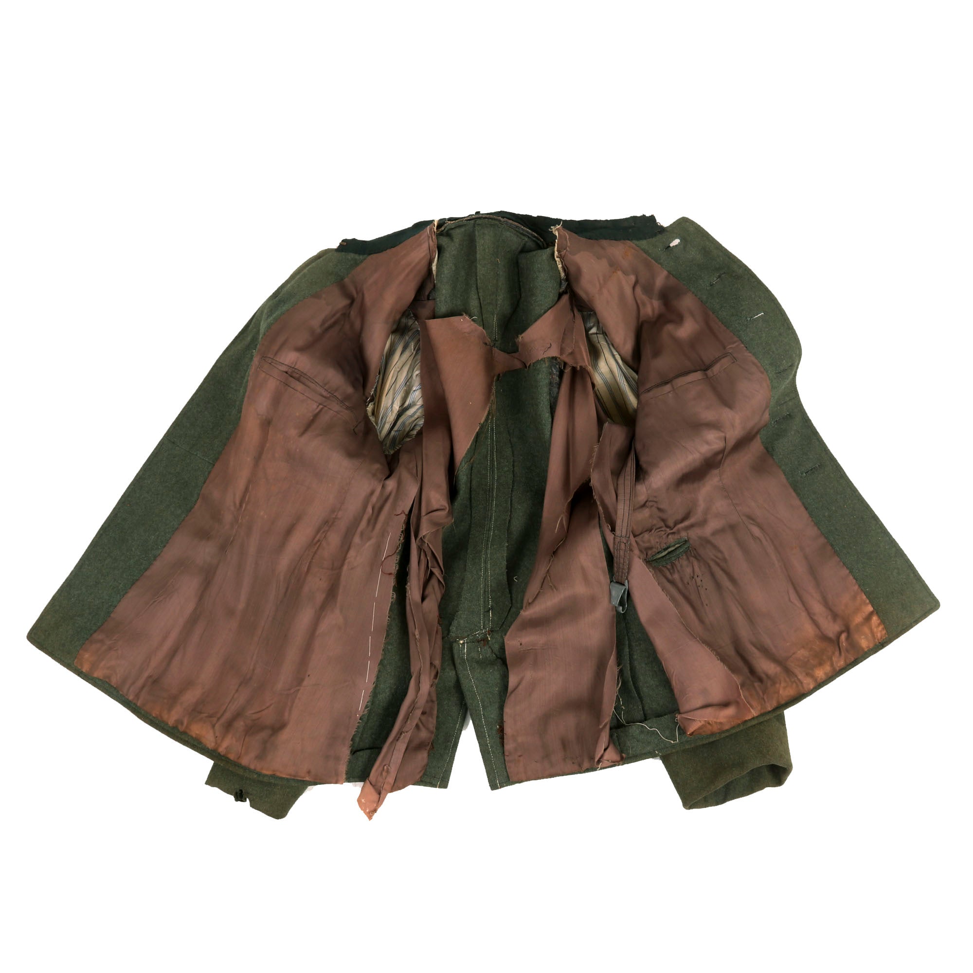 It is adorned with the usual rank and branch insignia used on German Army tunics, though it looks like the breast eagle was either removed or tore off long ago. The insignia used by the Heeresverwaltung were for the most part the same as those used by the regular Heer, except that they would have two different Waffenfarbe (corps colors), the Dunkel-grün (Dark Green) of the Army Administration, and then a separate branch color, which linked to what aspect of the army they were worked for. The shoulder boards and litzen collar tabs would both incorporate this aspect, however as noted before, this is a tunic from 1940 and later, after which light gray was used for the branch color by all members.