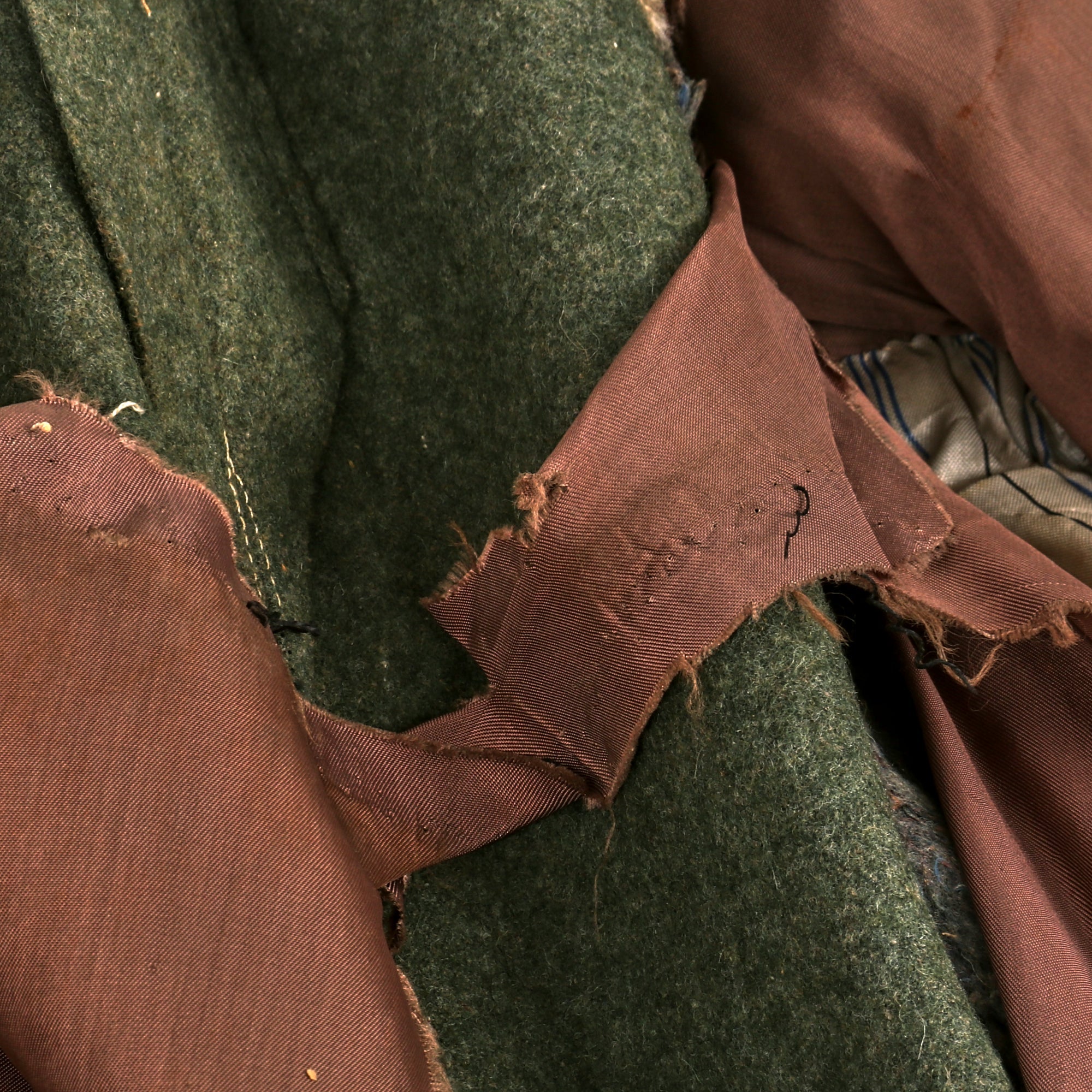 Overall condition is definitely worn, with areas of moth damage around the end of the right sleeve as well as around the collar. It shows overall exterior staining and fading from wear and service.