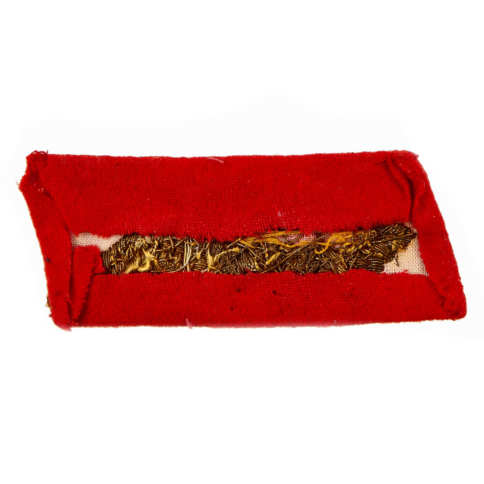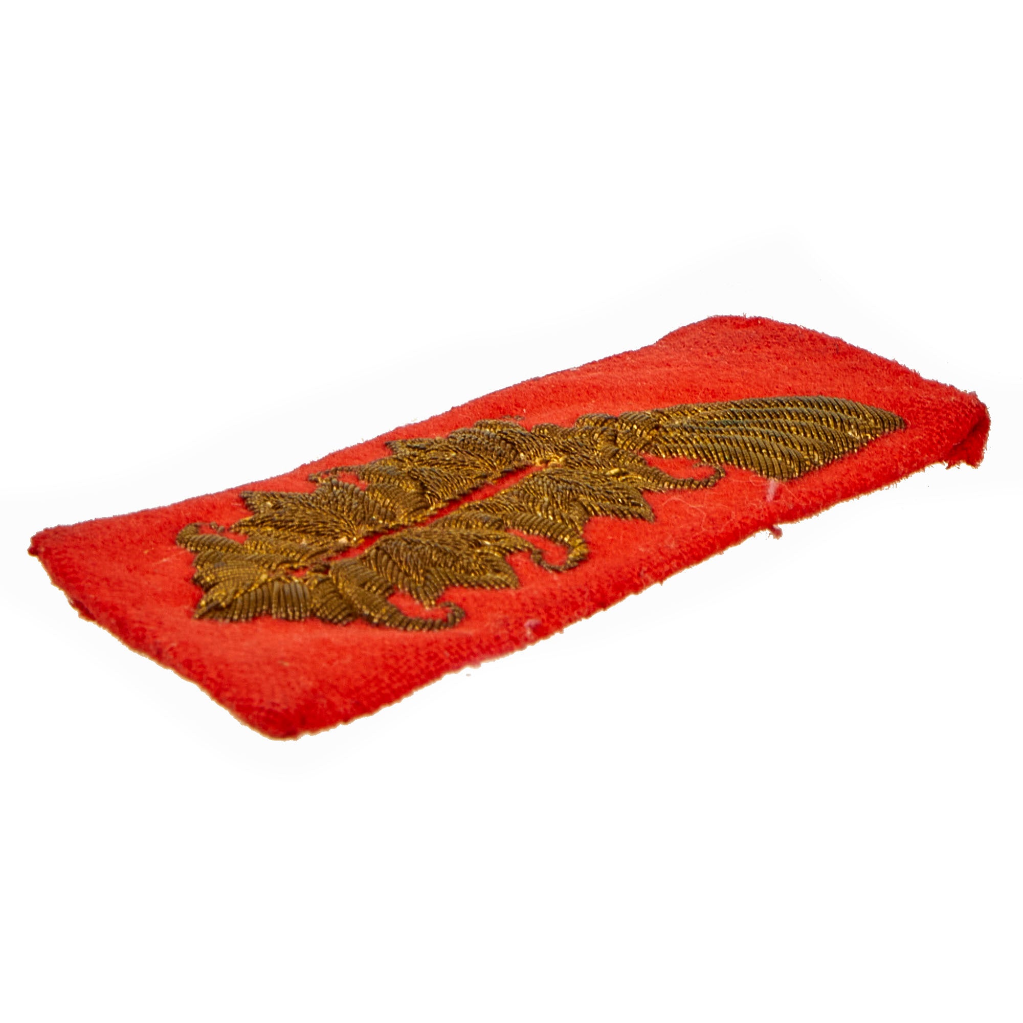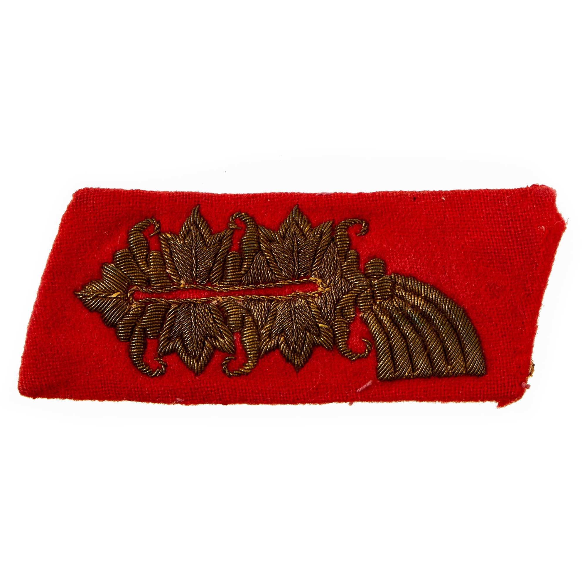 This example is in very good condition, showing a lovely aged patina on the bullion embroidery. The scarlet wool fabric portion shows some wear and possibly light mothing, but nothing major. A very nice example!