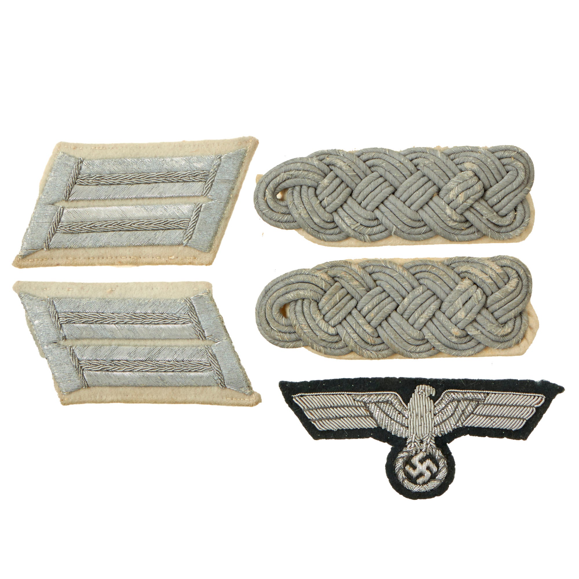 Original Items: Only One Set Available. This is a very nice set of German WWII Heer Army Infantry Major's dress uniform insignia, consisting of the correct Shoulderboards, collar tabs, and a silver Bullion Hoheitszeichen (National Eagle), also known as the Wehrmachtsadler (Armed Forces Eagle). Most German insignia are quite specific, giving not just the rank, but also the branch and corps. The set is in great condition, and would make a great addition to any uniform devoid of rank insignia.