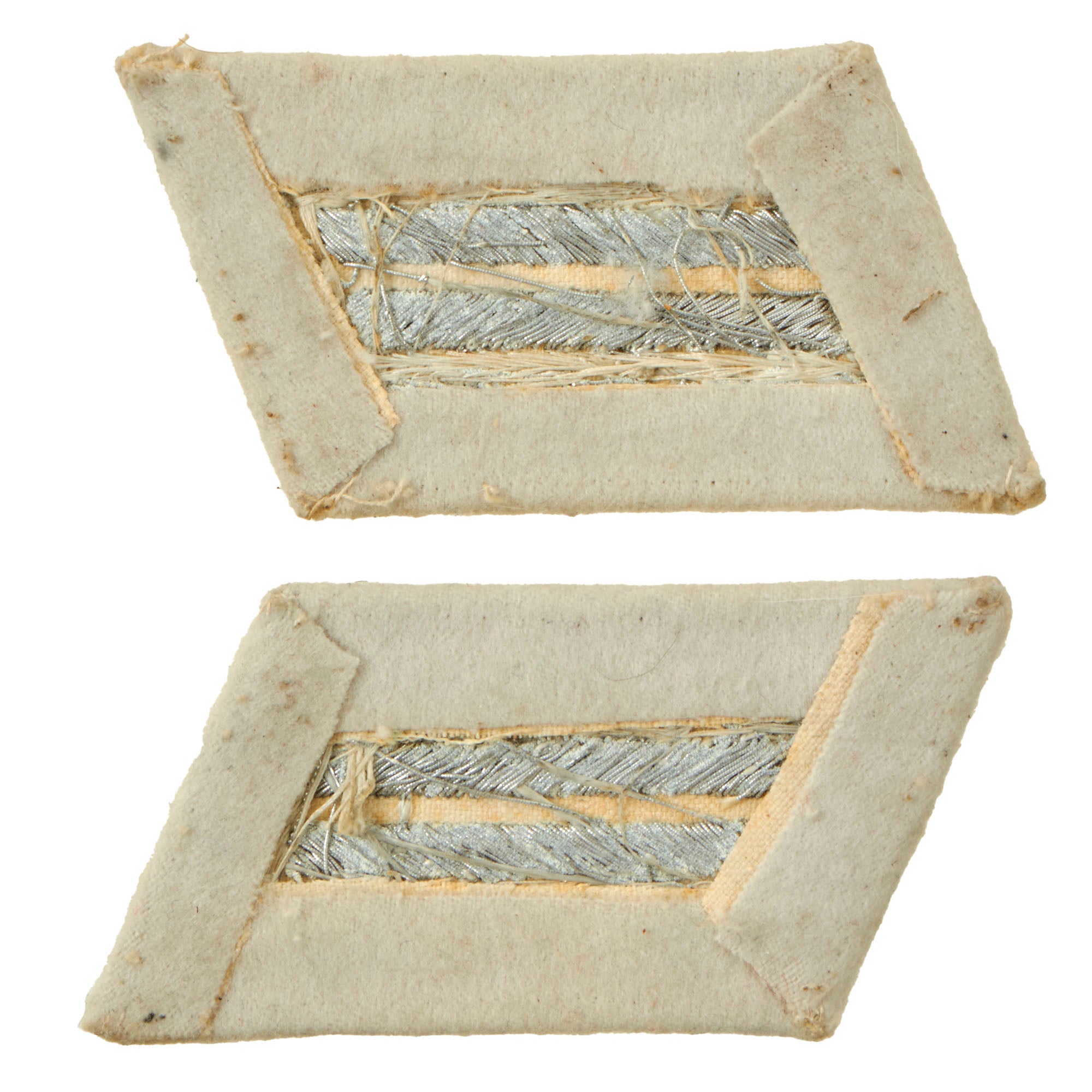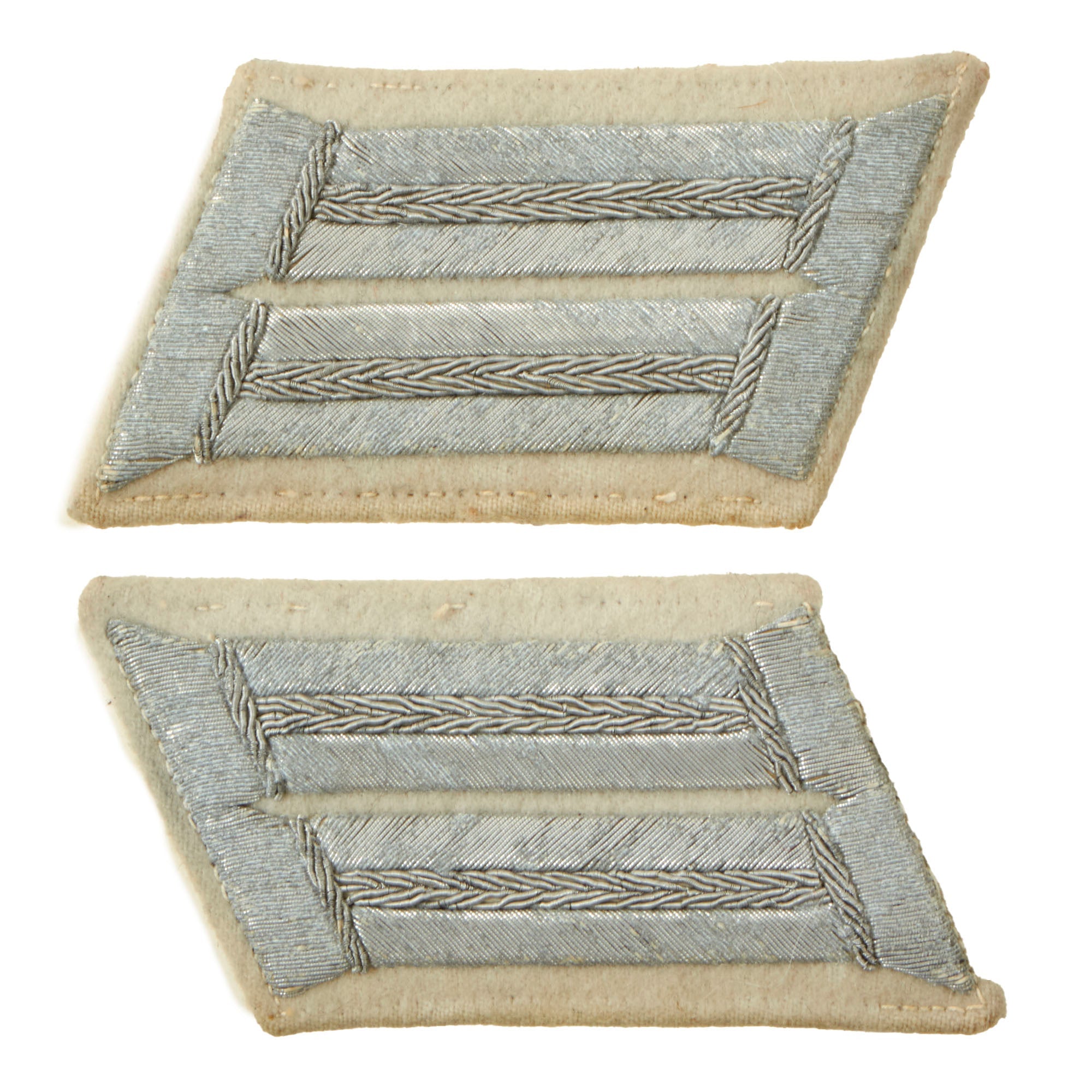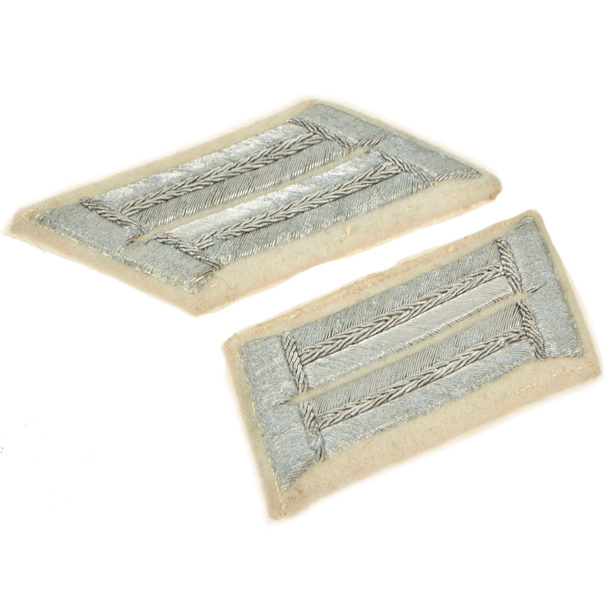 - One PAIR (left and right) of Heer Army Infantry Stabsoffiziere (Staff or Senior Officer) Collar Tabs / Patches. Known as Kragenpatte in German, these were attached to the collars to indicate the rank and branch of the wearer. These have two parallel bullion Litzenspiegel, symbolizing the double braid of the 19th century, fully executed with hand embroidered silver bullion. The wool backing is white, the correct Waffenfarbe (Corps Color) for infantry and motorized infantry.