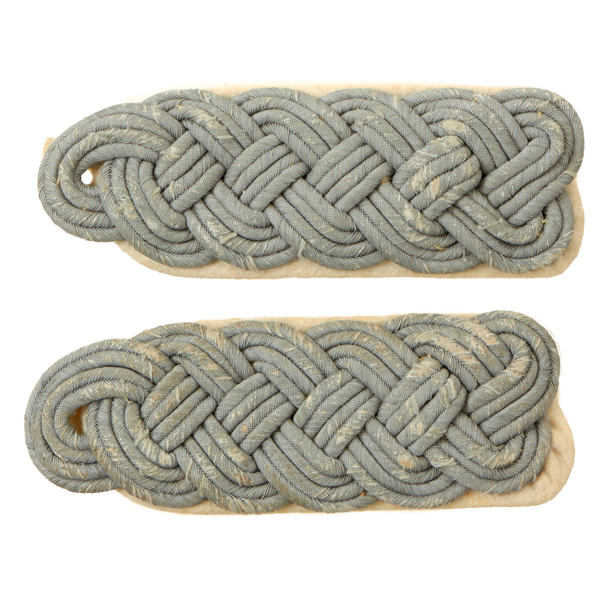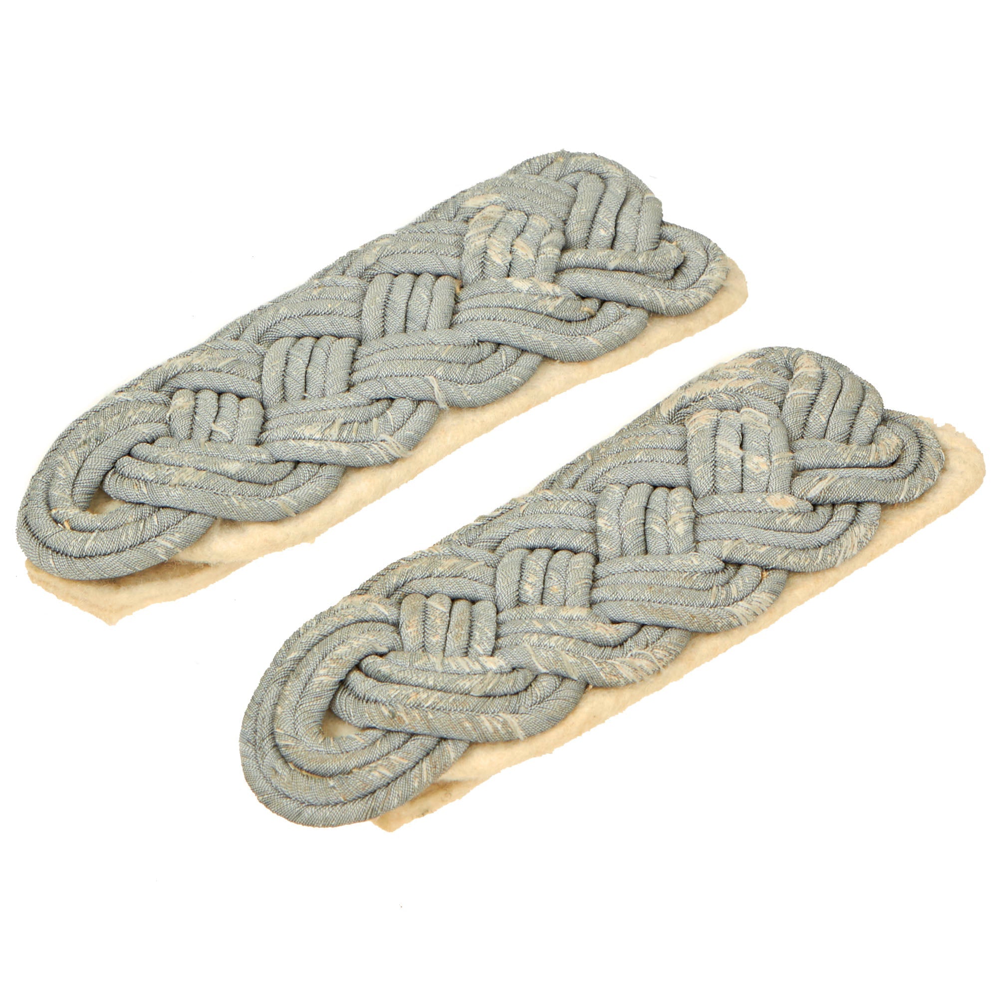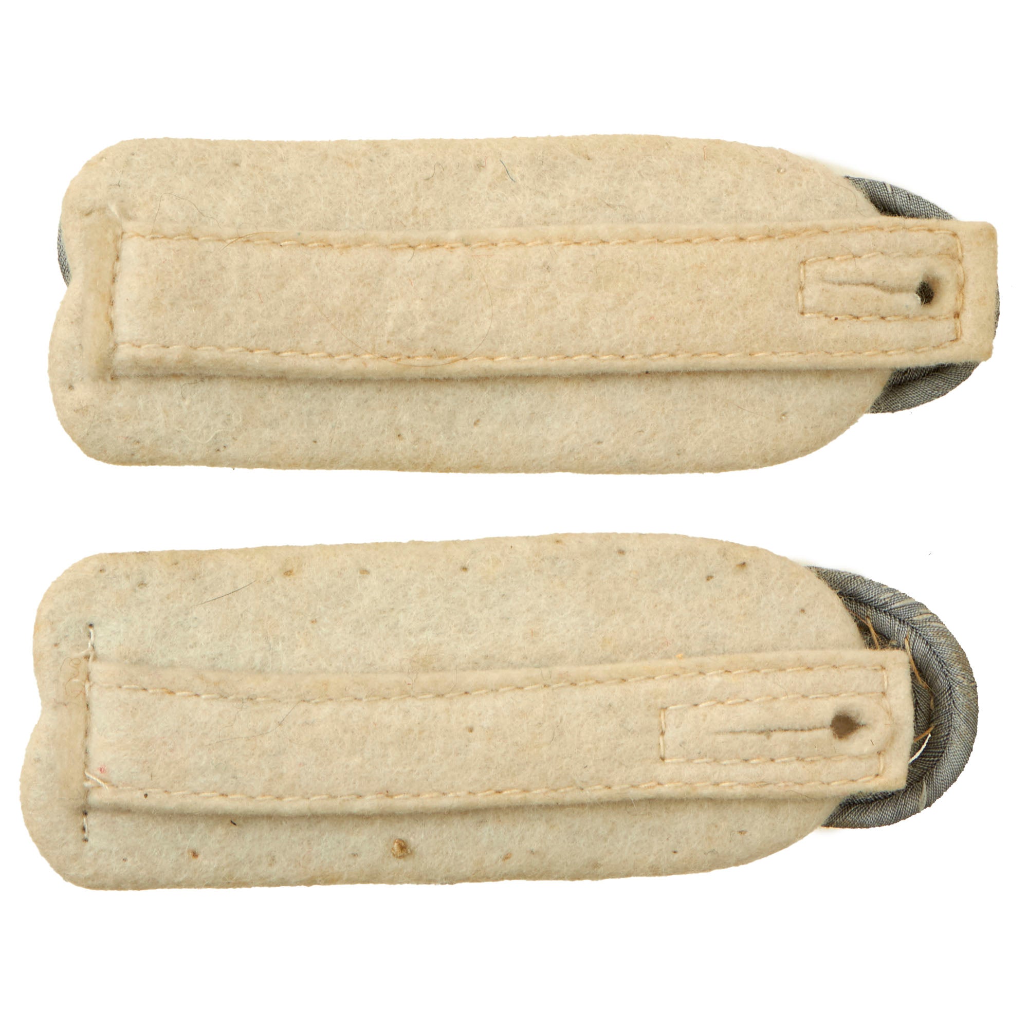 - One PAIR of Heer Army Infantry button-attached Stabsoffizier schulterklappen (Field-grade Officer shoulder boards), constructed with two rows of fine silver flatware "Russia Braid" double piping, which are plaited together to form a loop around the buttonhole. They are in very good condition, and do not have any rank "pips" installed, indicating the lowest staff officer rank of Major, equivalent to the same rank in the U.S. and U.K. armies. The have white felt fabric backing and attachment straps, which shows around the entire perimeter, the correct Waffenfarbe (Corps Color) for infantry and motorized infantry.