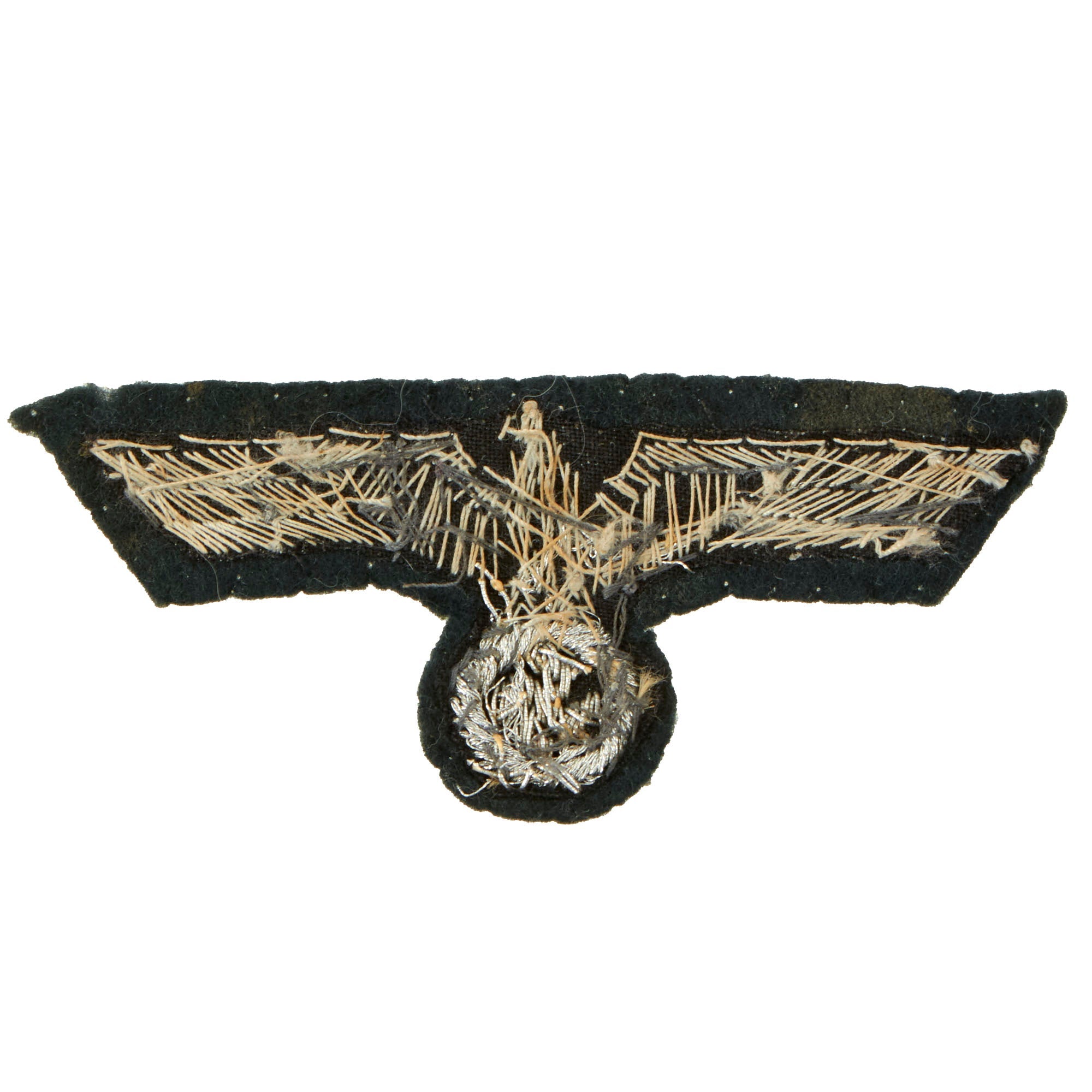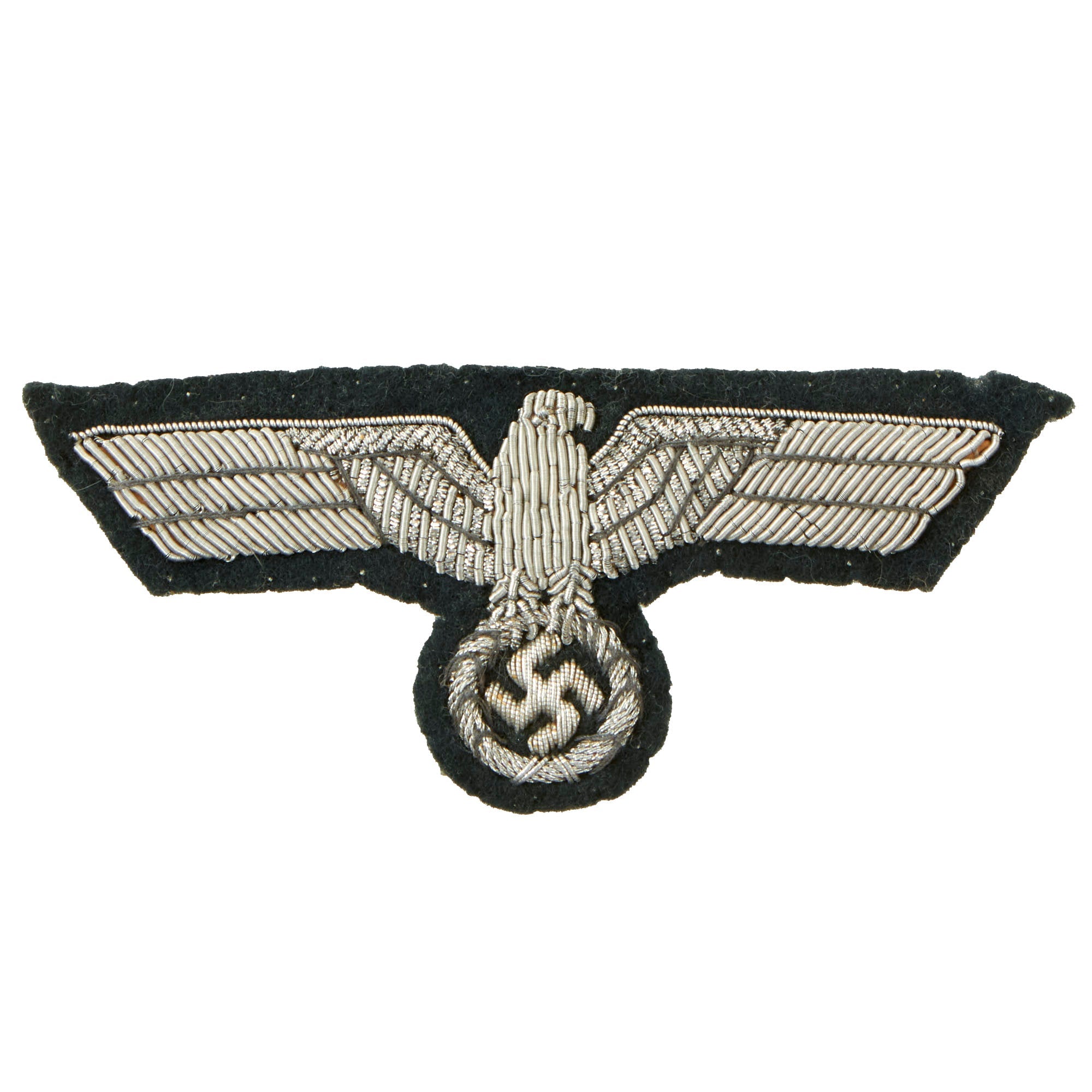 - One Silver Bullion Hand Embroidered Wehrmachtsadler (Armed Forces Eagle) breast eagle. It is the early pattern type, with a flaschengrün (dark bottle-green) "badge cloth" backing.