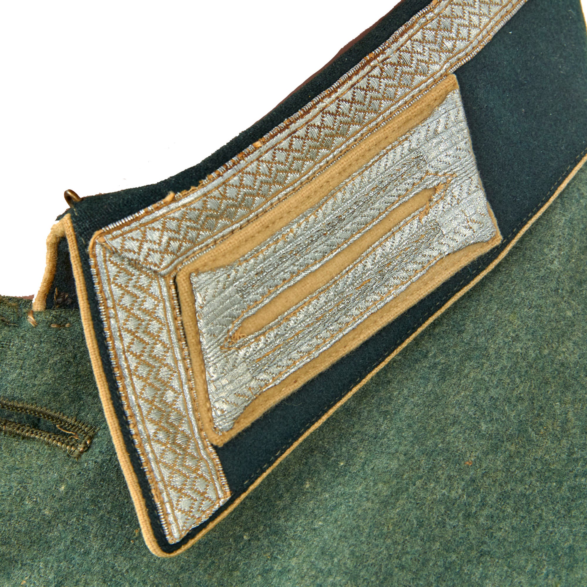 Seven pebbled aluminum buttons adorn the front of the tunic and all appear to be originally attached, and the collar still retains the two hook and loop fasteners. There originally was an eighth button at the bottom to match the eight button holes, but it unfortunately has pulled off. All of the remaining buttons are marked on the back, though we cannot make out the maker. The lower French style cuffs of the sleeves have a dark bottle green based wool, and are adorned with white piping and NCO Tress flat silver borders. The sleeve litzen are the correct silver on white for infantry.
