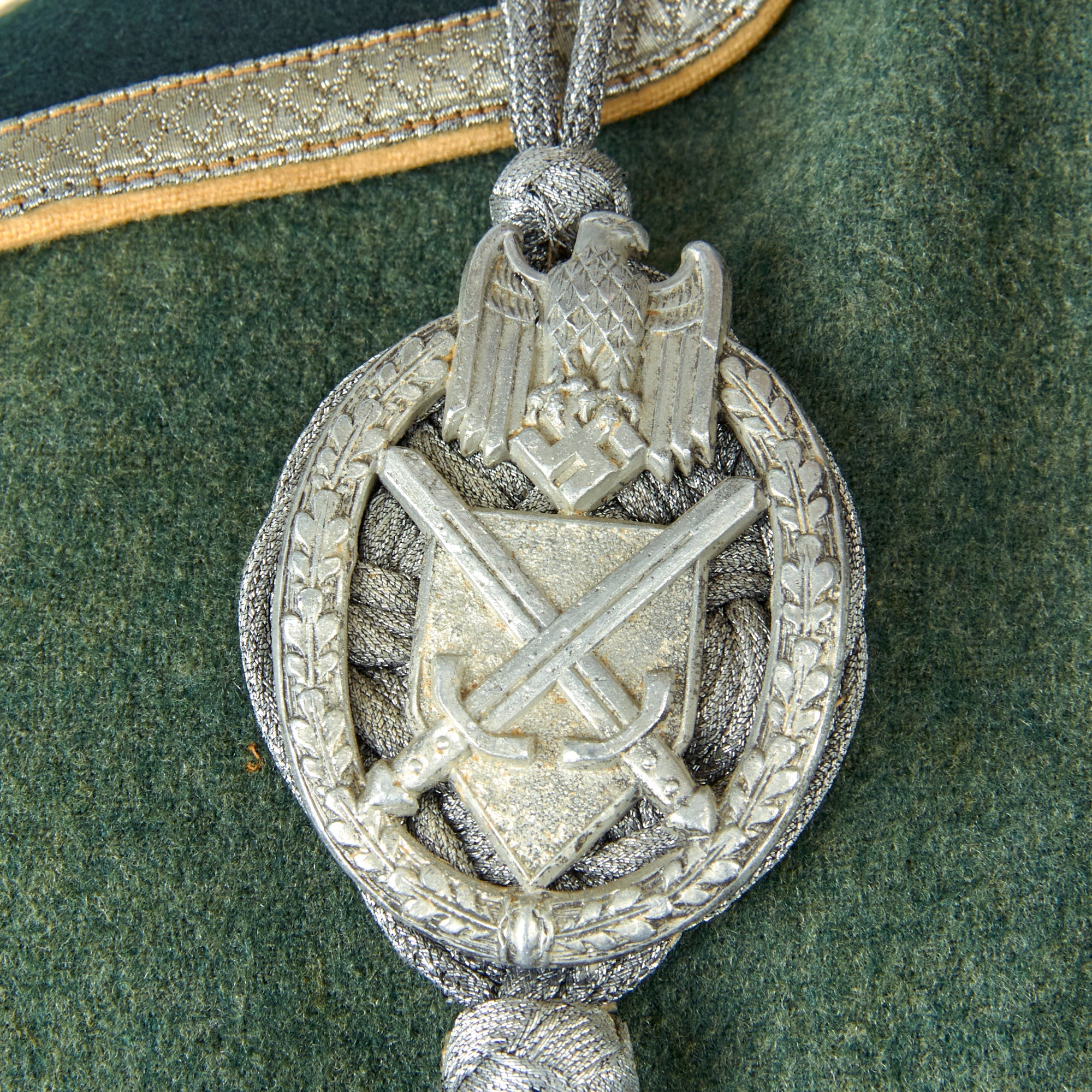 Featured on the right shoulder is a lovely 2nd Pattern Heer Army Marksmanship Lanyard without subsequent award acorn devices. This later version has the Heer Eagle on a shield, with the wreath and swords of the later version. The condition is very good, showing only light wear, and a bit of fraying in the center of the blade. The left chest has a two award medal bar indicating that they received the Iron Cross 1939 Second Class EKII, and the War Merit Cross 2nd Class with Swords KvKII. Below this is a Wound badge in black, for 1-2 wounds.