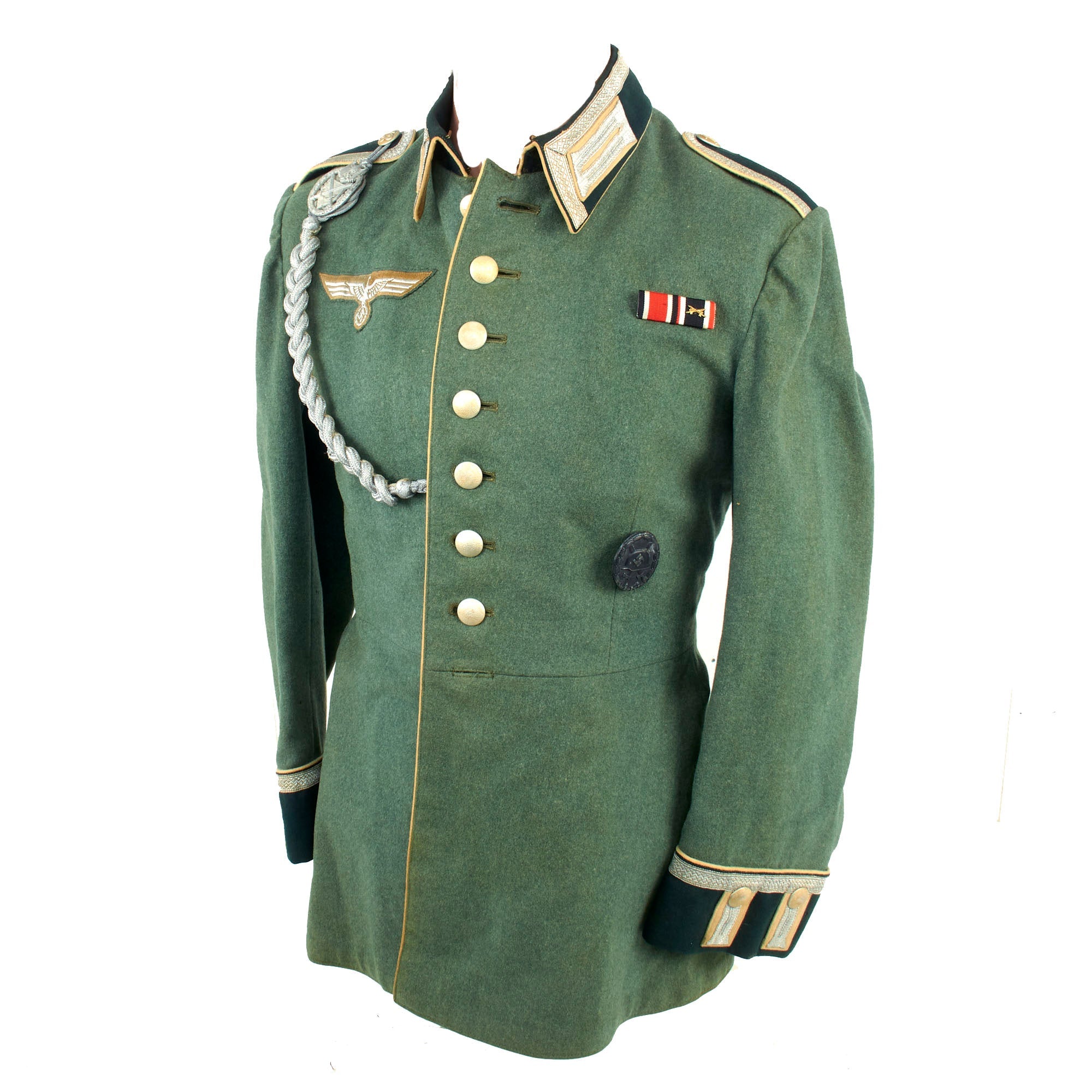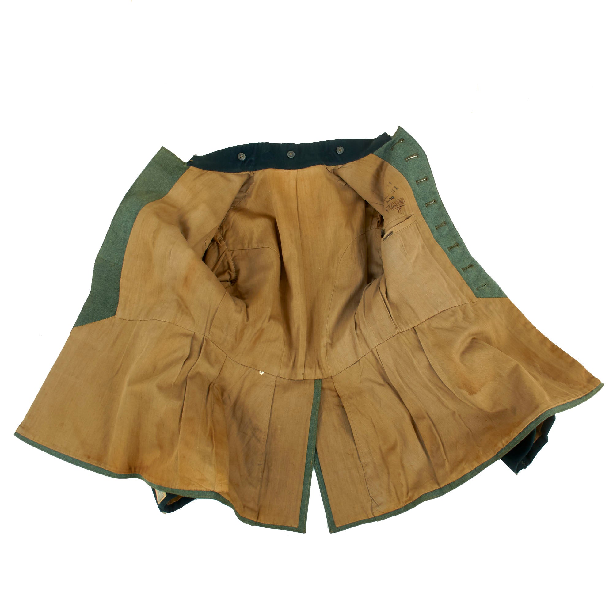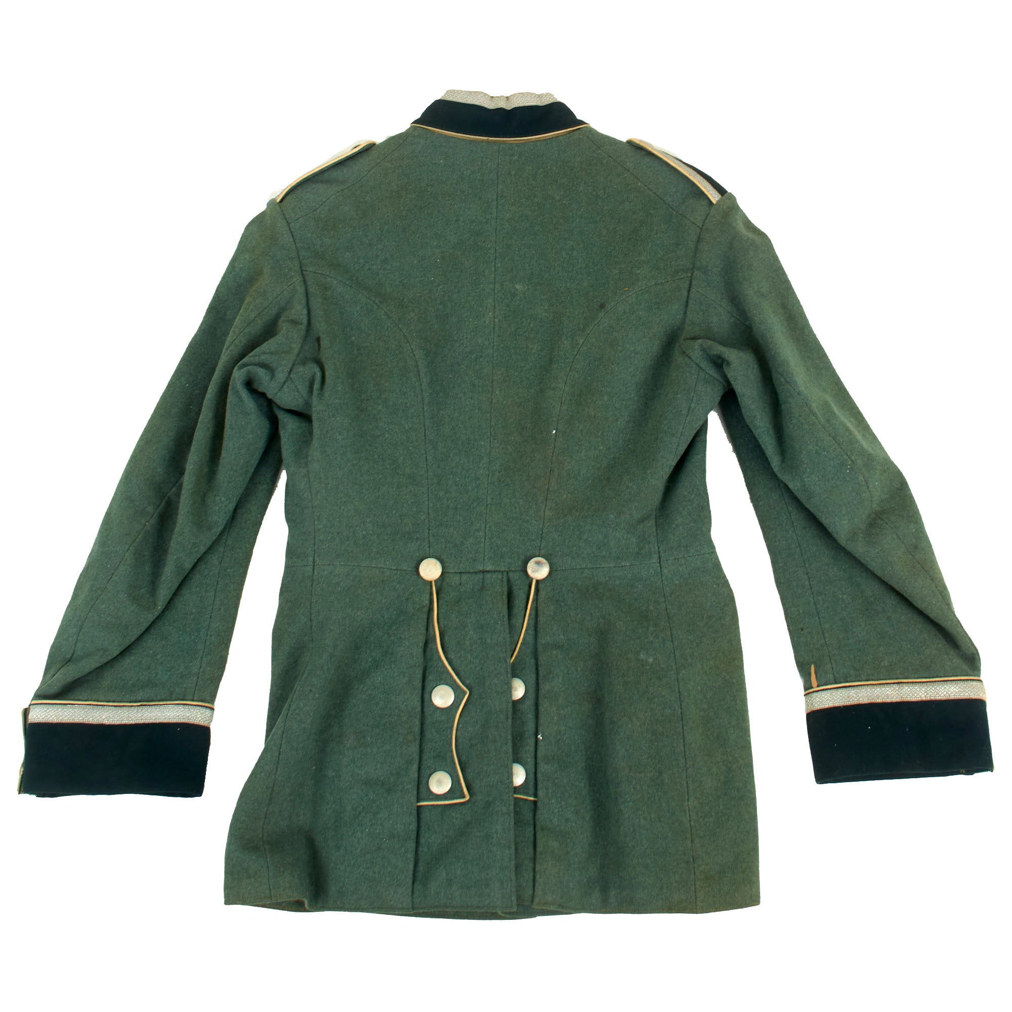 Original Item: Only One Available. This is a very good condition Heer Infantry Unteroffiziere ohne Portepee (Junior NCO) M35 Waffenrock Dress Tunic. The base material of the uniform is made of a fine feldgrau colored wool. The wool shows signs of light use, with just a few small moth holes, and no major wear or tears. The collar is wrapped in the correct flaschengrün (dark bottle-green) wool, decorated a strip of 14mm flat diamond pattern silver flatwire tresse (Unteroffoziers-Tressen), sewn around the collar border. The base material of the two dress litzen on each side of the collar opening is Weiß (white), which was the Waffenfarbe (corps color) during WWII for Infanterie (Infantry) and Motorisiert Infanterie (Motorized Infantry). The collar, front closure, and other areas of the tunic bear piping of the same color. The two litzen themselves are woven from a fine silver flatwire thread. The collar shows some light wear with a bit of the underlying weave visible, but no major damage or stitching loss.