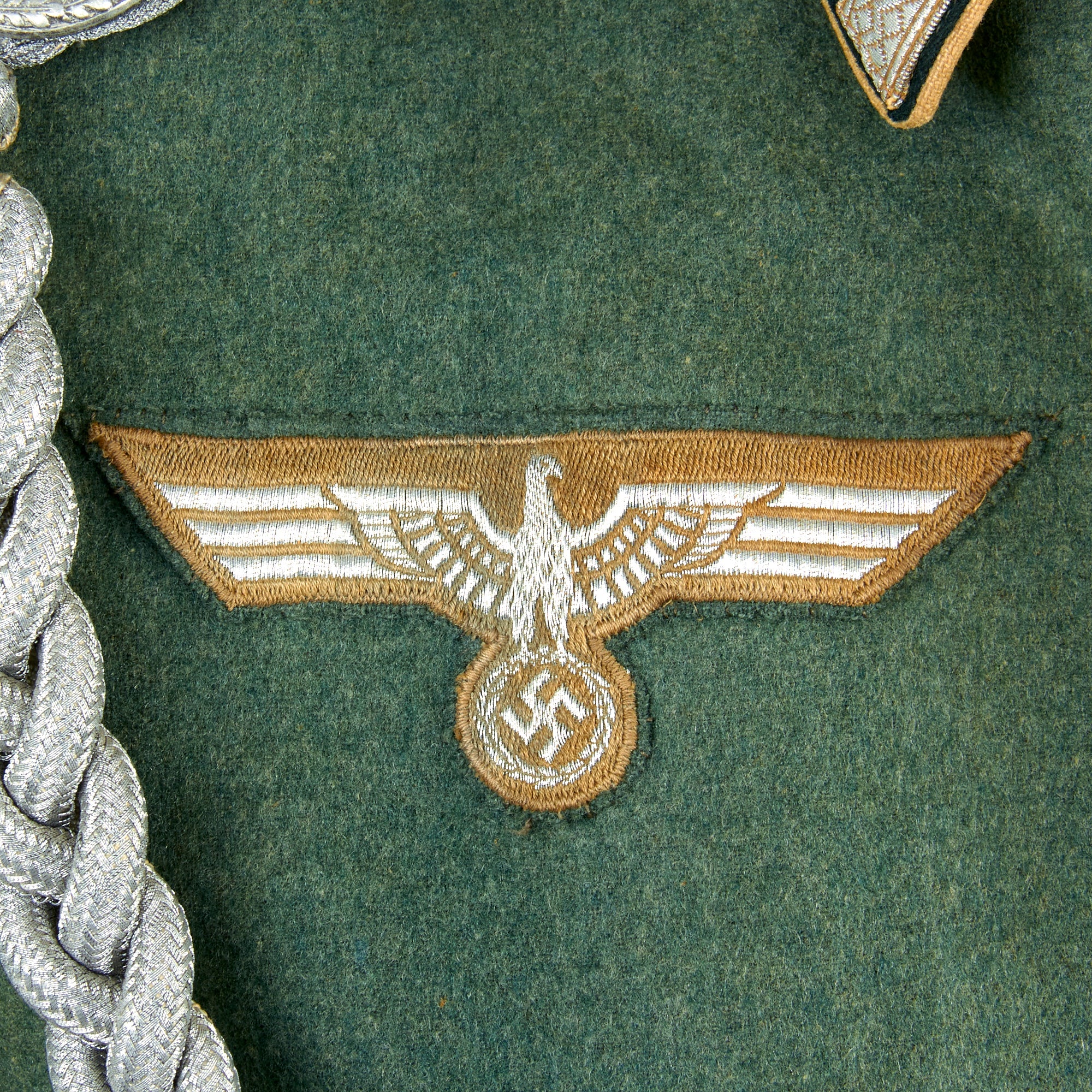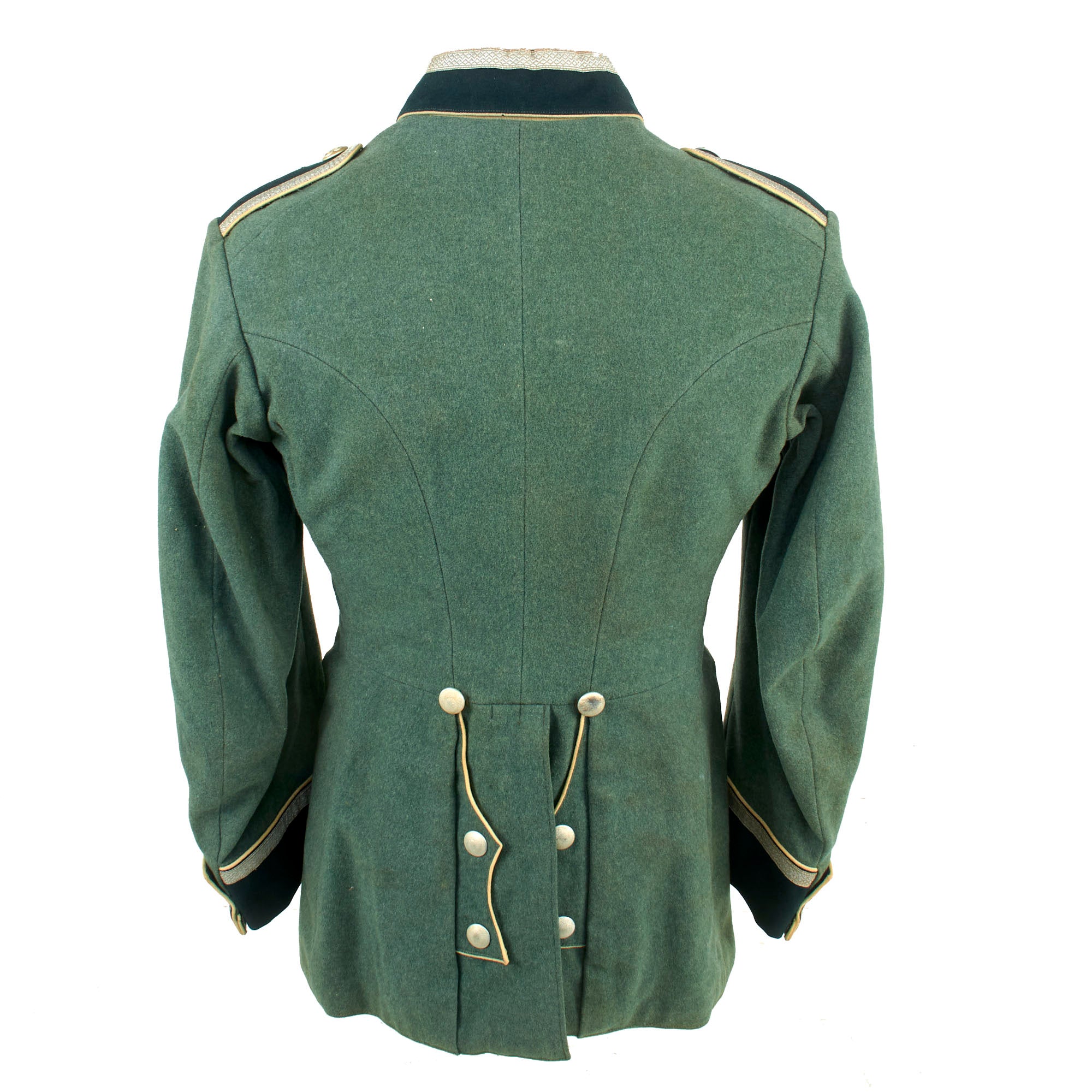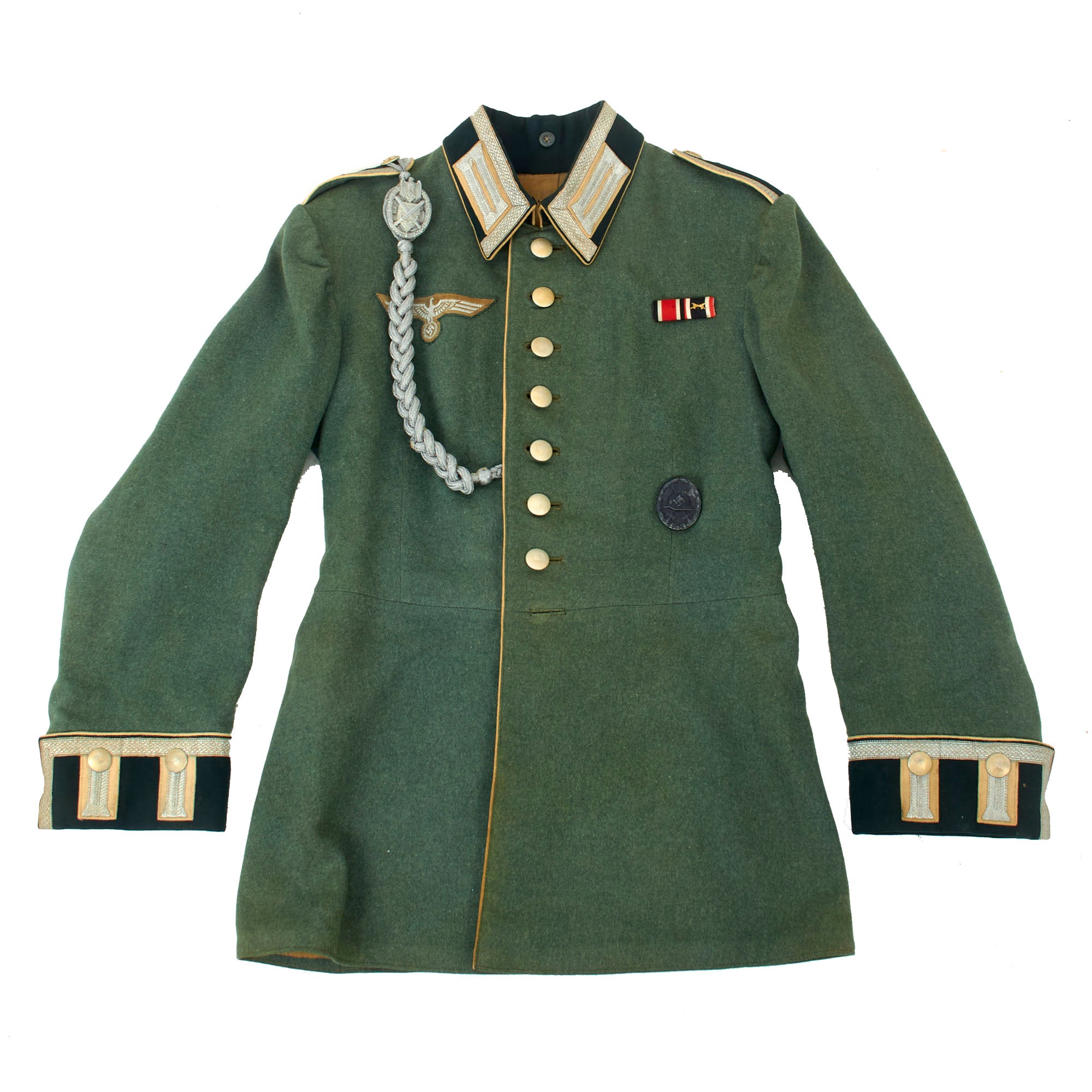 Original Item: Only One Available. This is a very good condition Heer Infantry Unteroffiziere ohne Portepee (Junior NCO) M35 Waffenrock Dress Tunic. The base material of the uniform is made of a fine feldgrau colored wool. The wool shows signs of light use, with just a few small moth holes, and no major wear or tears. The collar is wrapped in the correct flaschengrün (dark bottle-green) wool, decorated a strip of 14mm flat diamond pattern silver flatwire tresse (Unteroffoziers-Tressen), sewn around the collar border. The base material of the two dress litzen on each side of the collar opening is Weiß (white), which was the Waffenfarbe (corps color) during WWII for Infanterie (Infantry) and Motorisiert Infanterie (Motorized Infantry). The collar, front closure, and other areas of the tunic bear piping of the same color. The two litzen themselves are woven from a fine silver flatwire thread. The collar shows some light wear with a bit of the underlying weave visible, but no major damage or stitching loss.