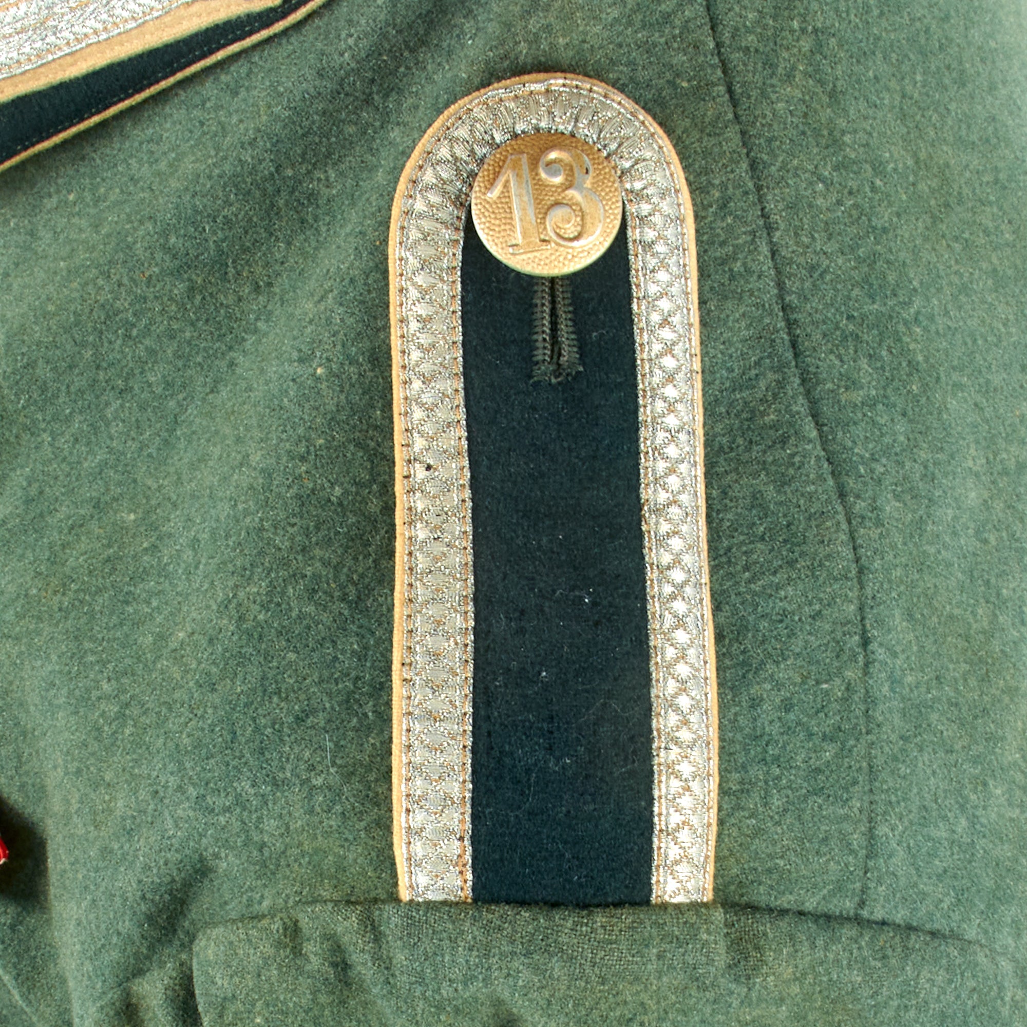 The “sew-in” style NCO schulterklappen (shoulder straps) of this Waffenrock have a dark bottle green base wool, with the correct NCO Tresse sewn around the edge except where they join the sleeve, and are piped in white. Both retaining buttons are still present, and are marked with unit number 13, which would usually be for a company. As there are no pips or other devices, these straps indicate the NCO rank of Unteroffizier, equivalent to a U.S. Army Sergeant. The front breast eagle is a correct NCO Pattern machine executed in silver wire, very neatly hand stitched to the chest in a fashion typical of wartime German tailor work.