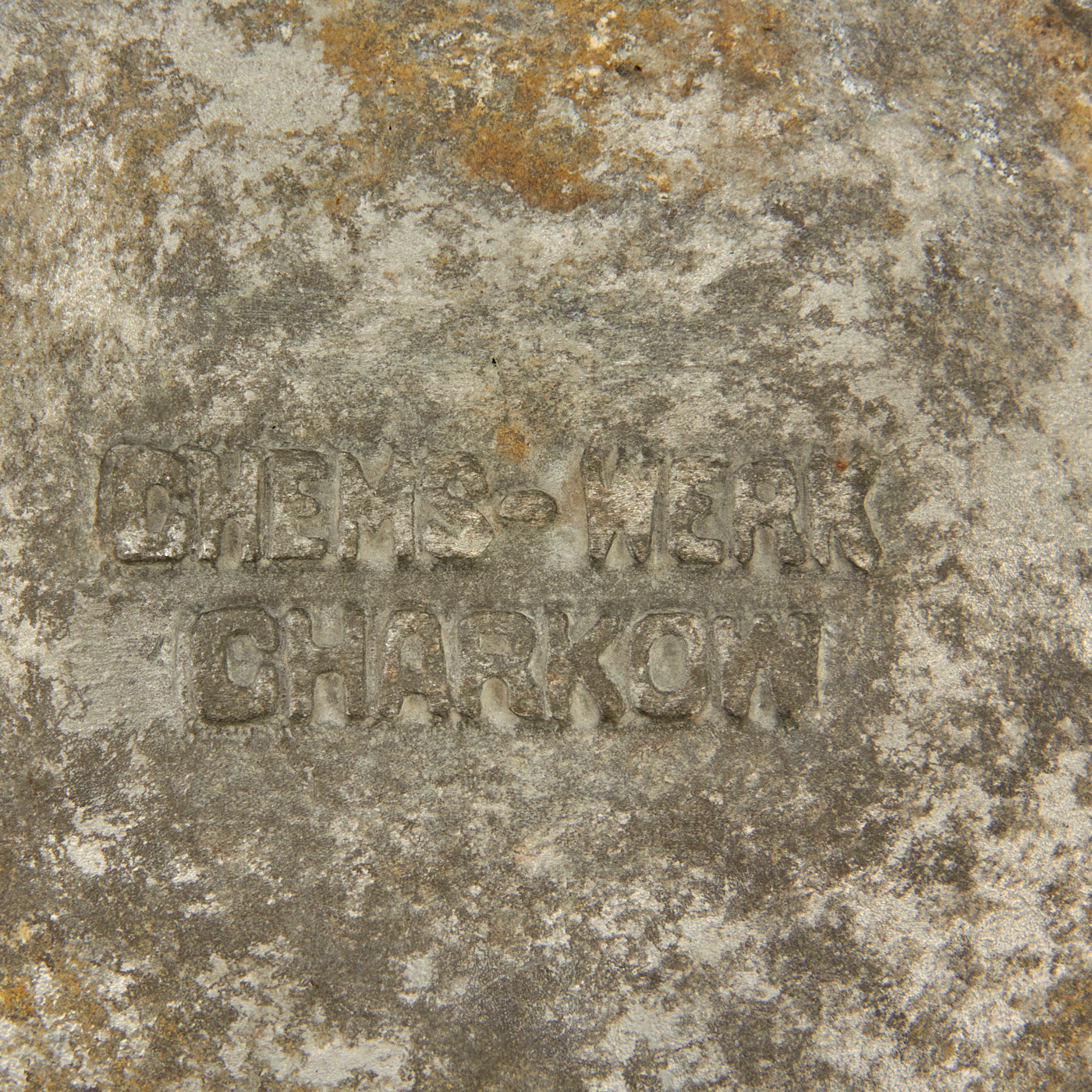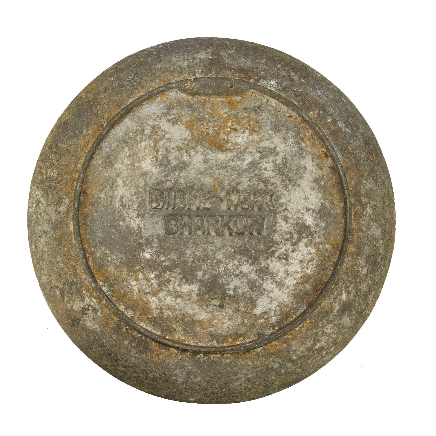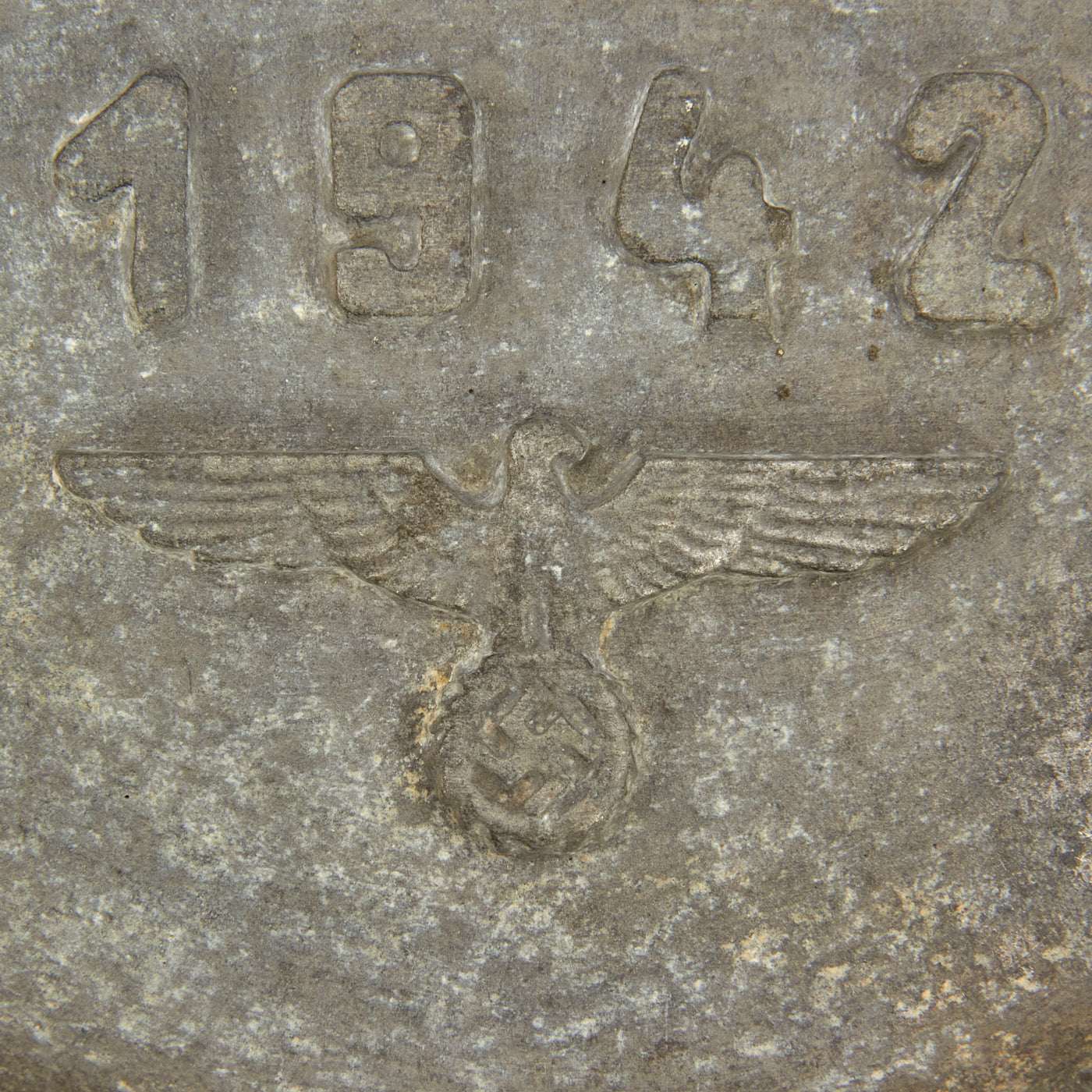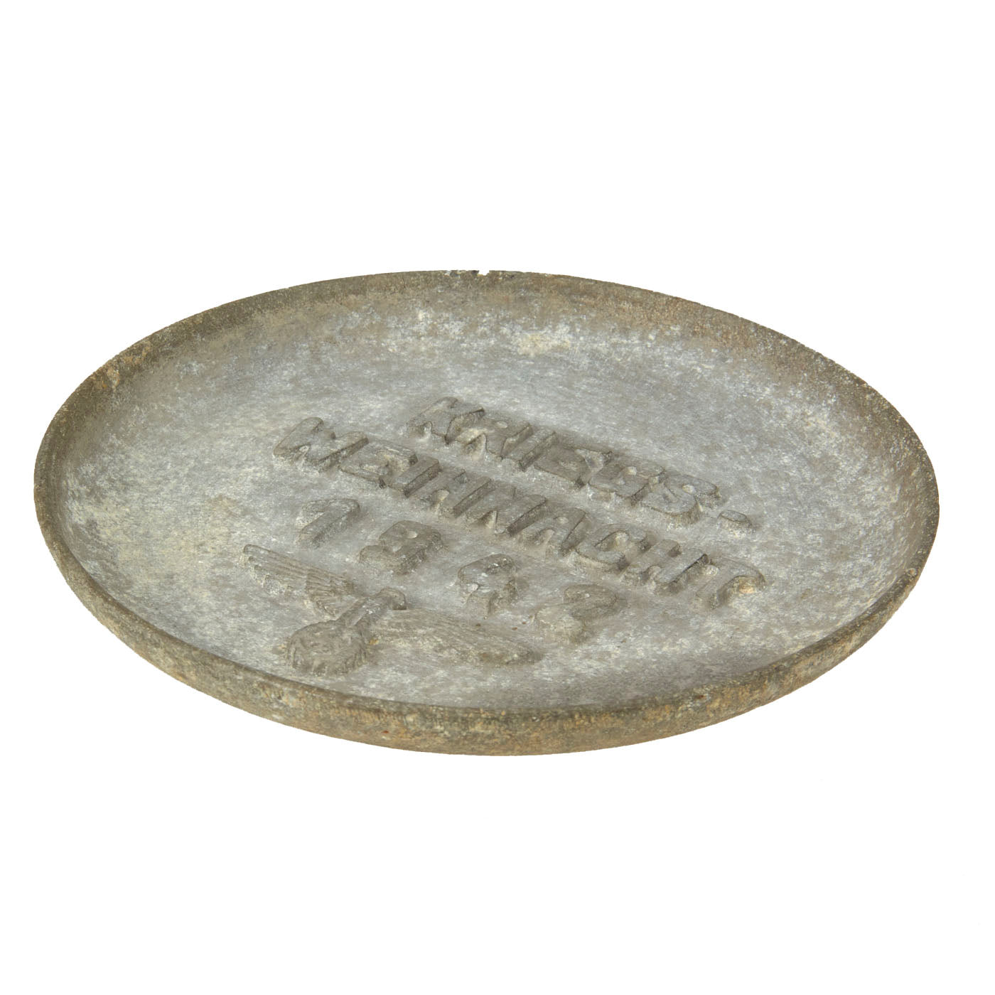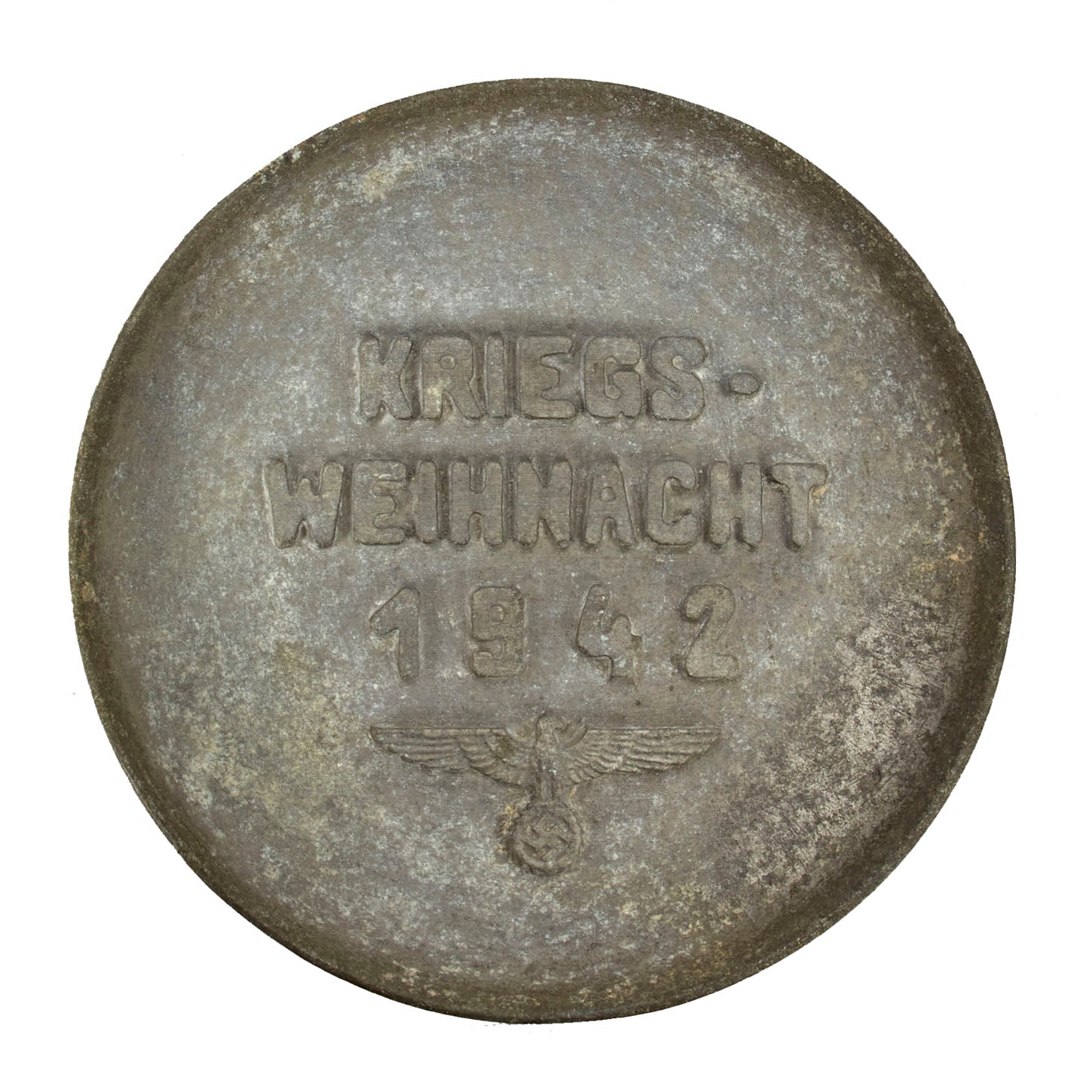 This plate is a lovely reminder of the Christmas of 1942. It measures approximately 8 inches across and features KRIEGS-WEIHNACHT 1942 with the German Heer eagle beneath it. It appears to have been made of aluminum and was finished in a silver plating. Unfortunately almost all of the original plating is long worn away, but the message and eagle are still very easily recognizable. The reverse of the plate features makers information for CHEMS-WERK CHARKOW. We have not been able to determine if this is the maker's information or location in which this plate originated from.