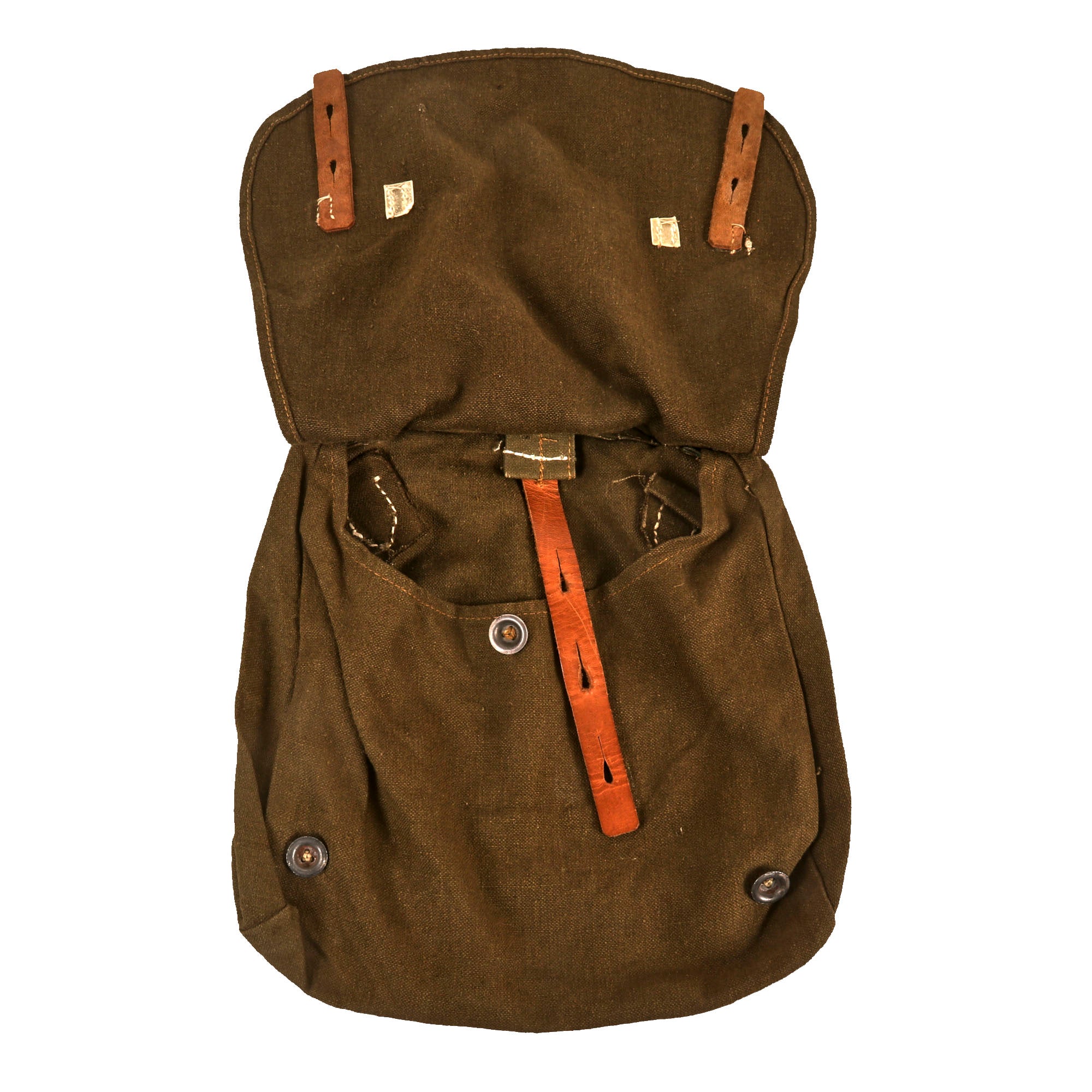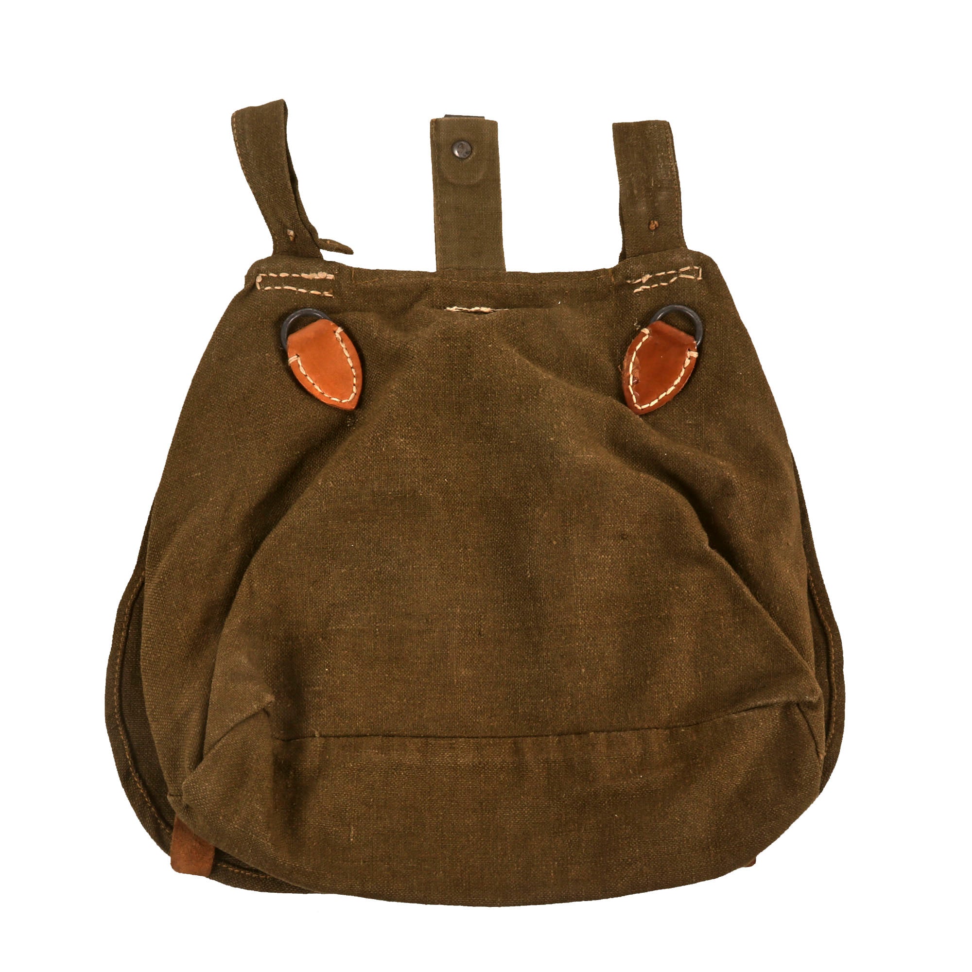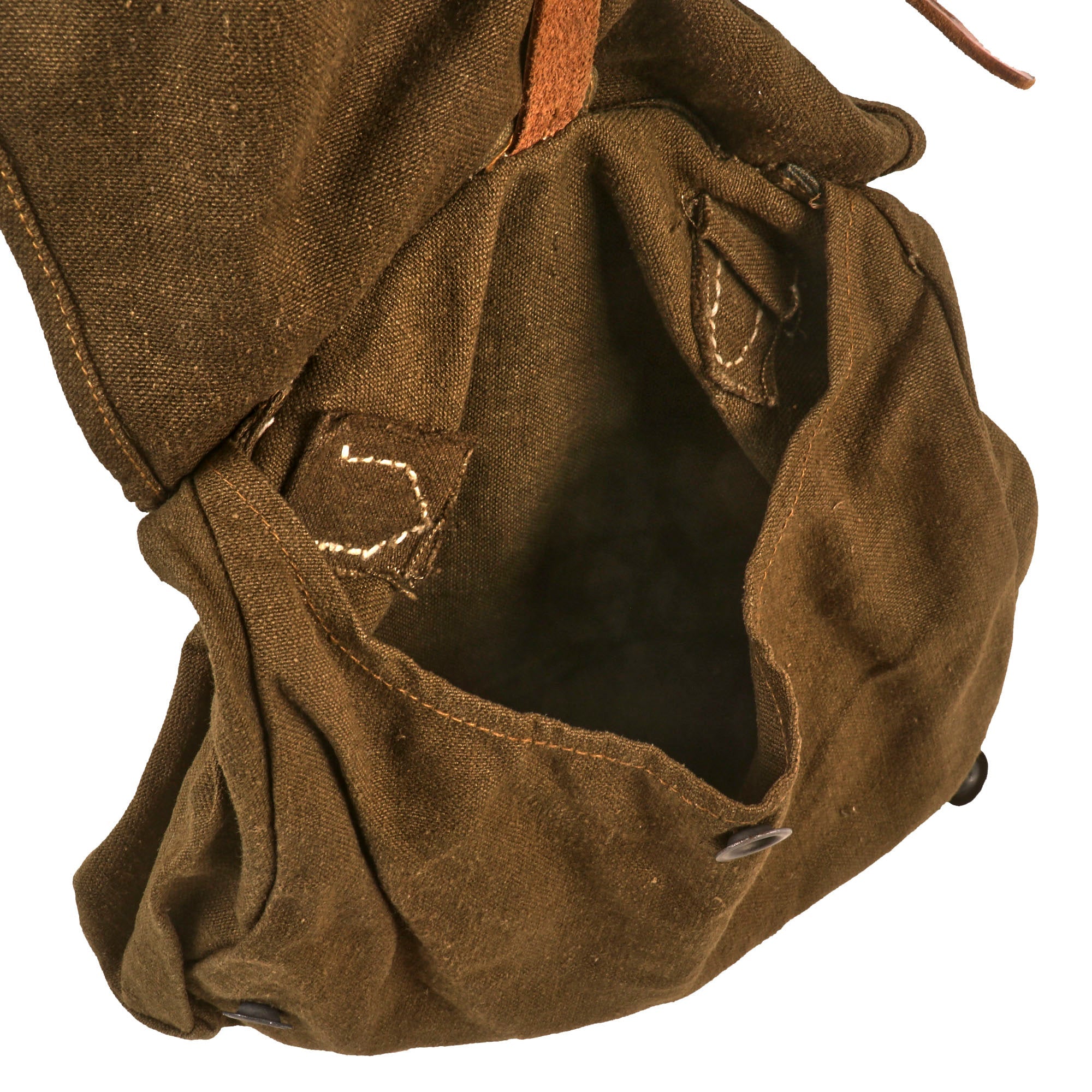 Original Item: Only One Available. This is a wonderful unissued example of an M31 Haversack, also known as the “bread bag”. The bag itself does appear to be complete and has all original buttons, clips and leather securing tabs retained. The canvas body still has a lovely color to it and is similar in appearance to the tropical bread bags but has leather straps instead of the iconic webbing. These were brought out later in the war circa 1943-1944. This is one of the most phenomenal unissued examples we have ever seen.
