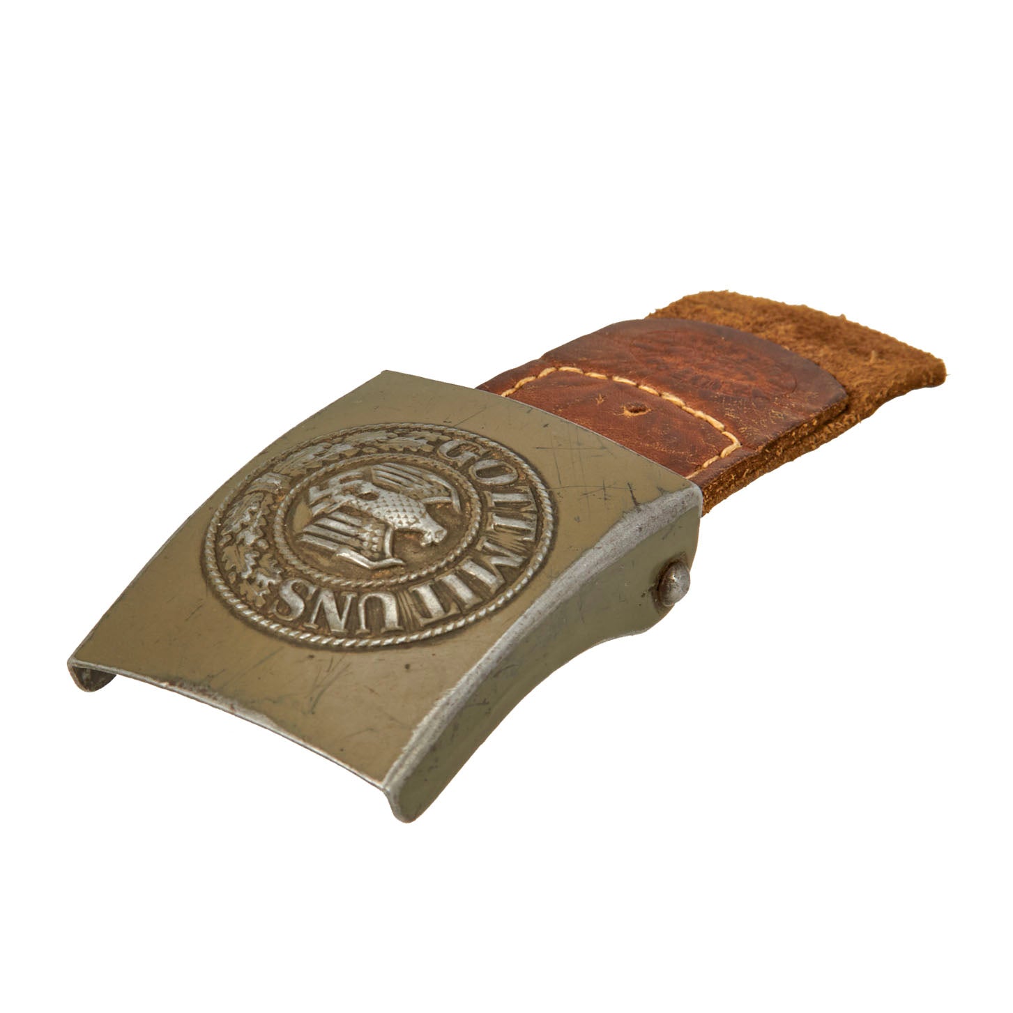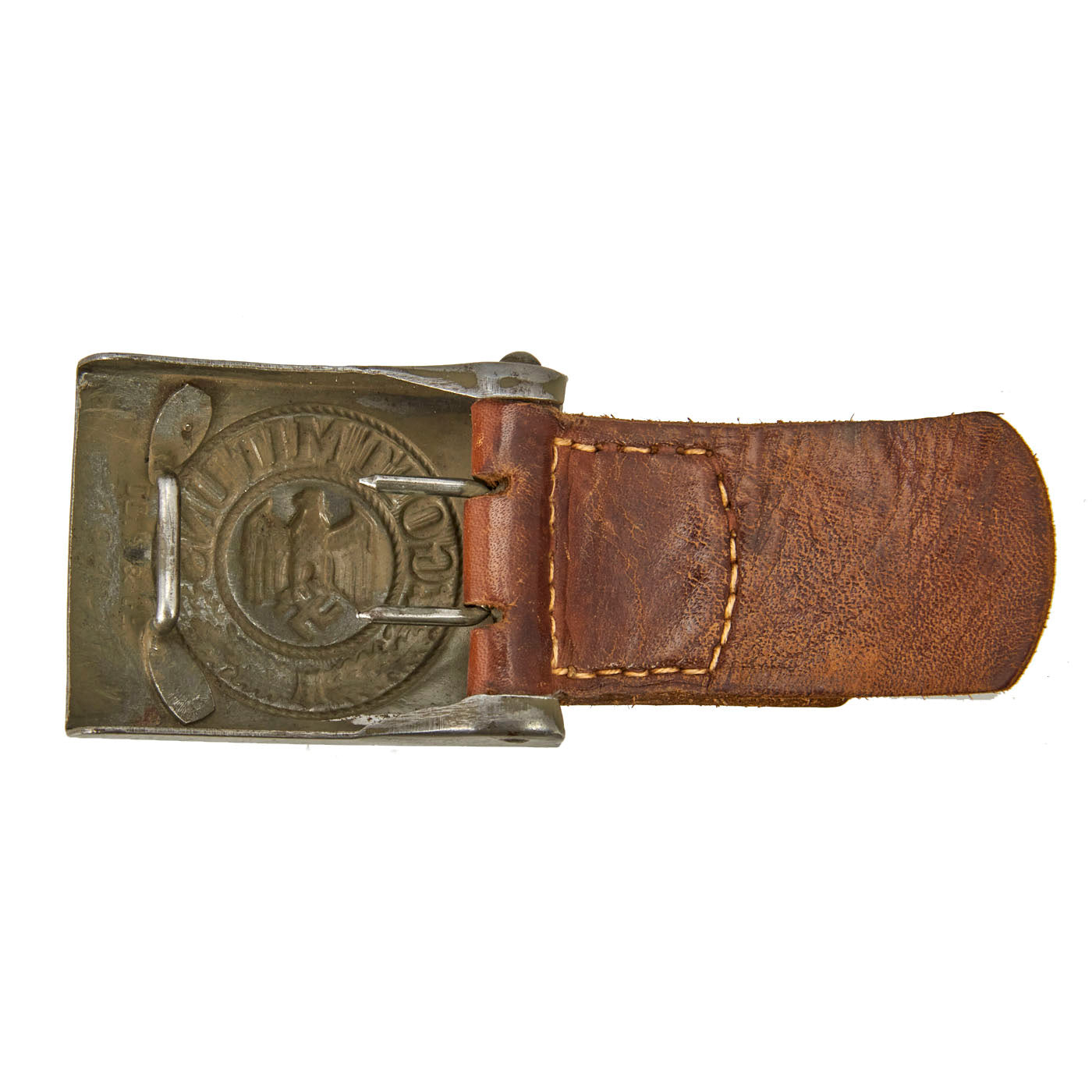 Normally made of aluminum which is injected molded, the center of the buckle features the Wehrmacht Eagle with down swept wings clutching a swas. The eagle is encircled with an inner and outer simulated twisted rope border between which is an embossed oak leaf cluster on the bottom. On the top is the script “Gott Mit Uns”, (God With Us).