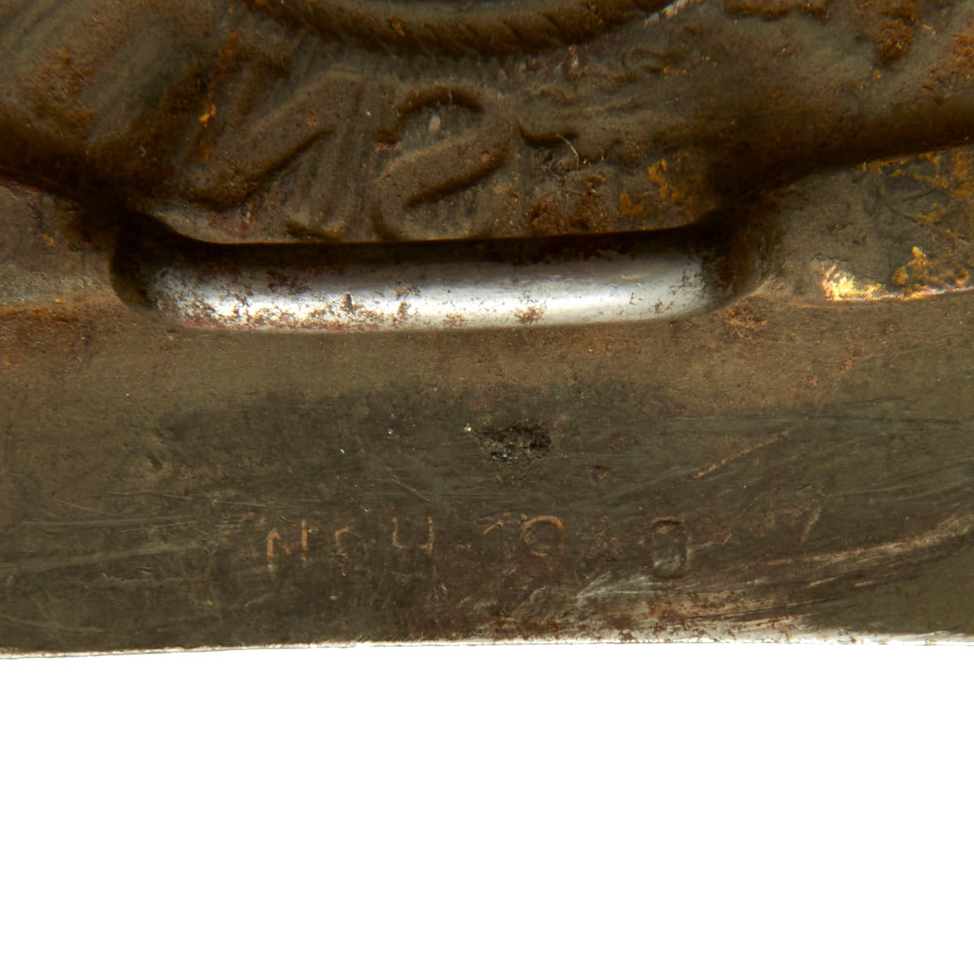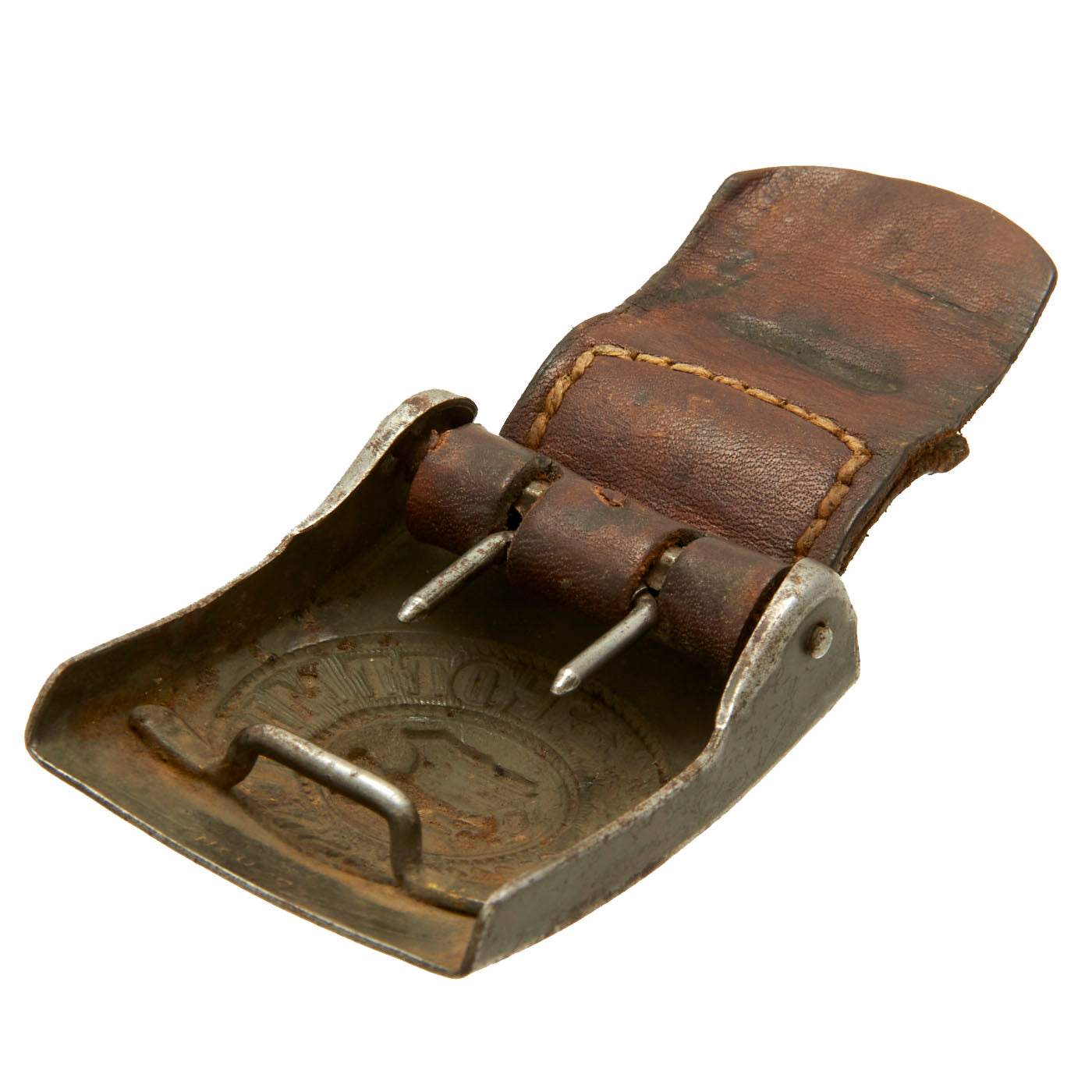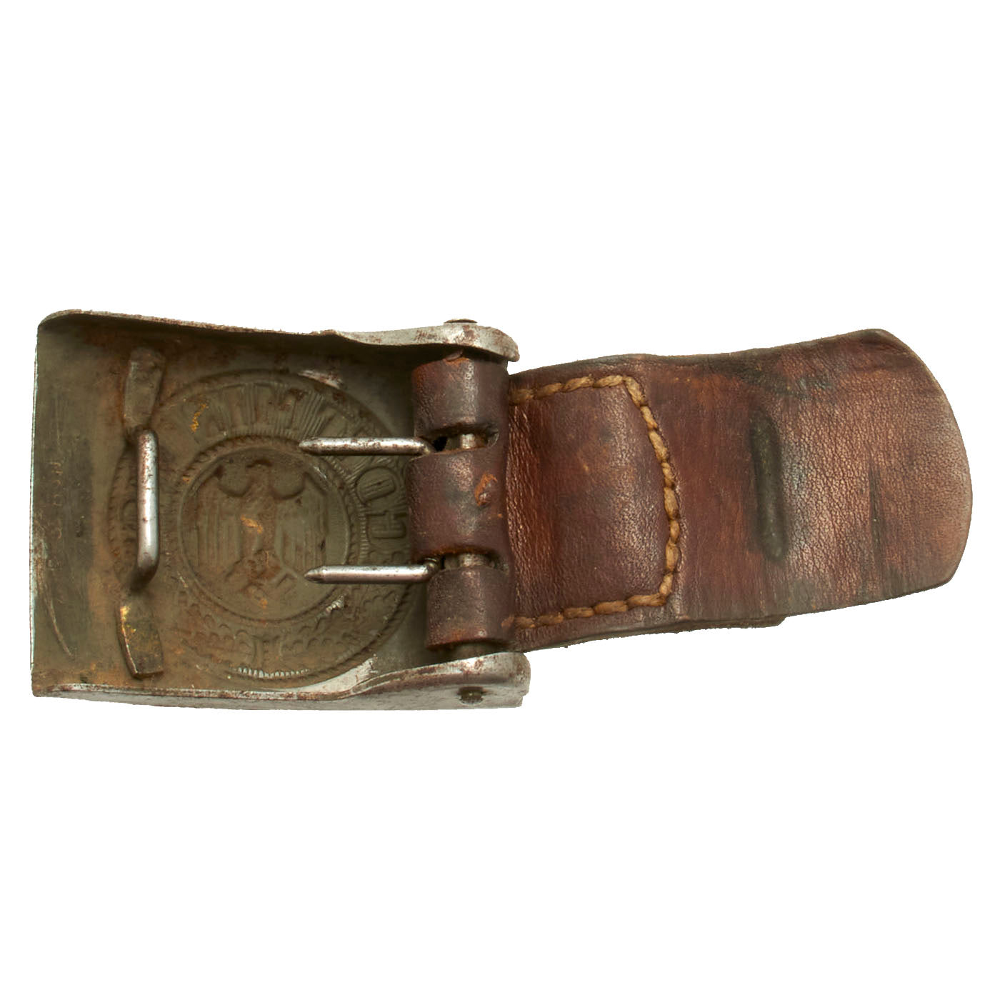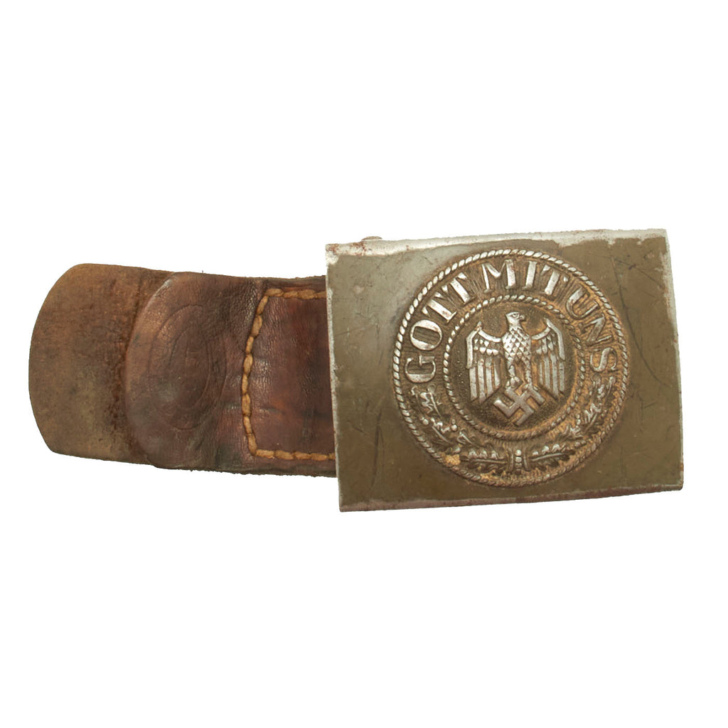 Original Item: Only One Available. This is an excellent worn condition WWII German Wehrmacht Heer (Army) EM/NCO's Steel Buckle (Koppelschloß). The buckle is embossed with the Heer motto GOTT MIT UNS ("God with us") surrounding a NSDAP Party Eagle. The buckle is a nice 1940 pattern fieldgrey painted steel construction box buckle with a smooth background. The paint is present on over 80% of the buckle exterior, with just a bit of storage wear. Truly an excellent example.