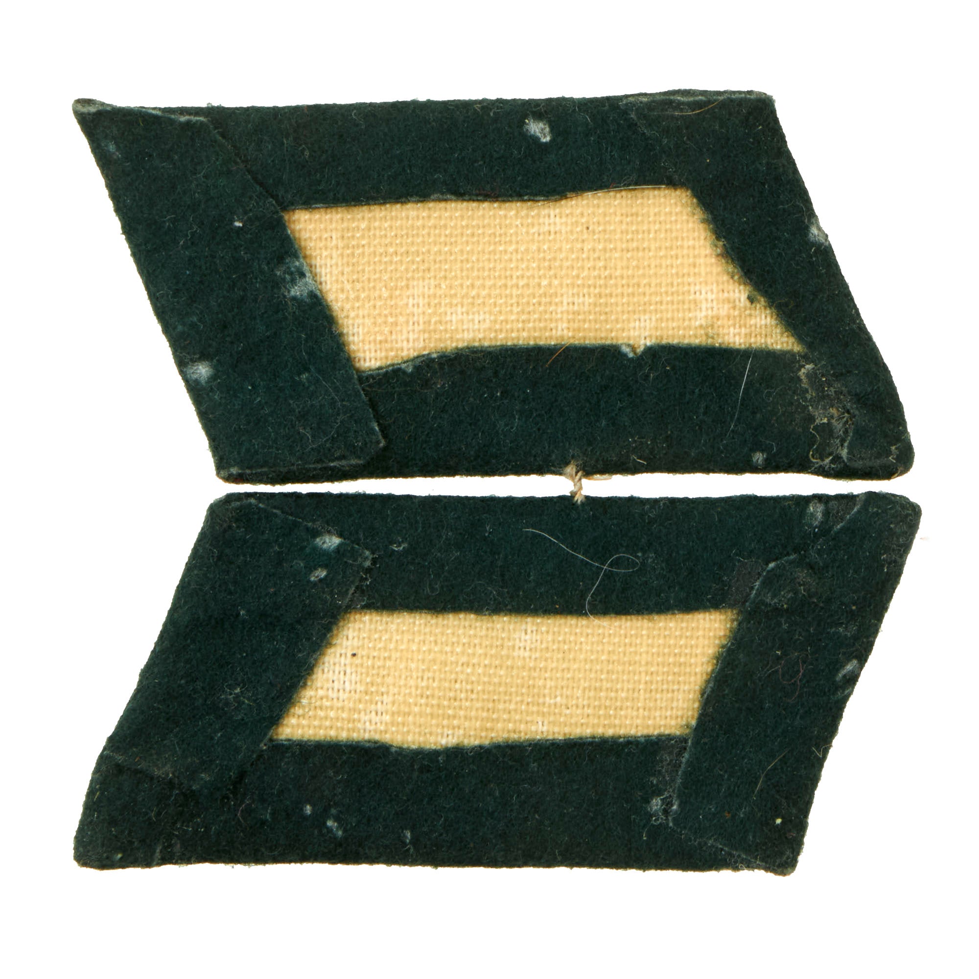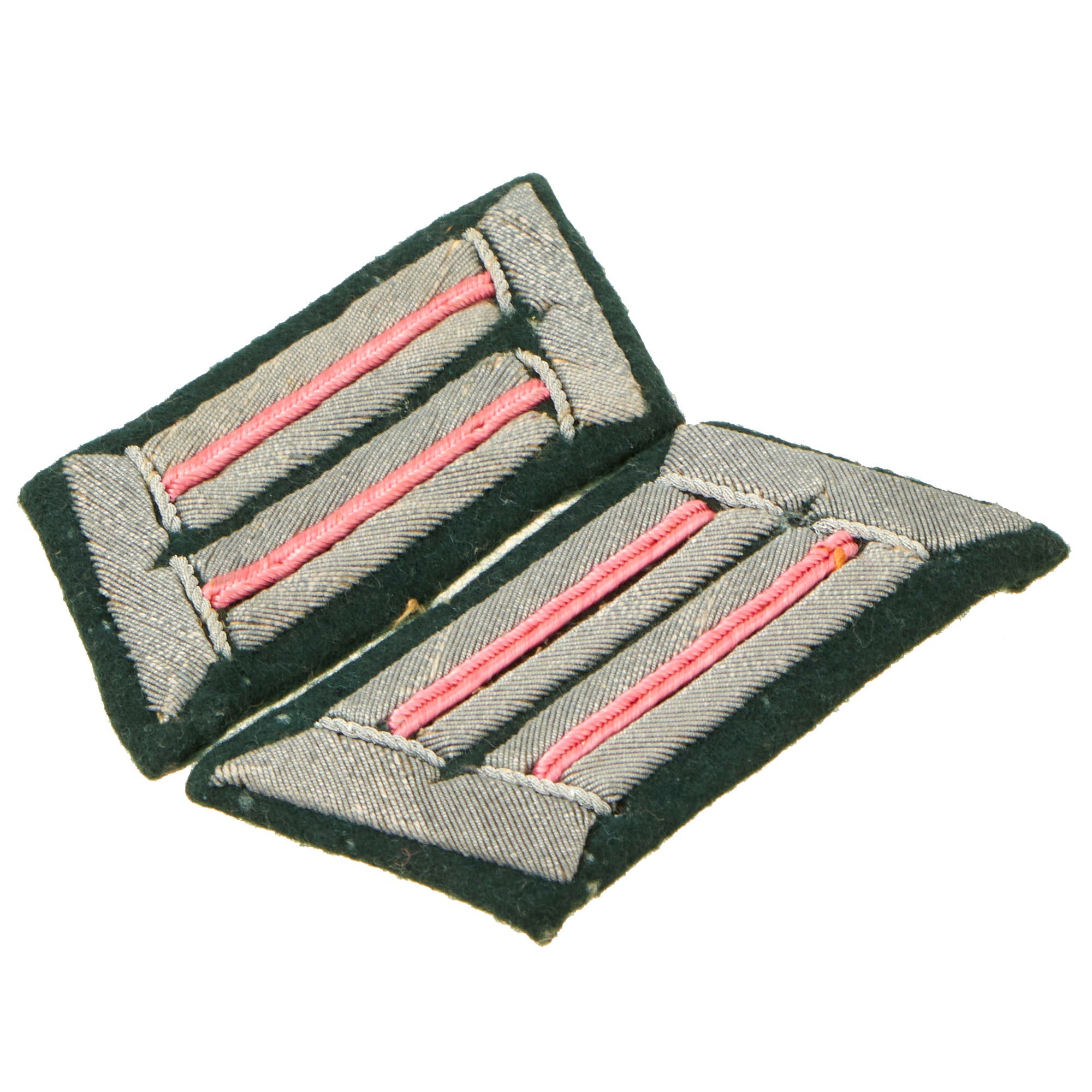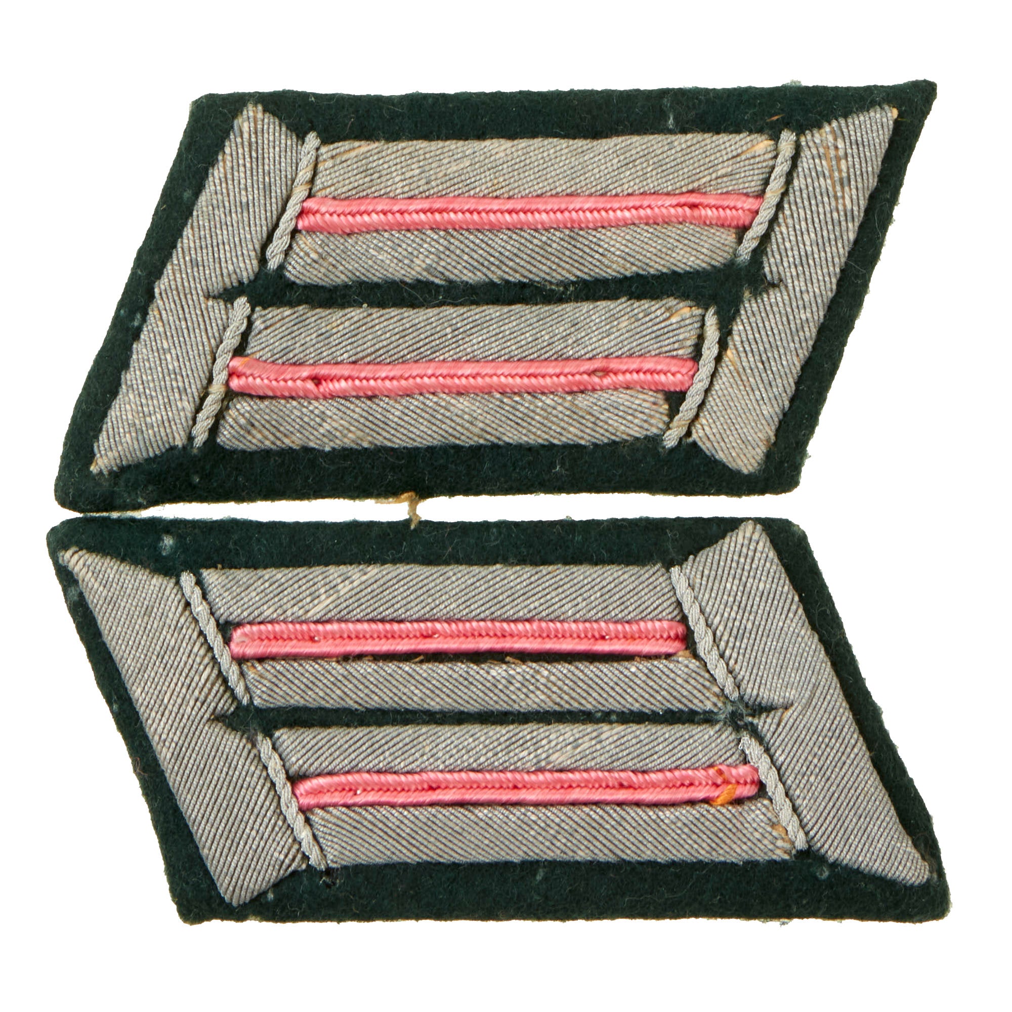 - One PAIR (left and right) of Heer Army Panzer Stabsoffiziere (Staff or Senior Officer) Collar Tabs / Patches. Known as Kragenpatte in German, these were attached to the collars to indicate the rank and branch of the wearer. These have two parallel bullion Litzenspiegel on the flaschengrün (dark bottle-green) backing, symbolizing the double braid of the 19th century. Each of these has a rose pink Mittelstreifen (median strip), the correct Waffenfarbe (Corps Color) for armored troops and tank destroyers.