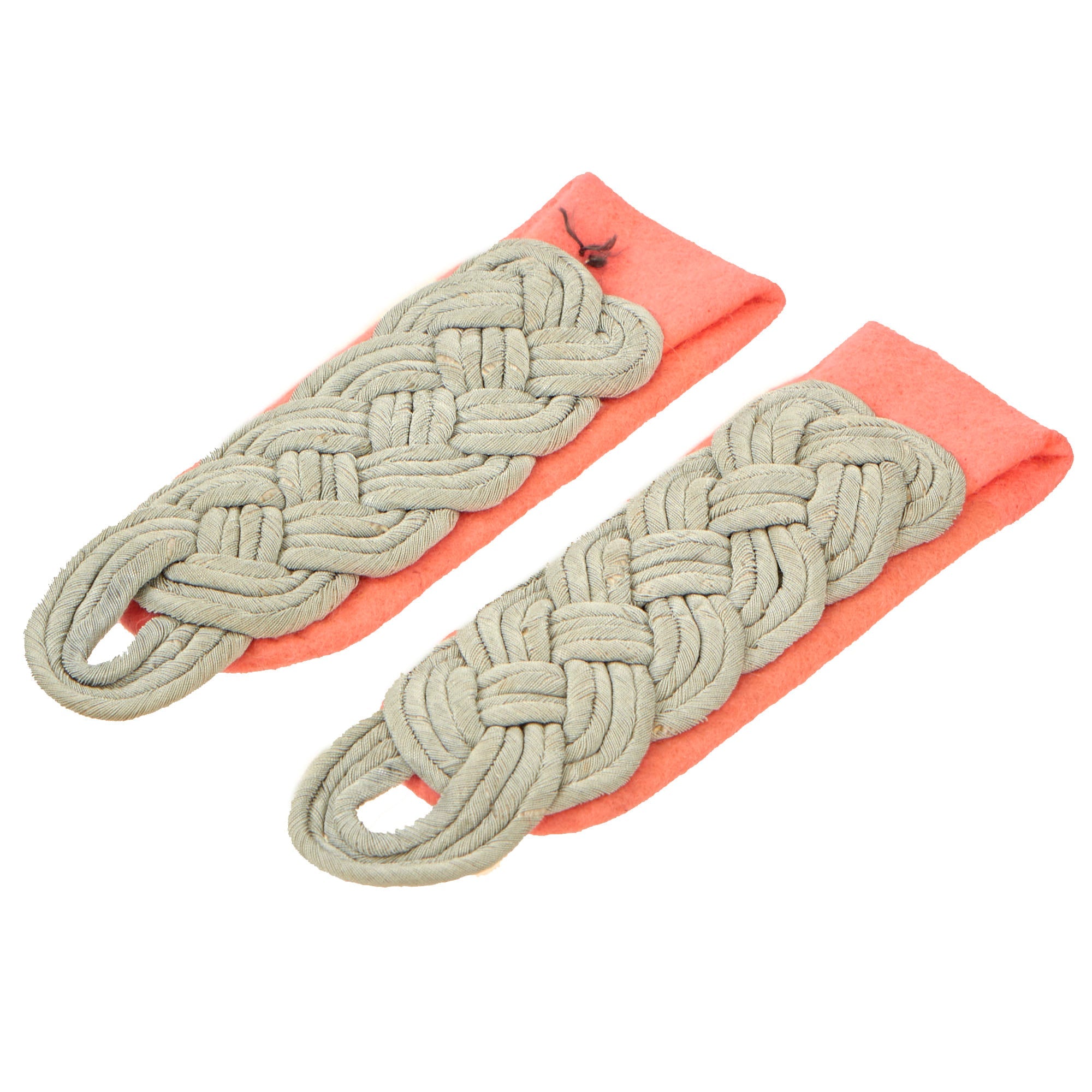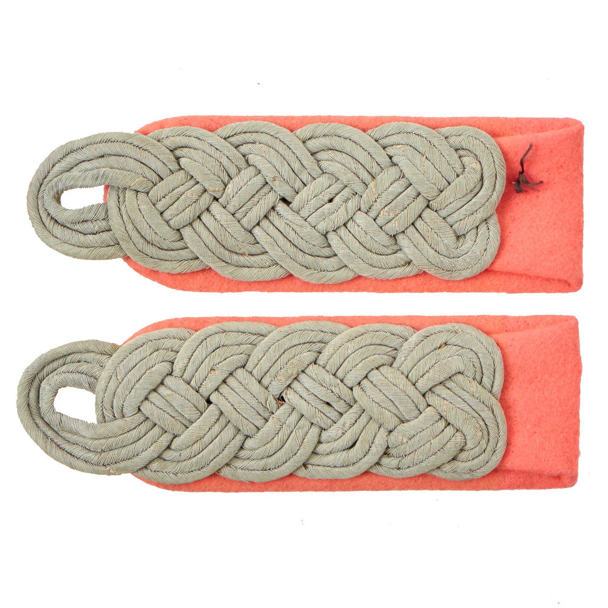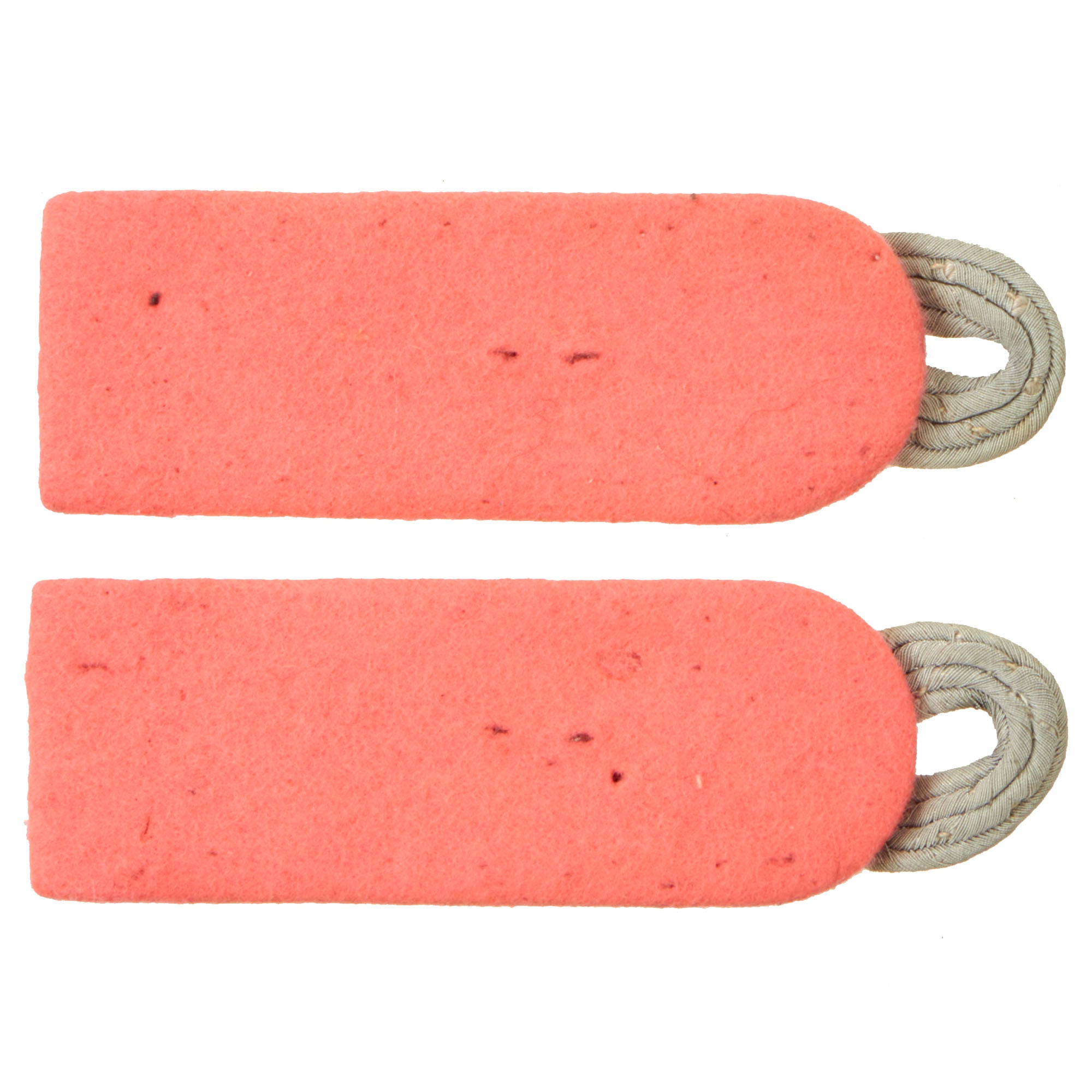 - One PAIR of Heer Army Panzer Stabsoffizier schulterklappen (Field-grade Officer shoulder boards), constructed with two rows of fine silver flatware "Russia Braid" double piping, which are plaited together to form a loop around the buttonhole. They are in very good condition, and do not have any rank "pips" installed, indicating the lowest staff officer rank of Major, equivalent to the same rank in the U.S. and U.K. armies. The have Rosa (Rose-pink) felt fabric backing, which shows around the entire perimeter, the correct Waffenfarbe (Corps Color) during WWII for Panzer (Armored Troops) and Panzerjäger (Tank Destroyers).