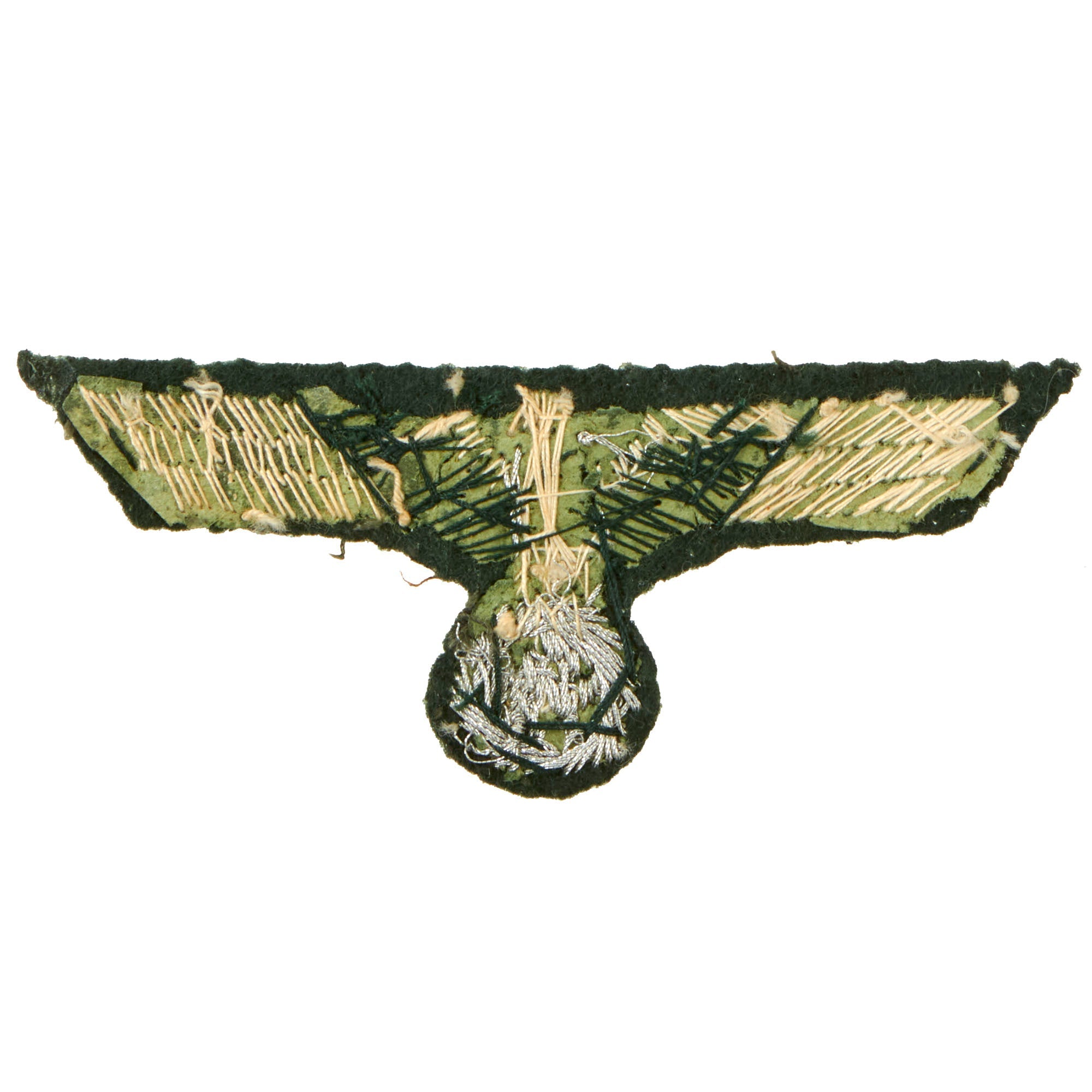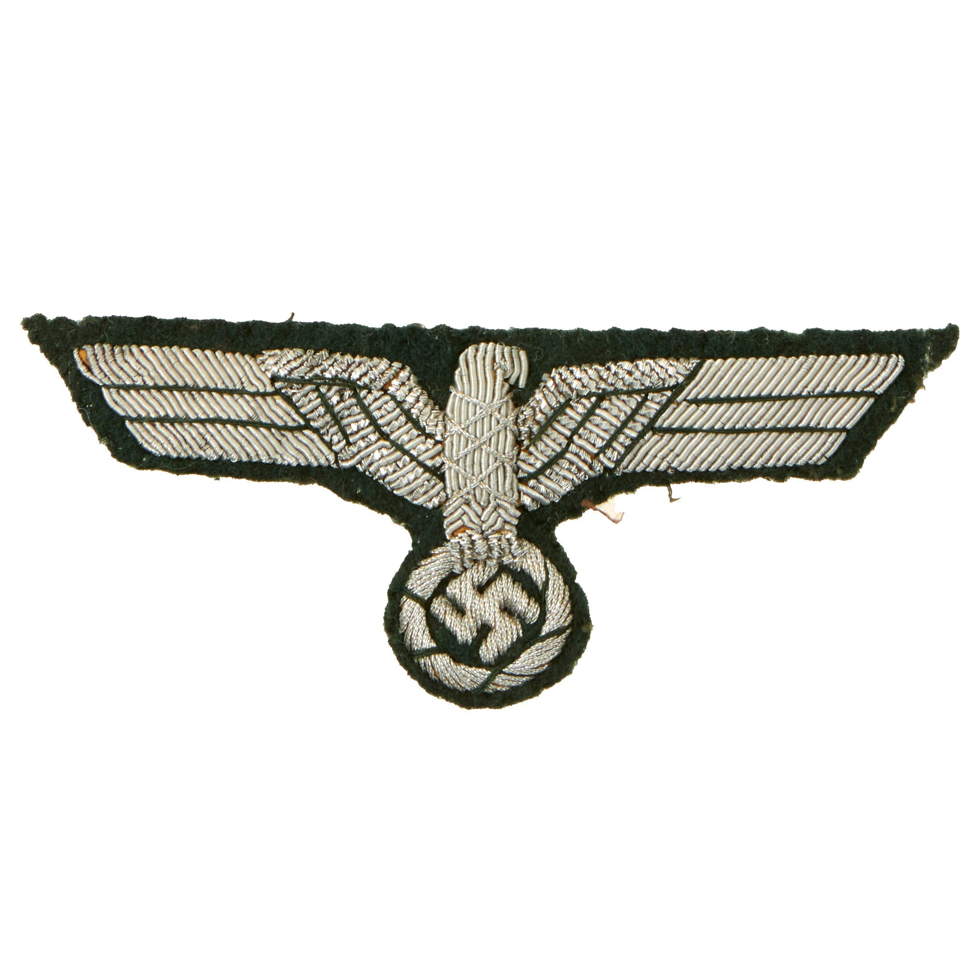 - One Silver Bullion Hand Embroidered Wehrmachtsadler (Armed Forces Eagle) breast eagle. It is the early pattern type, with a flaschengrün (dark bottle-green) "badge cloth" backing.