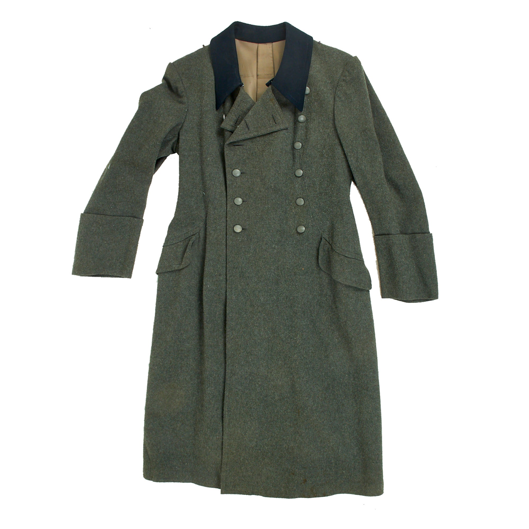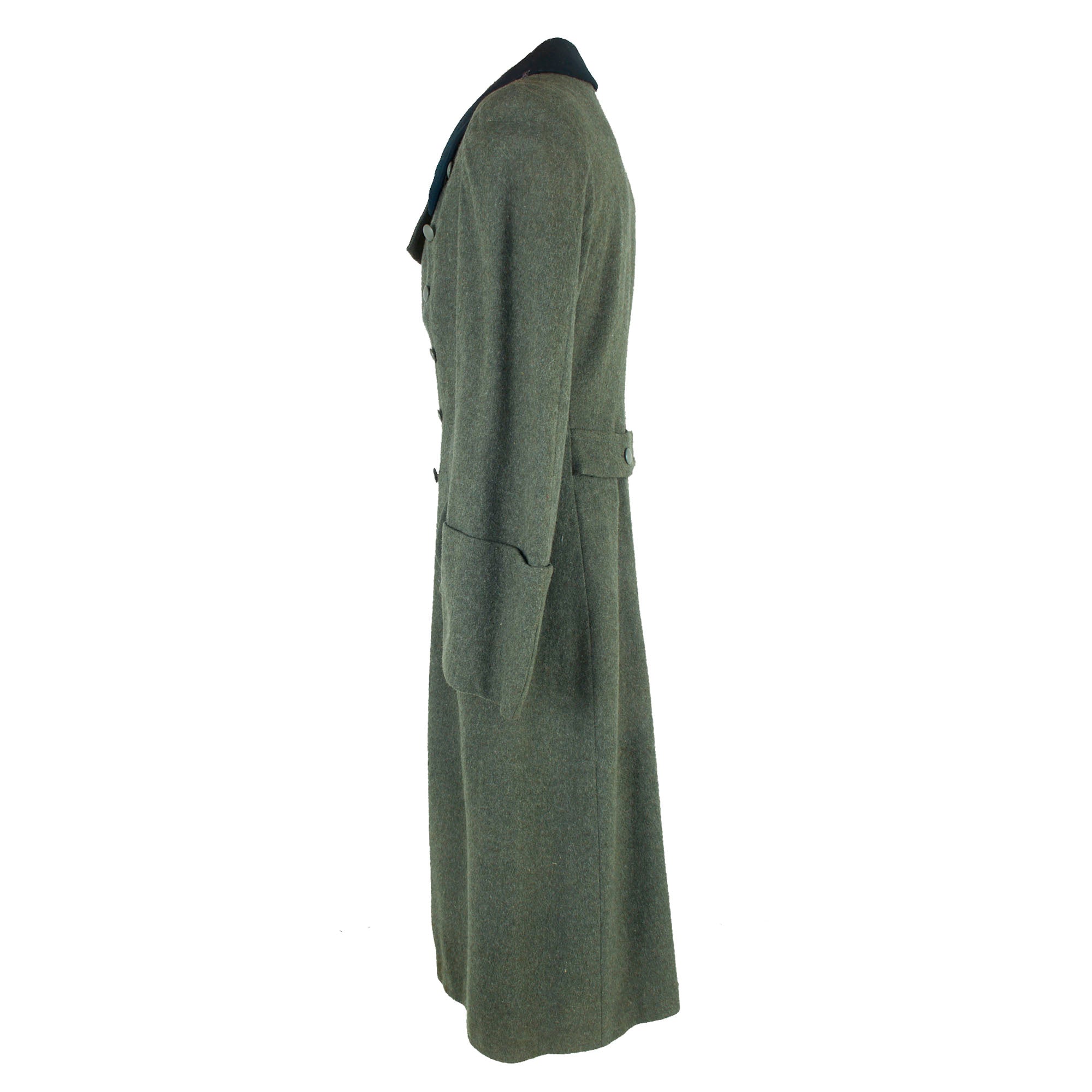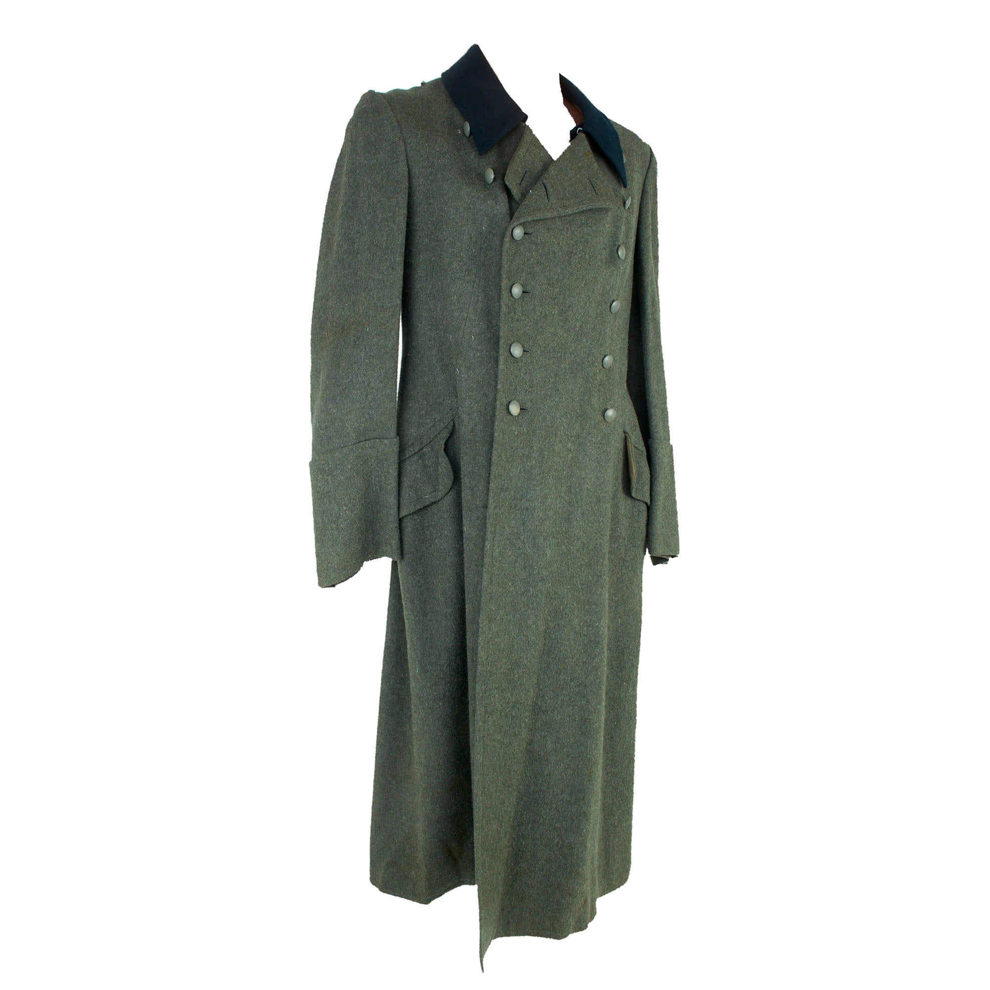 Original Item: Only One Available. This is a lovely lightly used German WWII Heer Infantry Officers great coat or overcoat, constructed with an outer shell of heavy feldgrau (field gray) "doe skin" weave wool. These were preferred during the cold months, and have an unmistakable silhouette. The interior of the great coat is fully lined with lovely light green / brown rayon, and is in very good service used condition, showing wear commensurate with light to moderate service. There is slash pocket on the inner left chest, and also the slot that exits under one of the exterior pockets for a dagger, so this is most likely a greatcoat intended for an officer. We checked all the pockets and usual spots, however we were not able to locate any maker information for the coat, which is almost certainly bespoke.