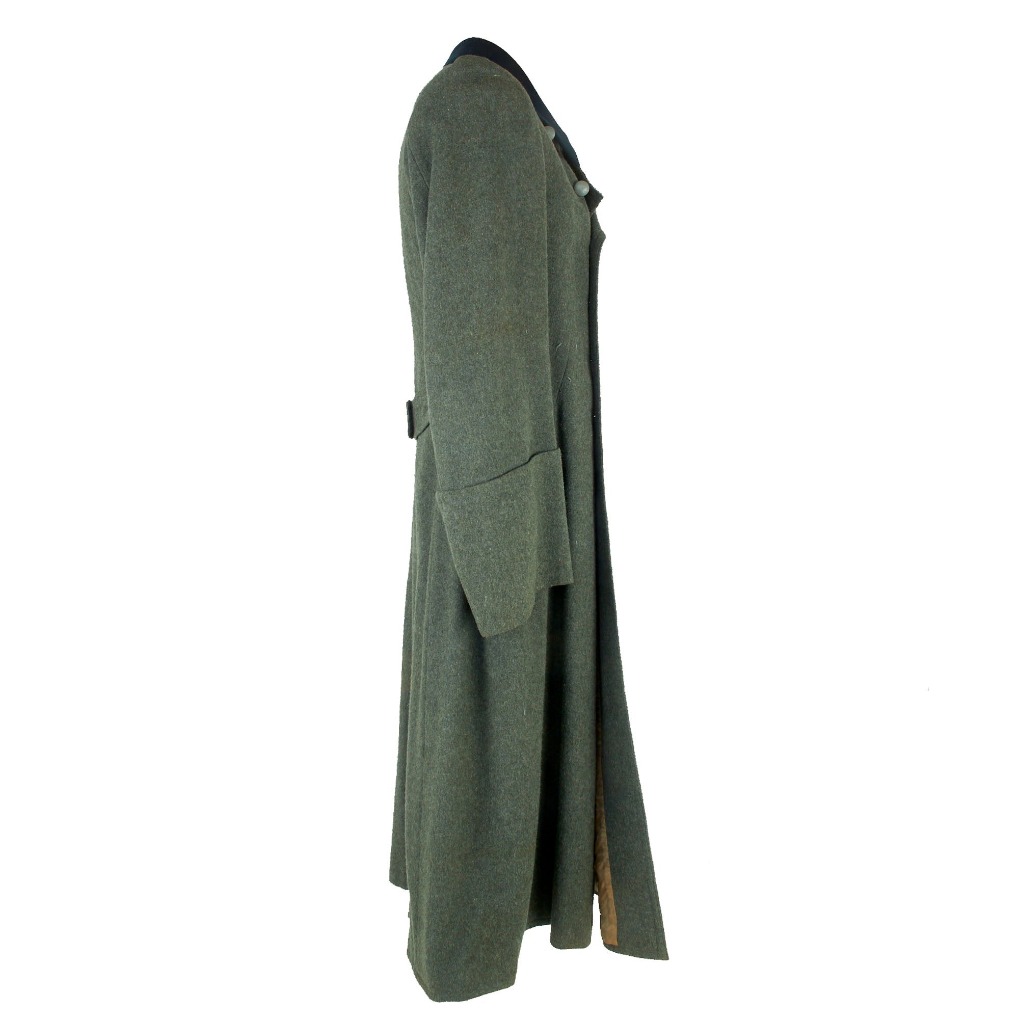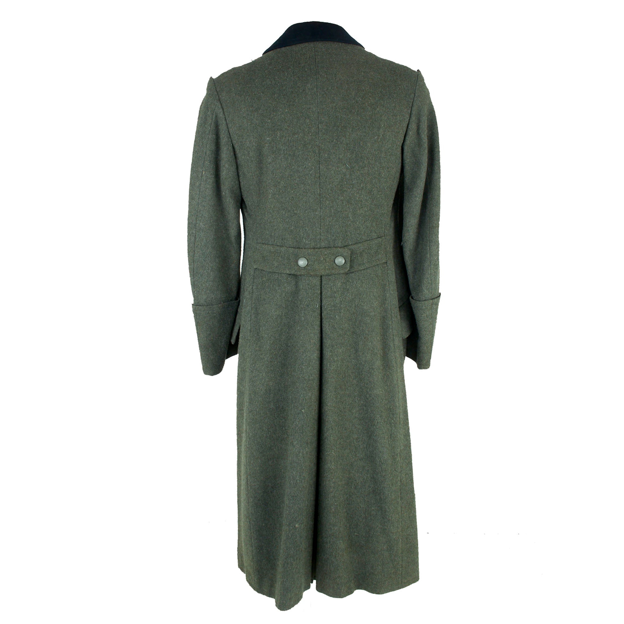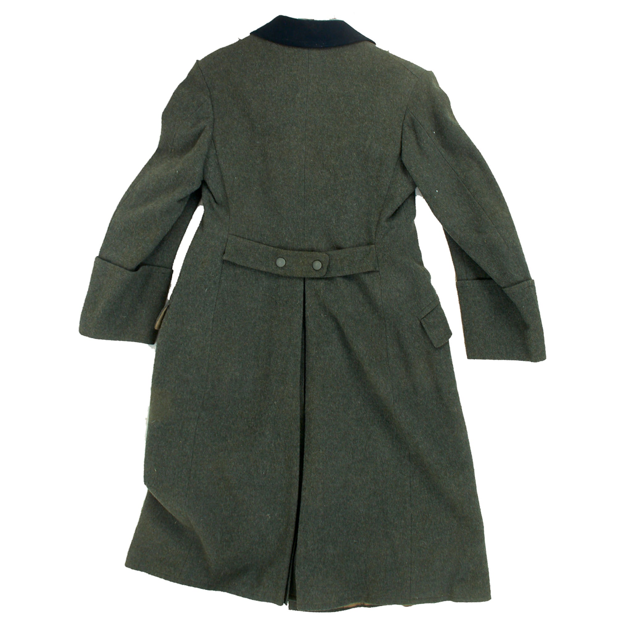 Original Item: Only One Available. This is a lovely lightly used German WWII Heer Infantry Officers great coat or overcoat, constructed with an outer shell of heavy feldgrau (field gray) "doe skin" weave wool. These were preferred during the cold months, and have an unmistakable silhouette. The interior of the great coat is fully lined with lovely light green / brown rayon, and is in very good service used condition, showing wear commensurate with light to moderate service. There is slash pocket on the inner left chest, and also the slot that exits under one of the exterior pockets for a dagger, so this is most likely a greatcoat intended for an officer. We checked all the pockets and usual spots, however we were not able to locate any maker information for the coat, which is almost certainly bespoke.
