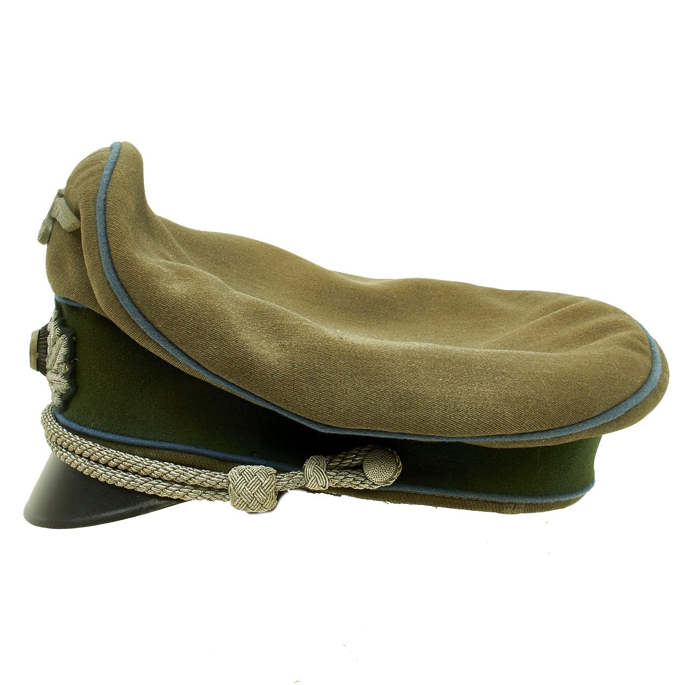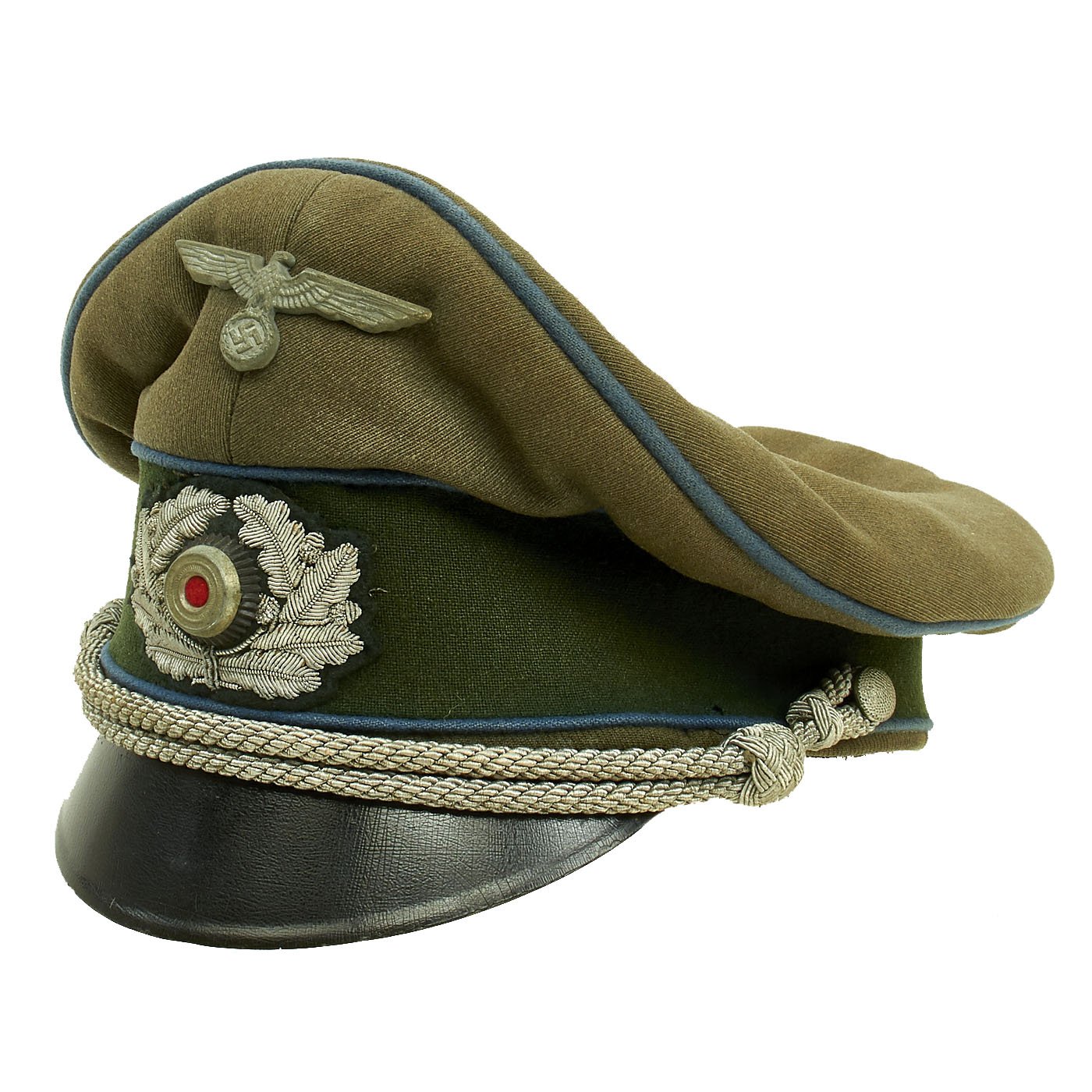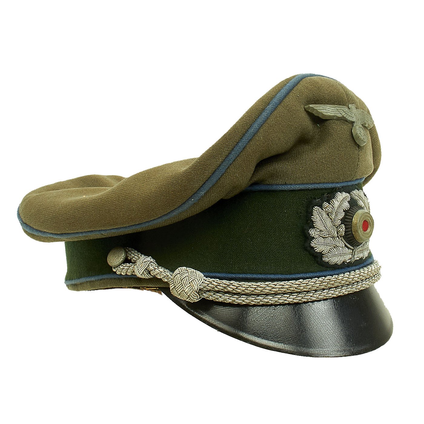 Original Item: Only One Available. This is a very good condition German WWII Military Administration Officer's Schirmmütze Visor Cap, with a lovely "Crushed" shape. This "saddle-form" shape is highly desirable, and is only achieved on caps with a lot of wear and service. The cap shows high quality fabrication, made with typical Heer army feldgrau (Field Gray) green / gray wool with a forest green band and a traditional high front, with matching Blau (Blue) piping along the top edge and flanking either side of the band, the Waffenfarbe (Corps Color) for Vehicle troops (Kraftfahrparktruppen) and the Supply troop (Nachschubtruppe).
